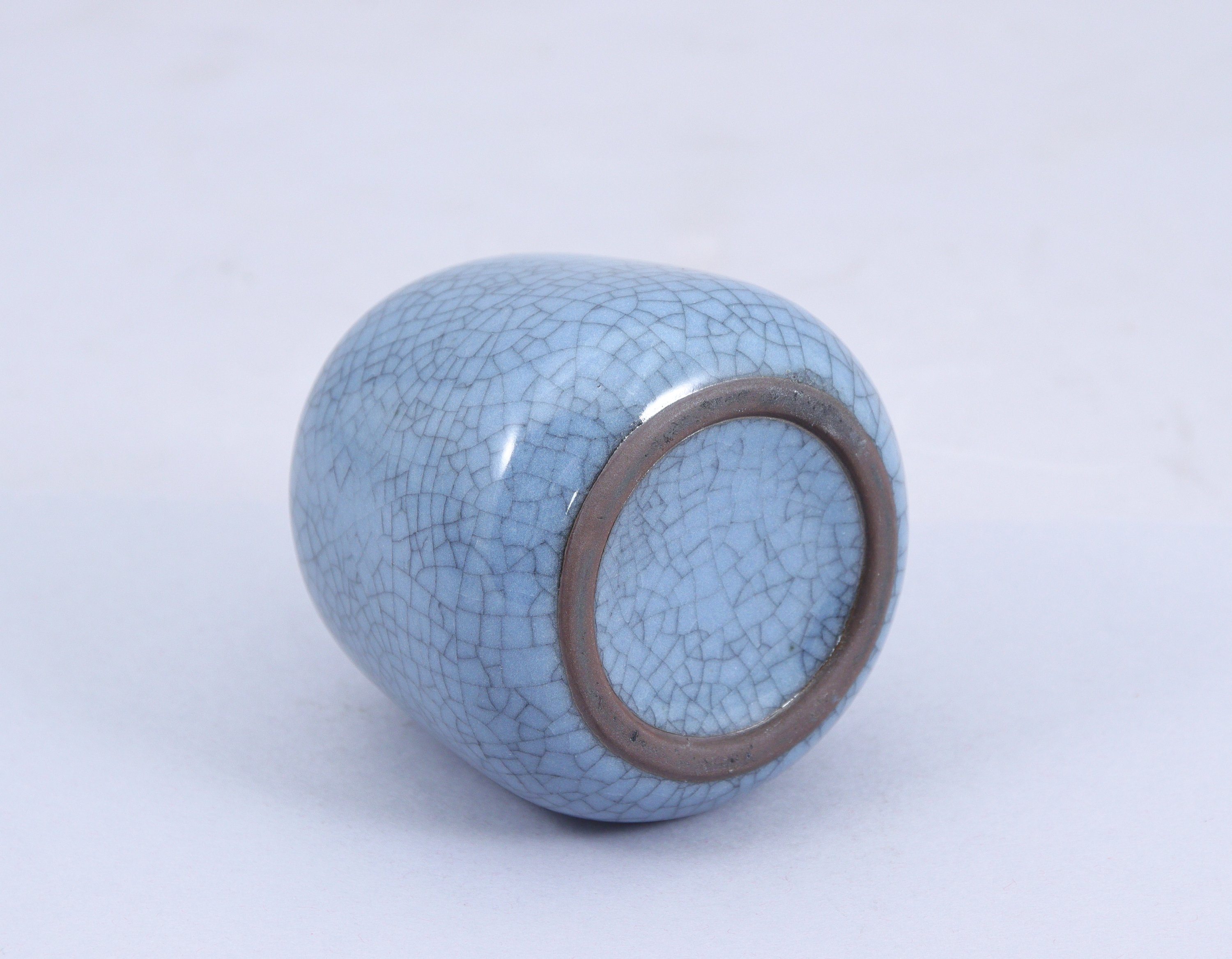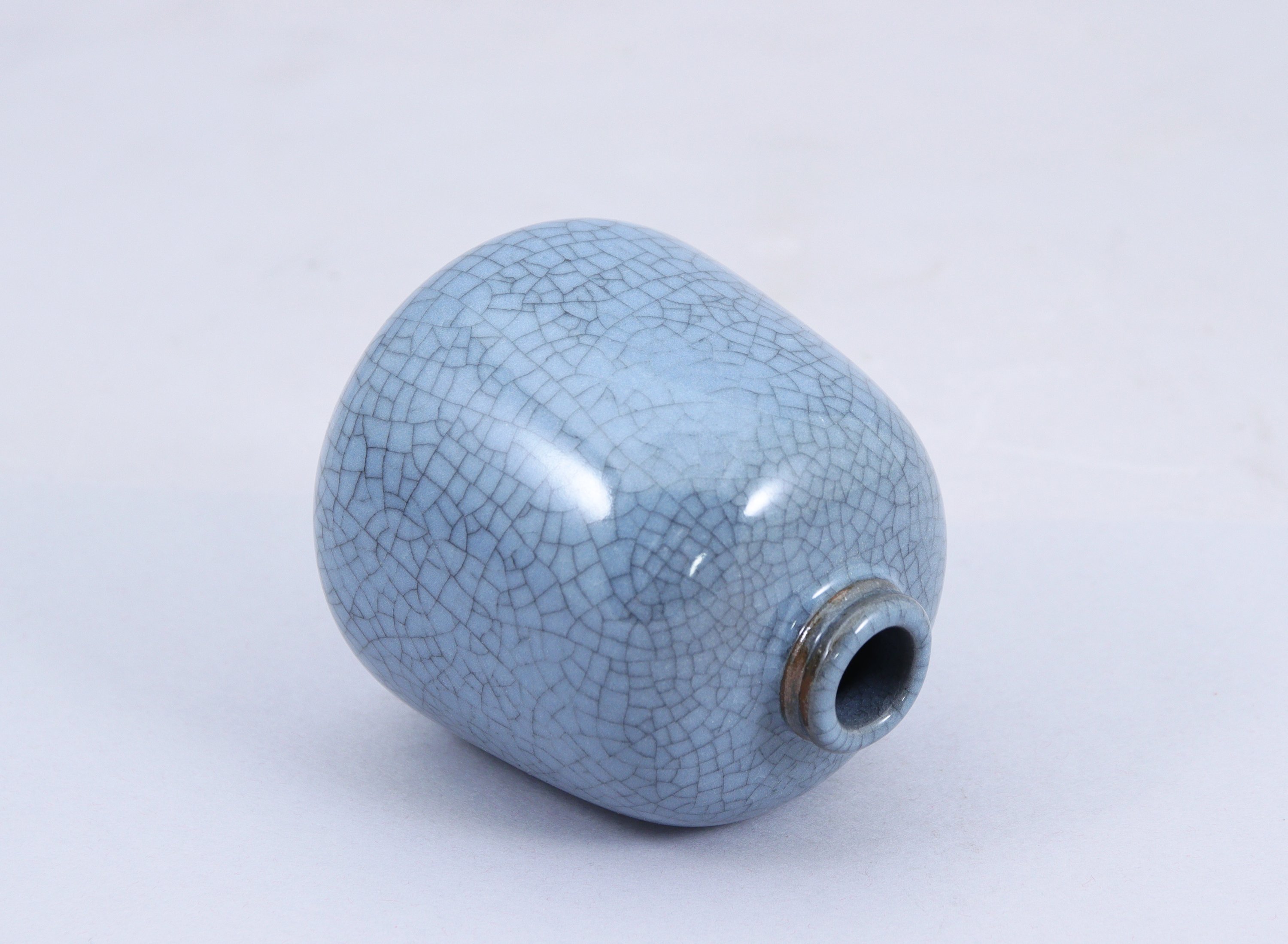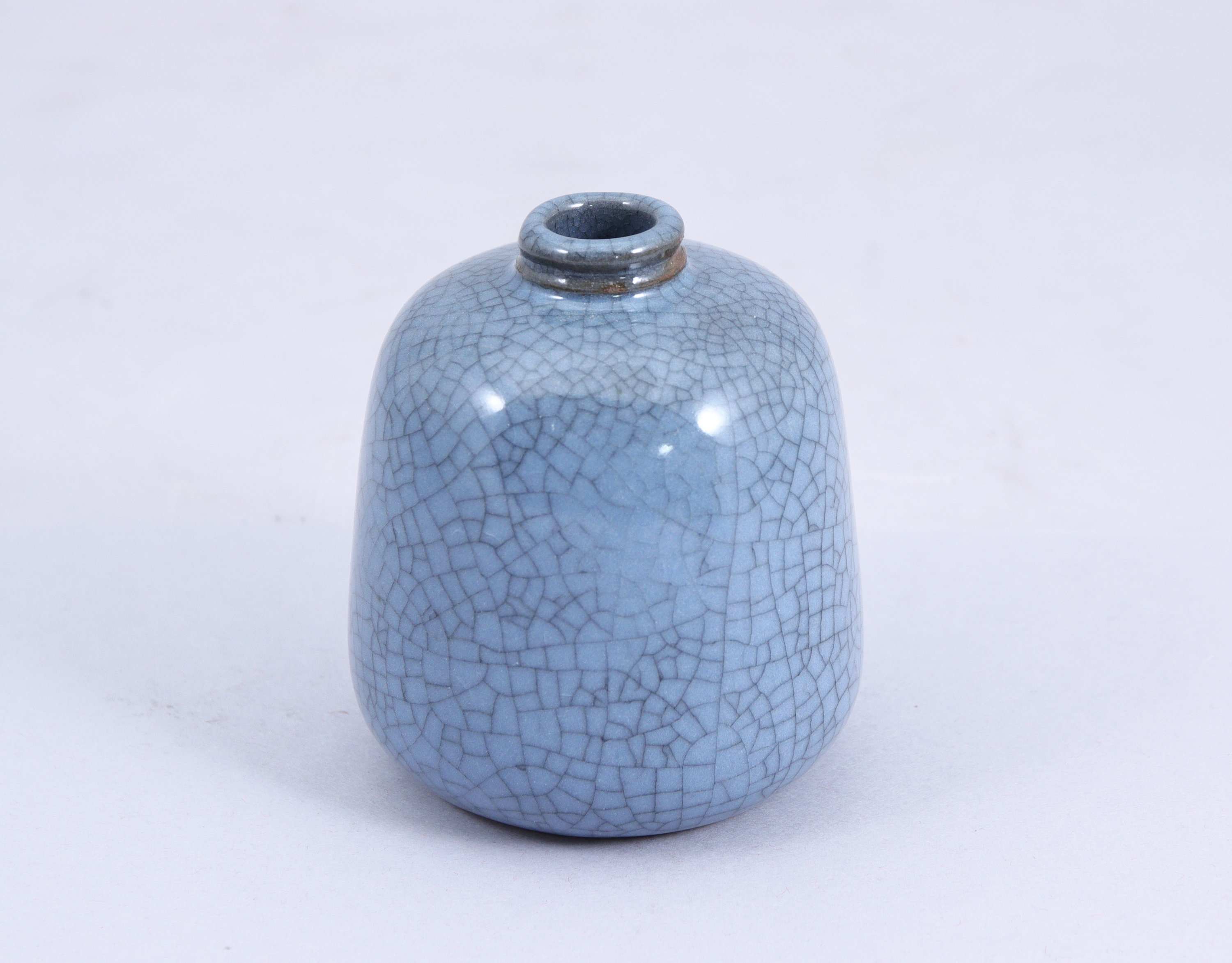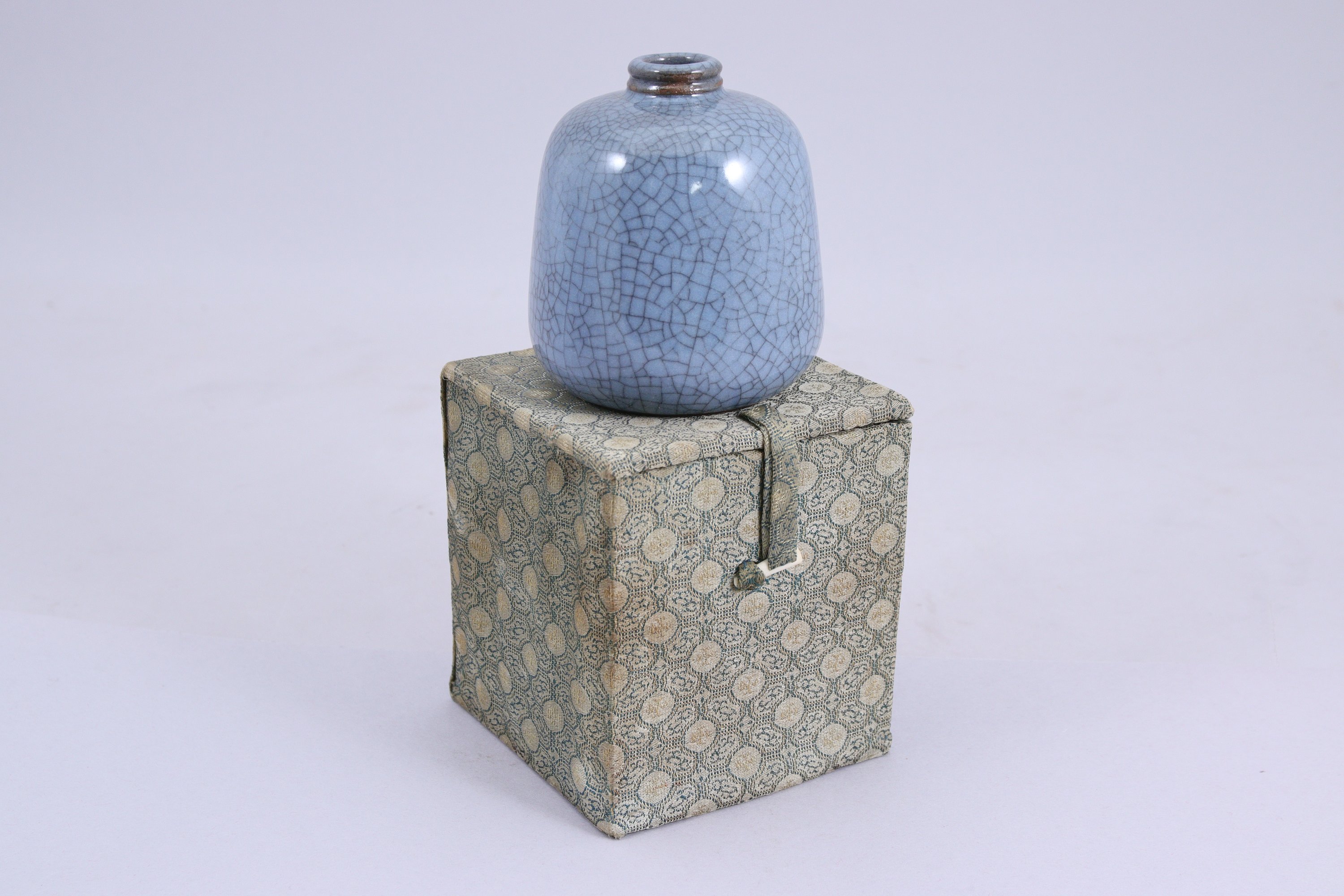 Joint: Chine, XXe siècle. Petit vase en céramique écaillée bleu lavande, dans un coffret en bois et tissu. Haut. 9,5 cm.