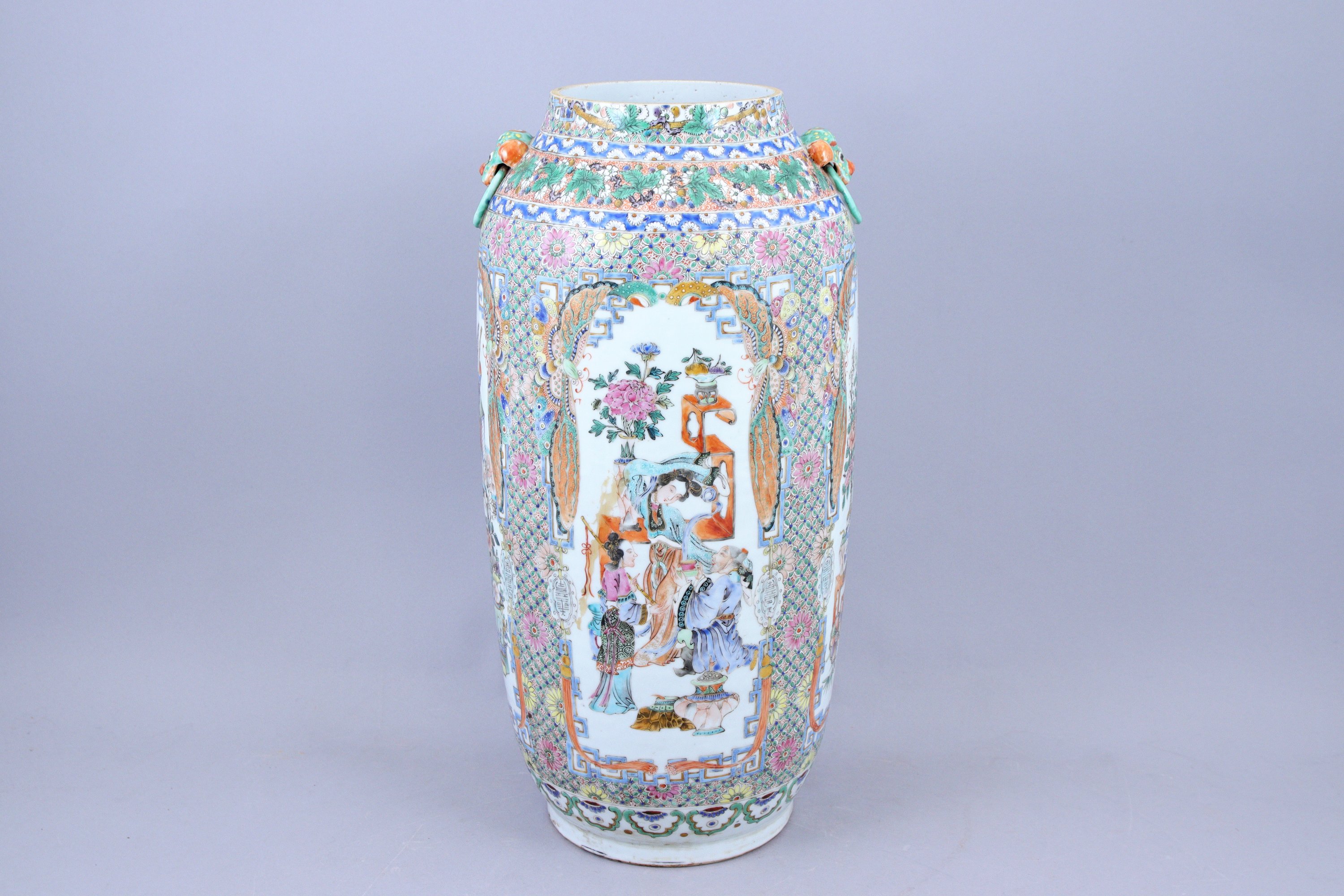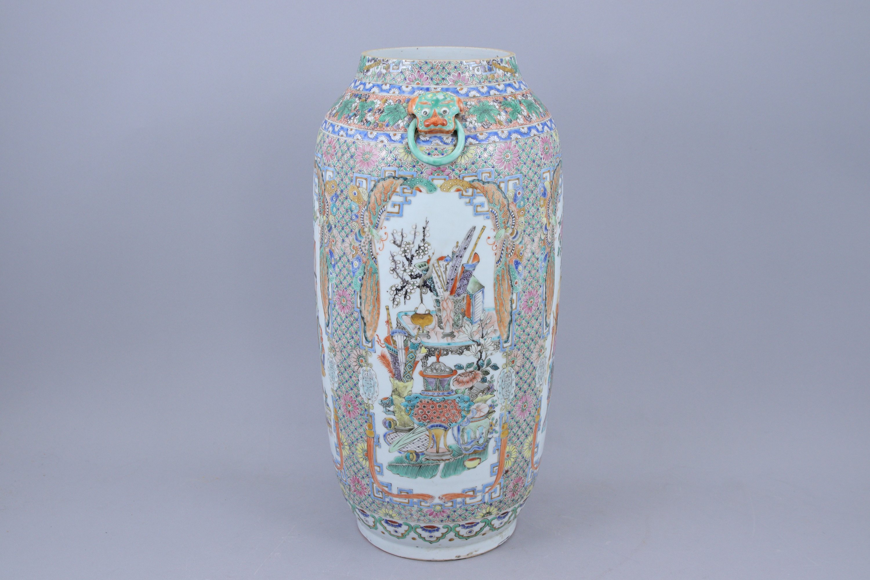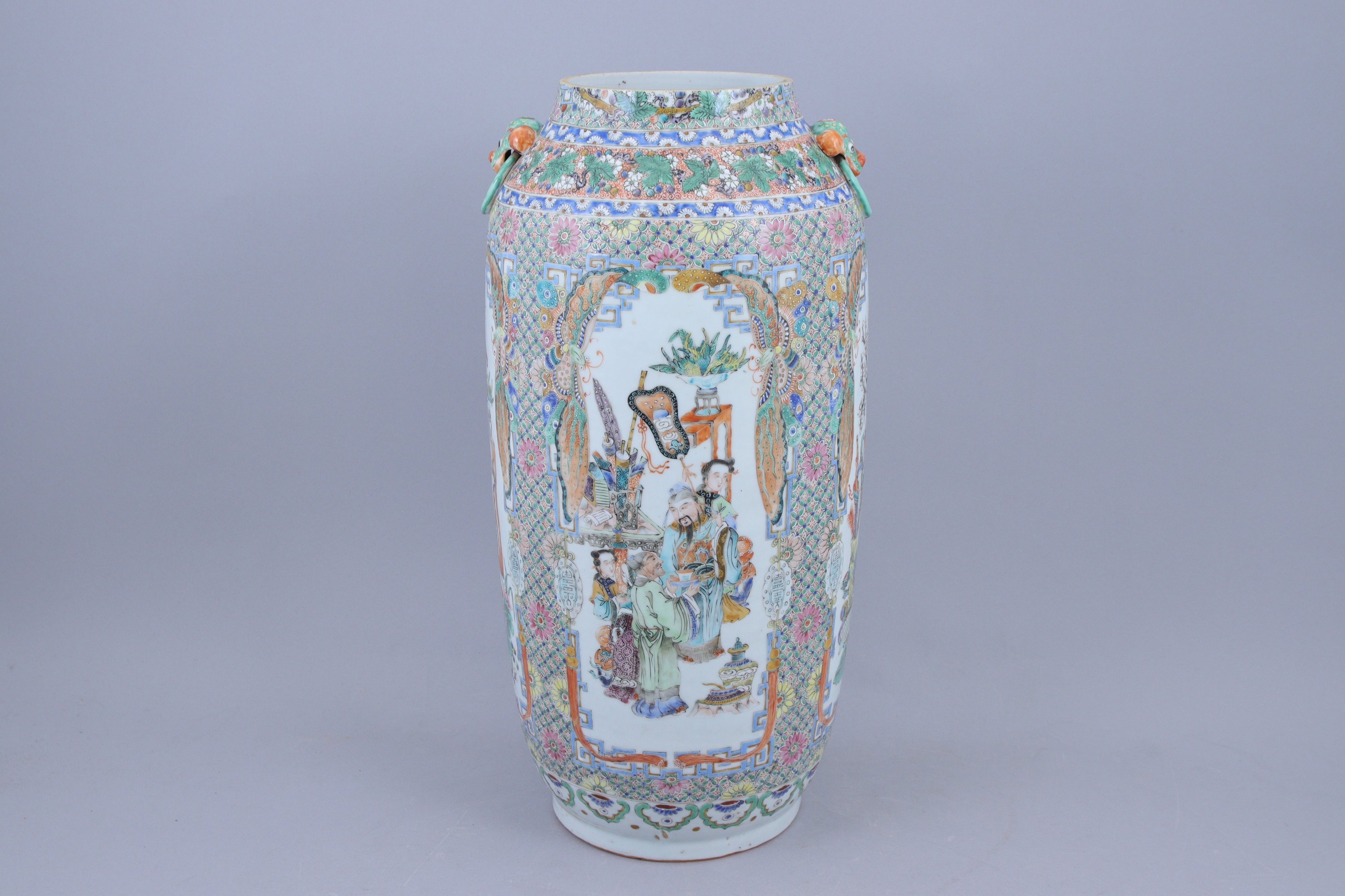en porcelaine émaillée polychrome à décor dans des réserves de sujets mobiliers et dignitaires et jeunes femmes alternés sur fond de fleurs. Deux anses en forme de têtes de lions supportant des anneaux.