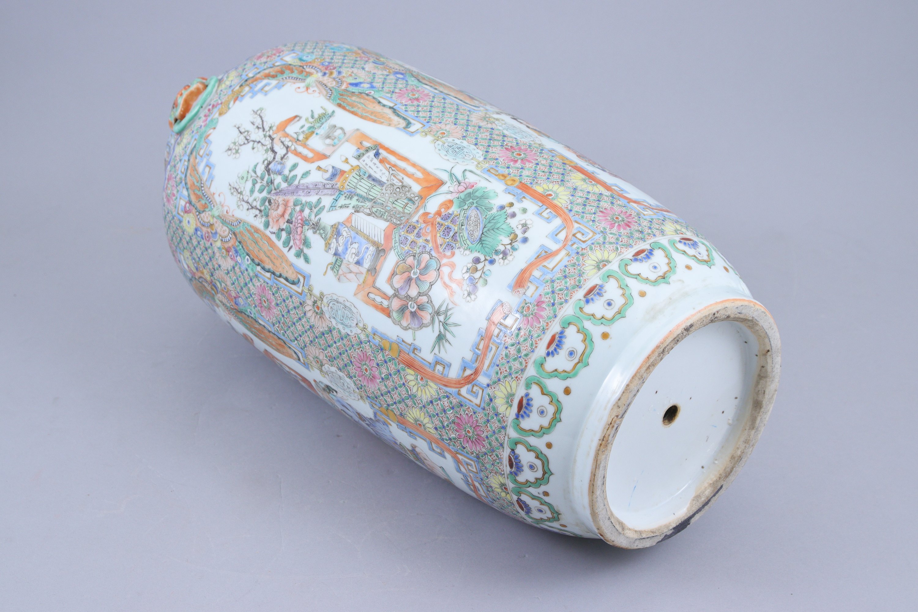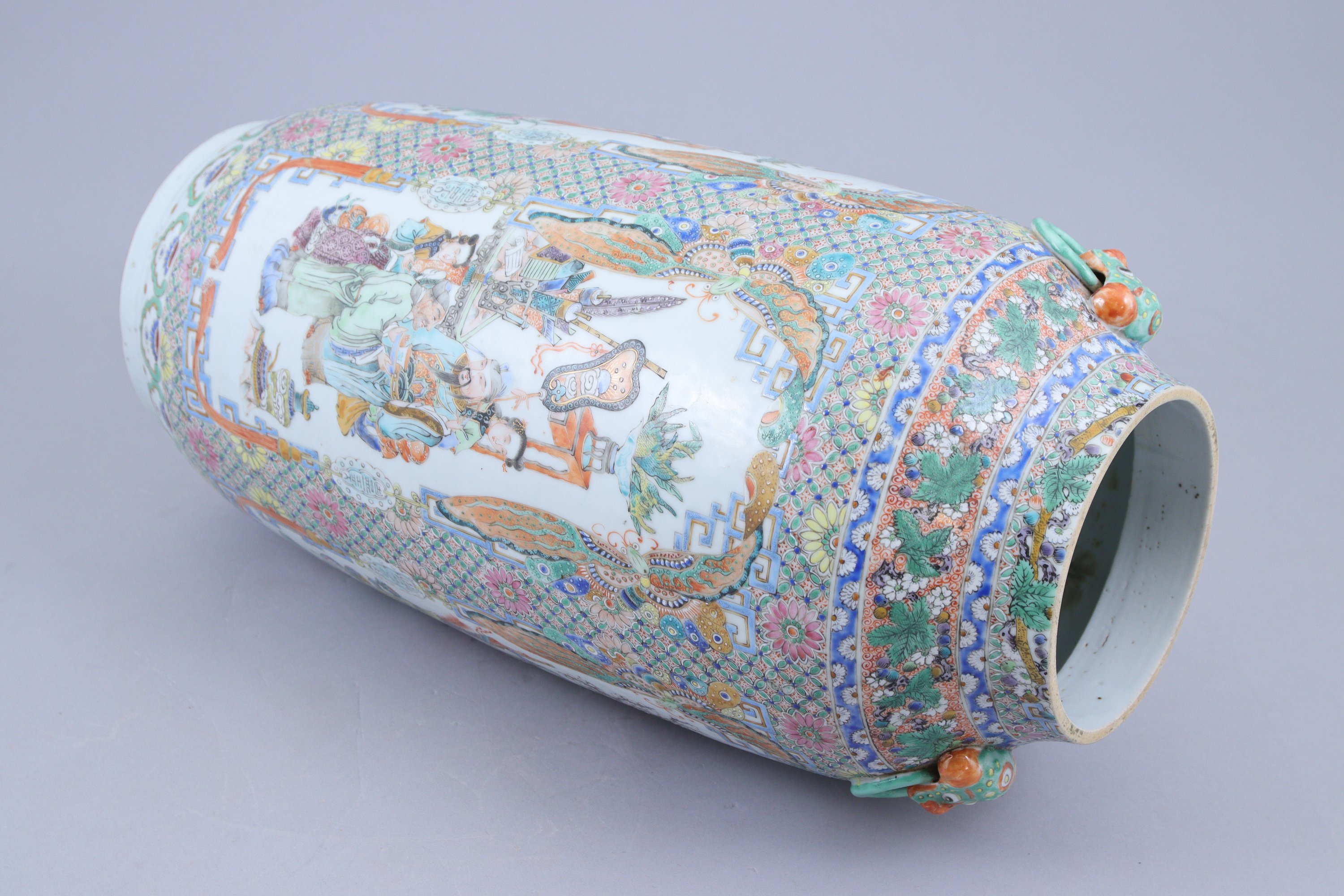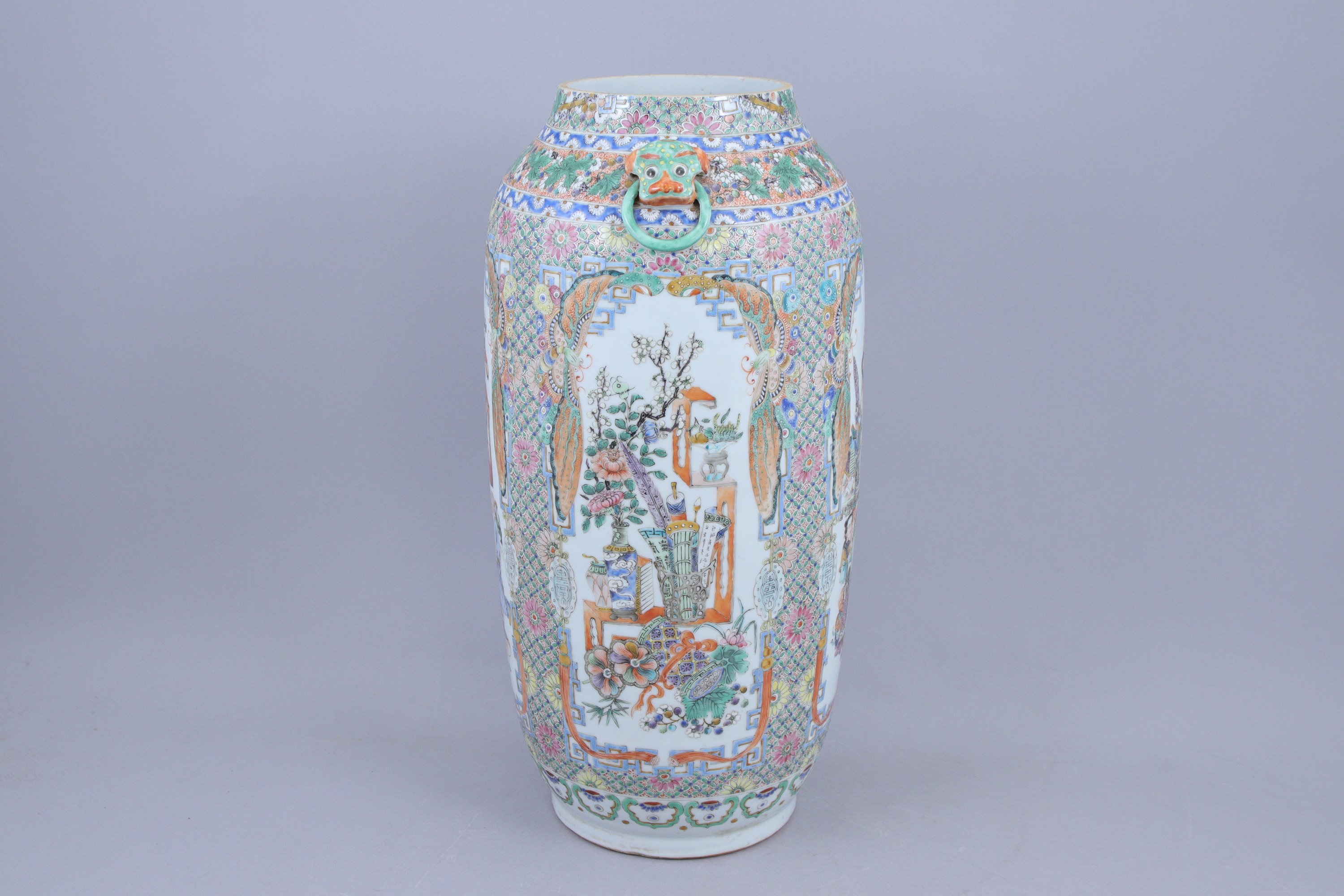 en porcelaine émaillée polychrome à décor dans des réserves de sujets mobiliers et dignitaires et jeunes femmes alternés sur fond de fleurs. Deux anses en forme de têtes de lions supportant des anneaux.