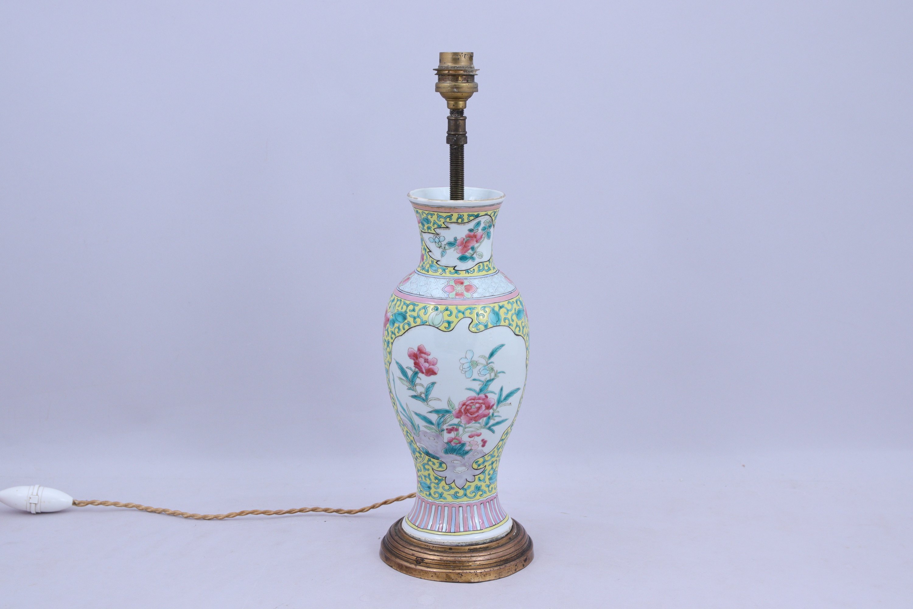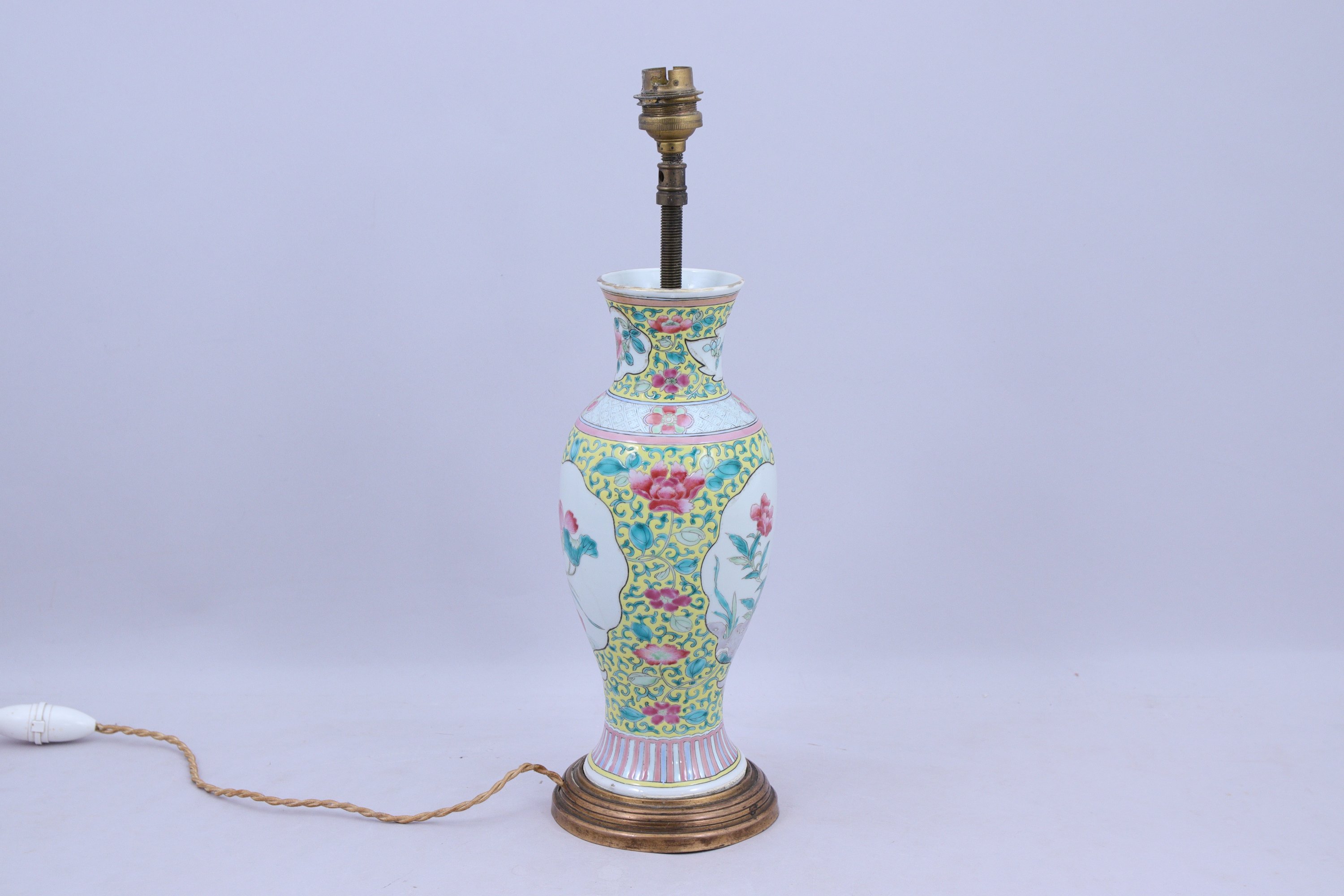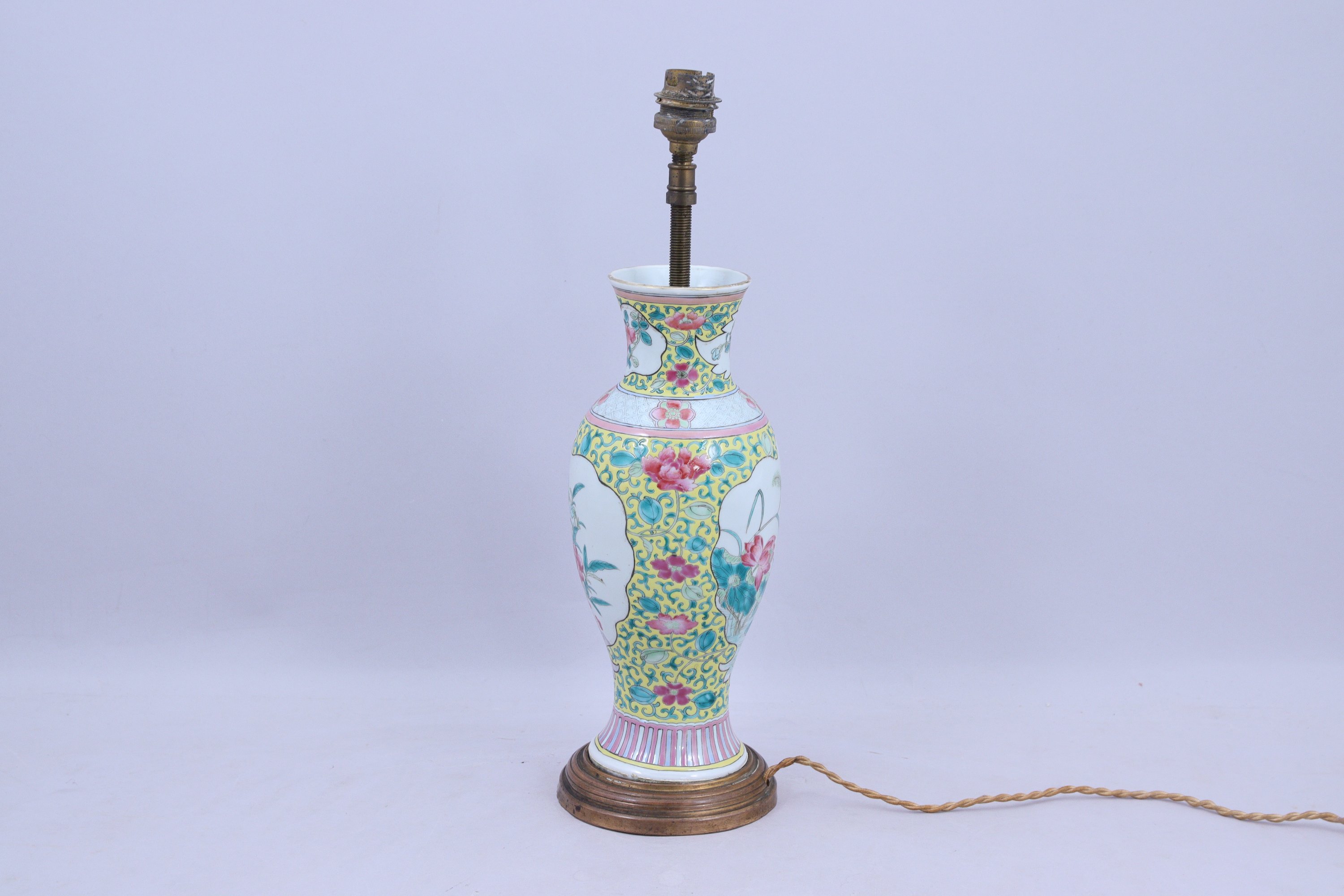 en porcelaine à décor de pivoines dans des cartouches sur fond jaune.