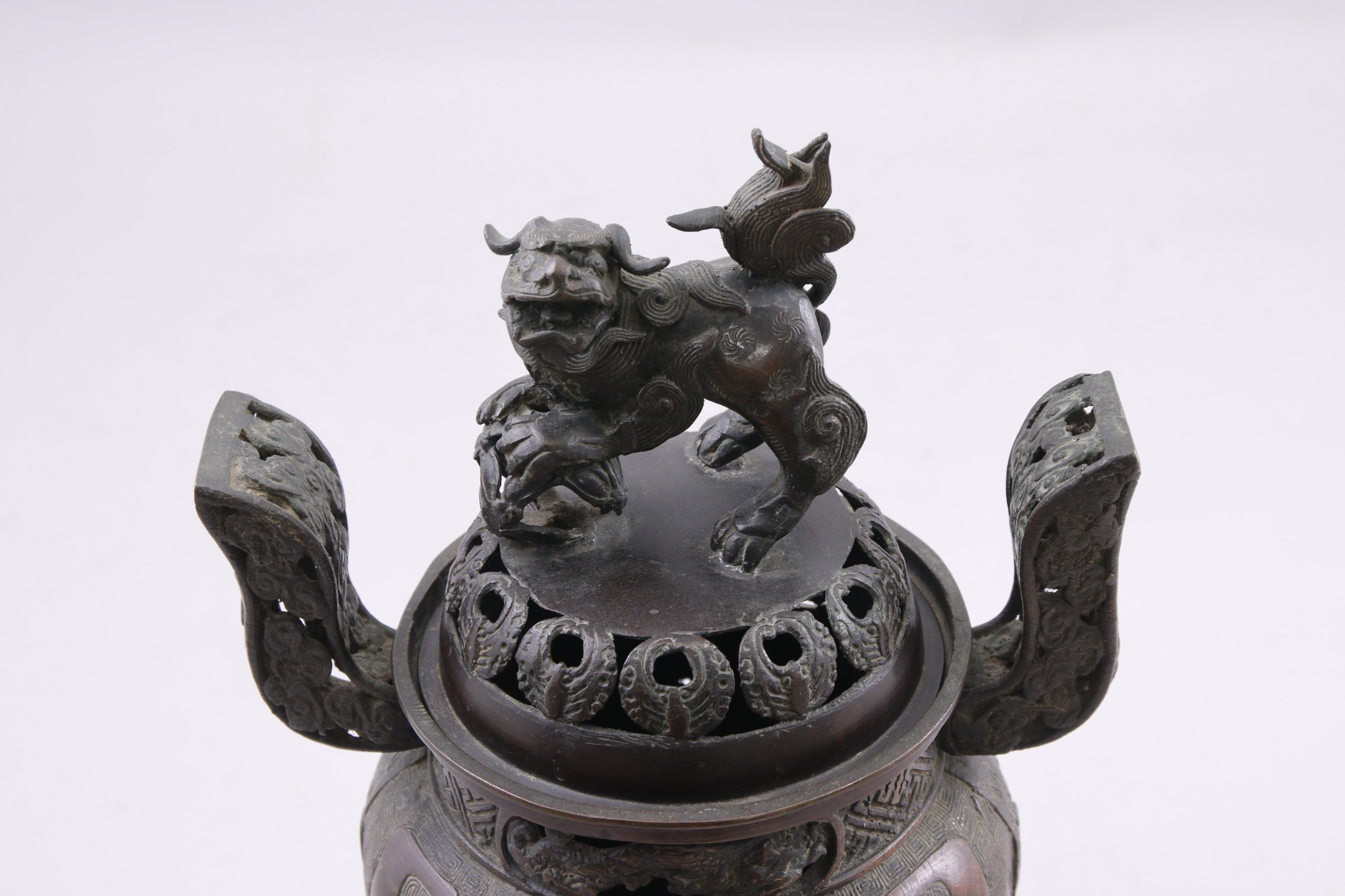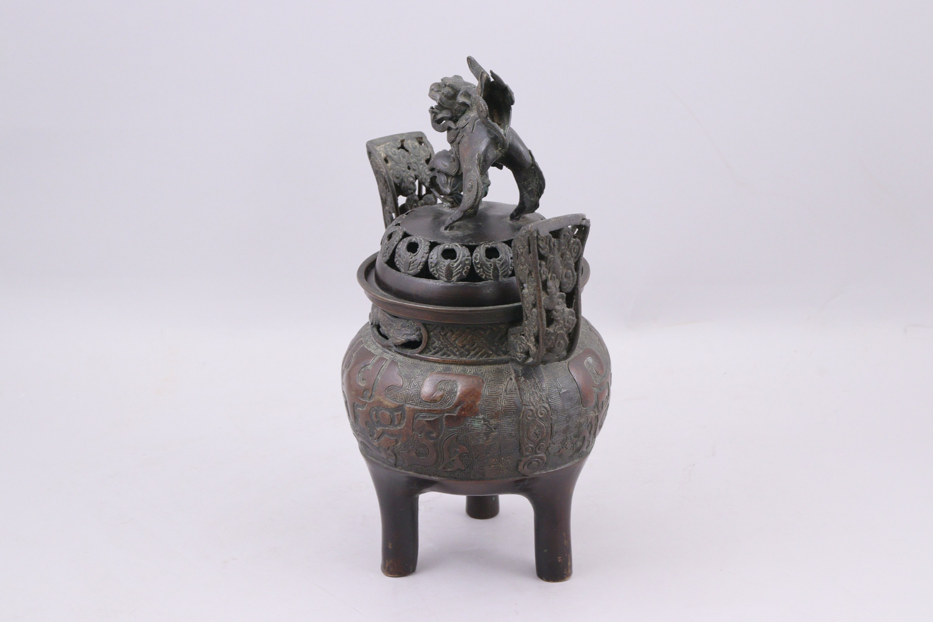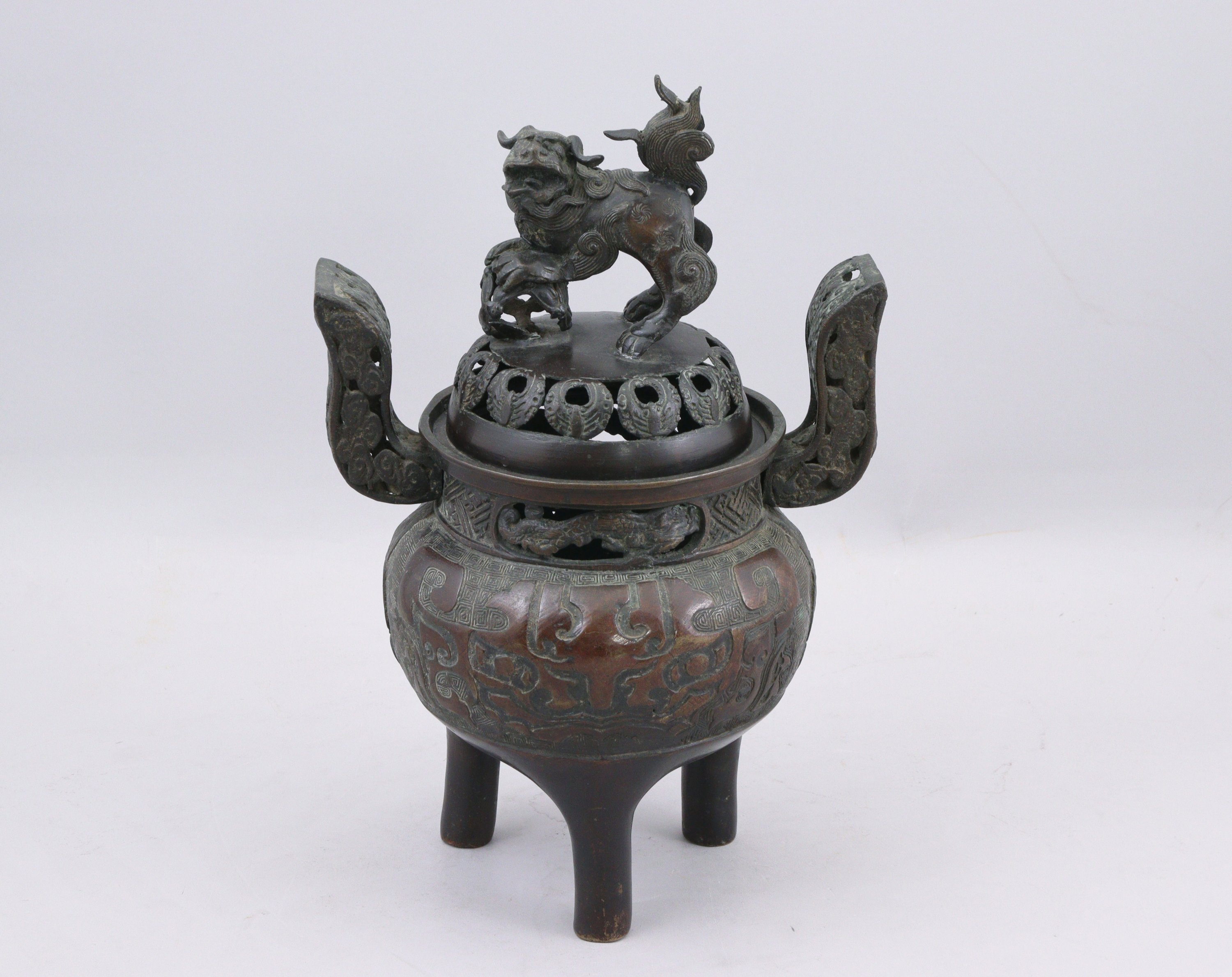 en bronze, motifs de taotié et de leiwen. Le couvercle surmonté d'un chien de fô.