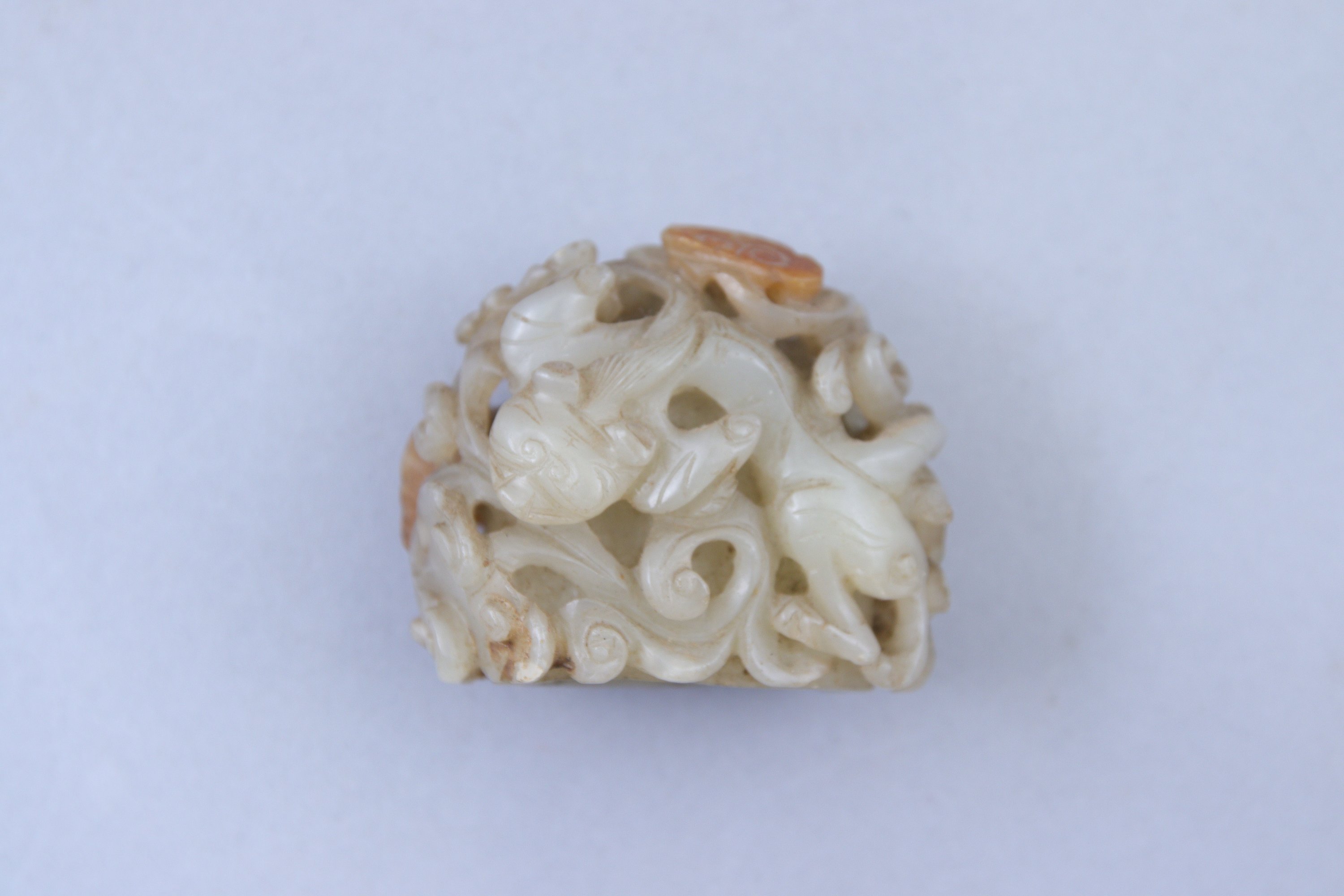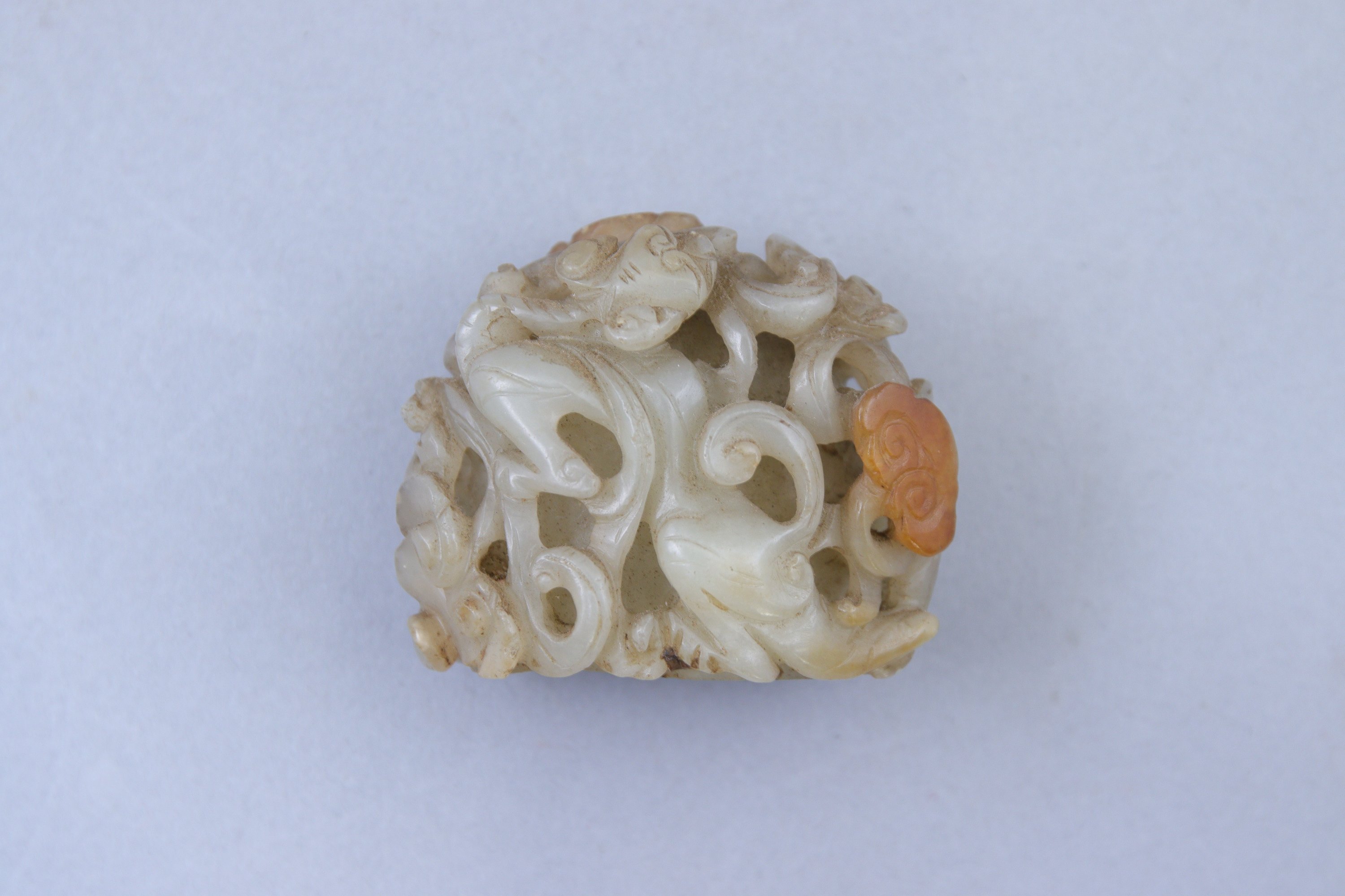 en jade (néphrite) céladon et beige sculptée de deux qilong jouant dans les nuages.