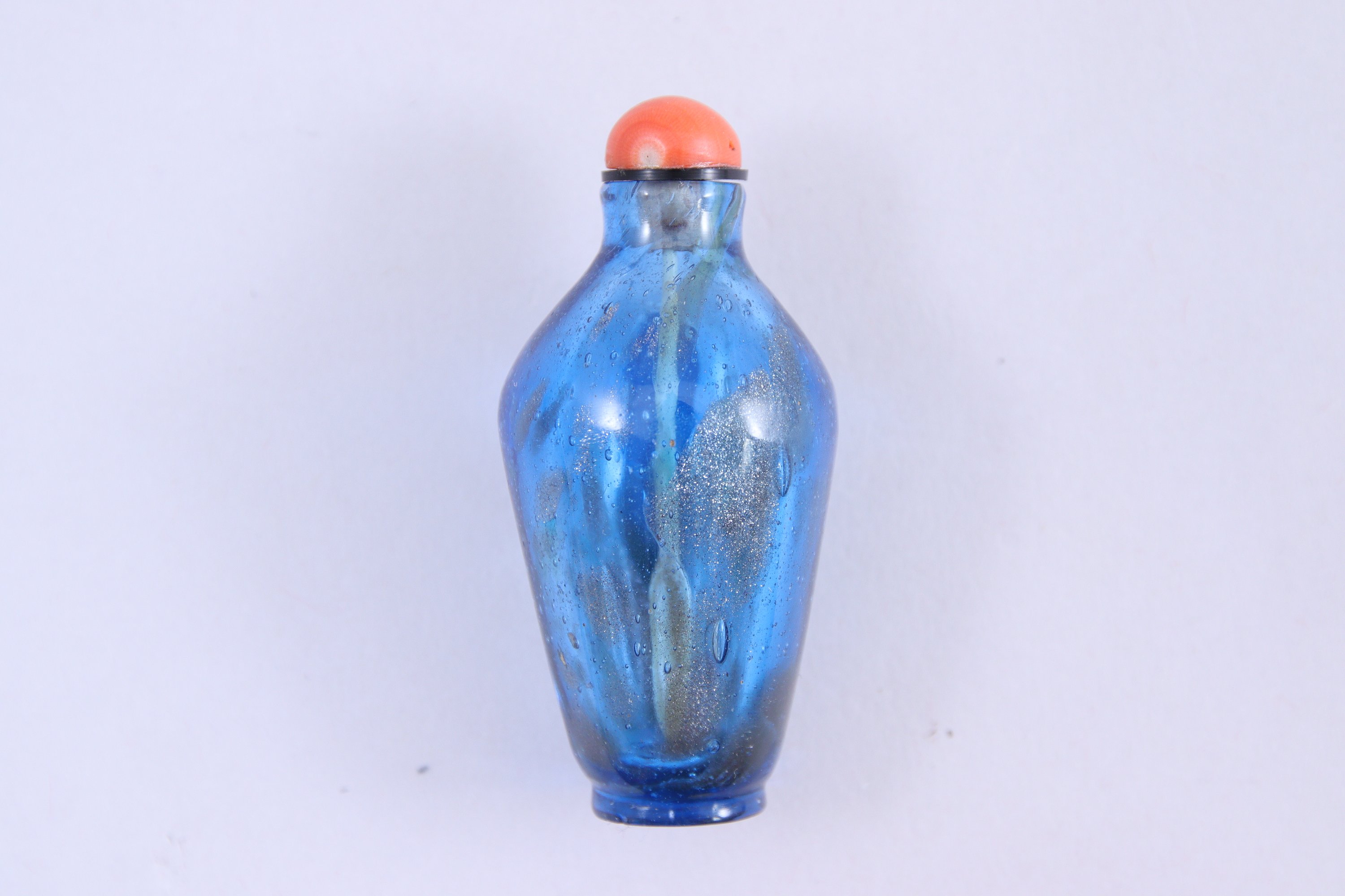 - Flacon tabatière balustre en verre bleu saphir légèrement translucide à inclusions aventurinées.