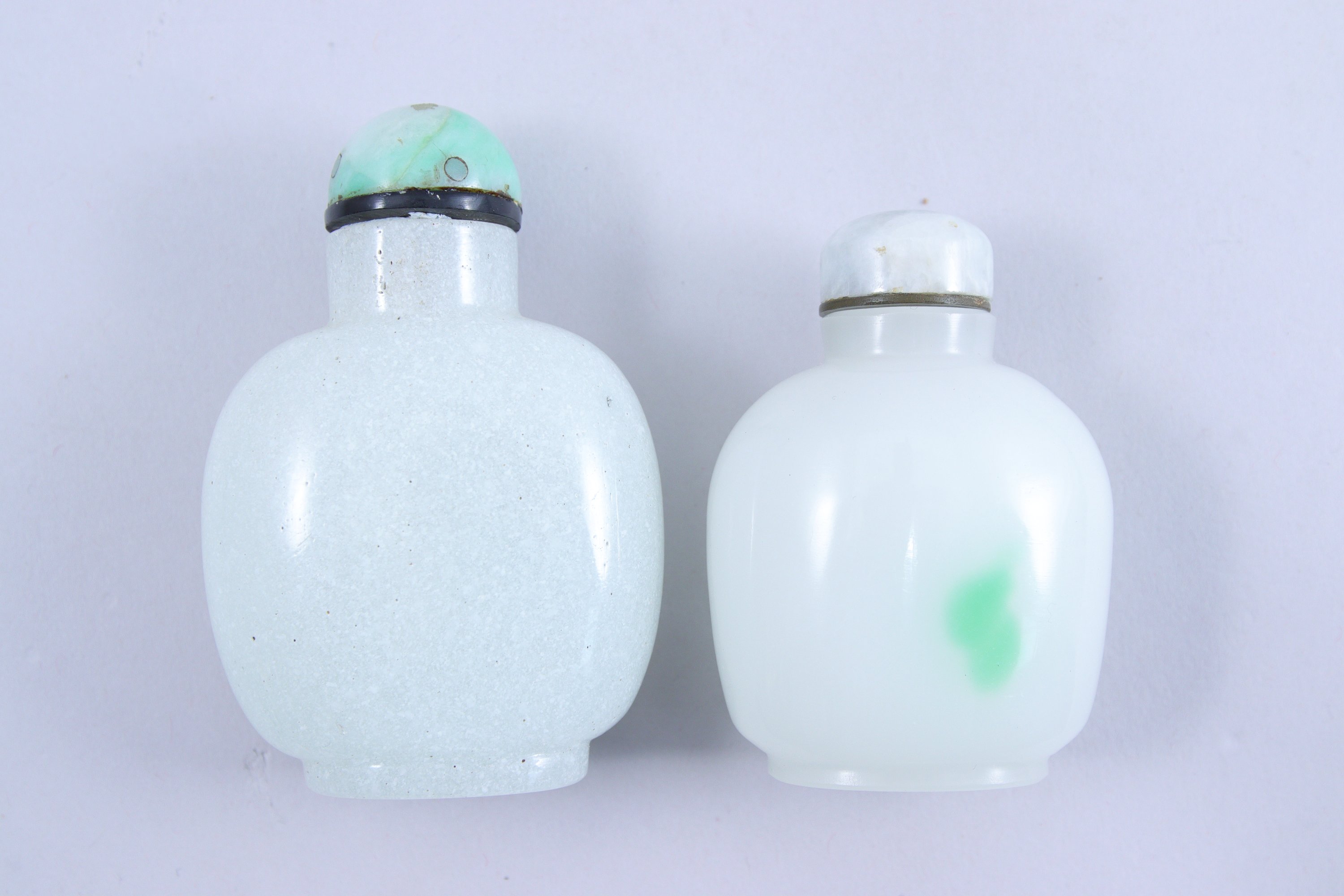 en verre, l'un bullé, l'autre imitant la jadéite blanche à inclusions vertes. Bouchons en jadéite et néphrite cerclés de noir.