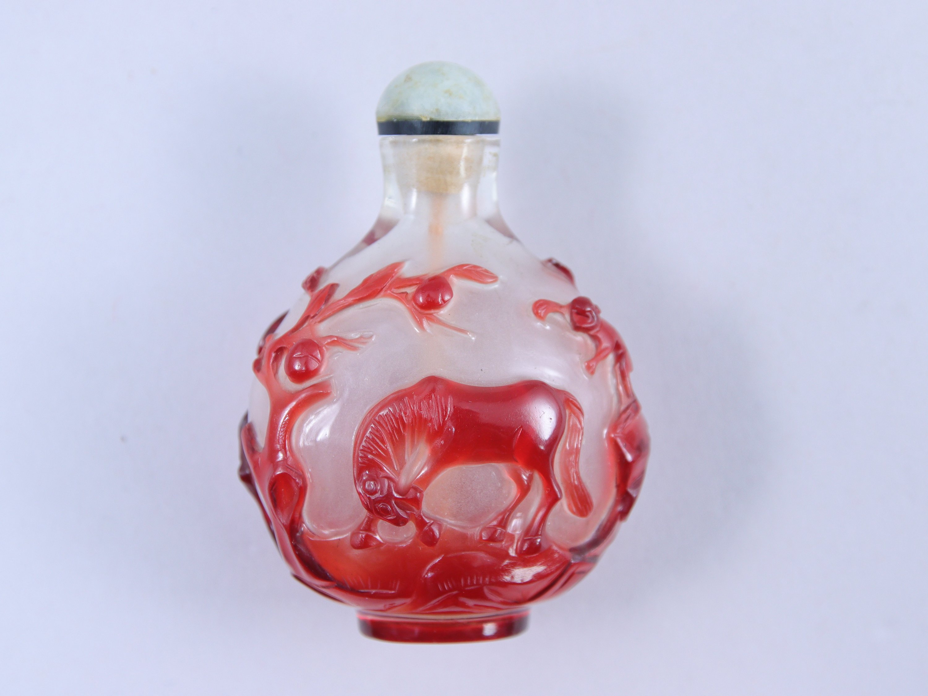 en verre overlay rouge sur fond légèrement translucide à décor sculpté d'un cheval et d'un singe debout sur un rocher sous un arbre de pêches. Bouchon en jadéite.