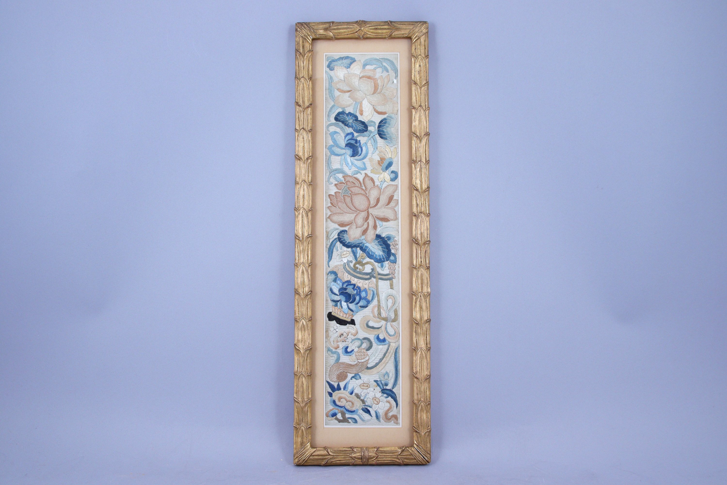 en soie, à décor brodé de vase et chauves-souris parmi les lotus.