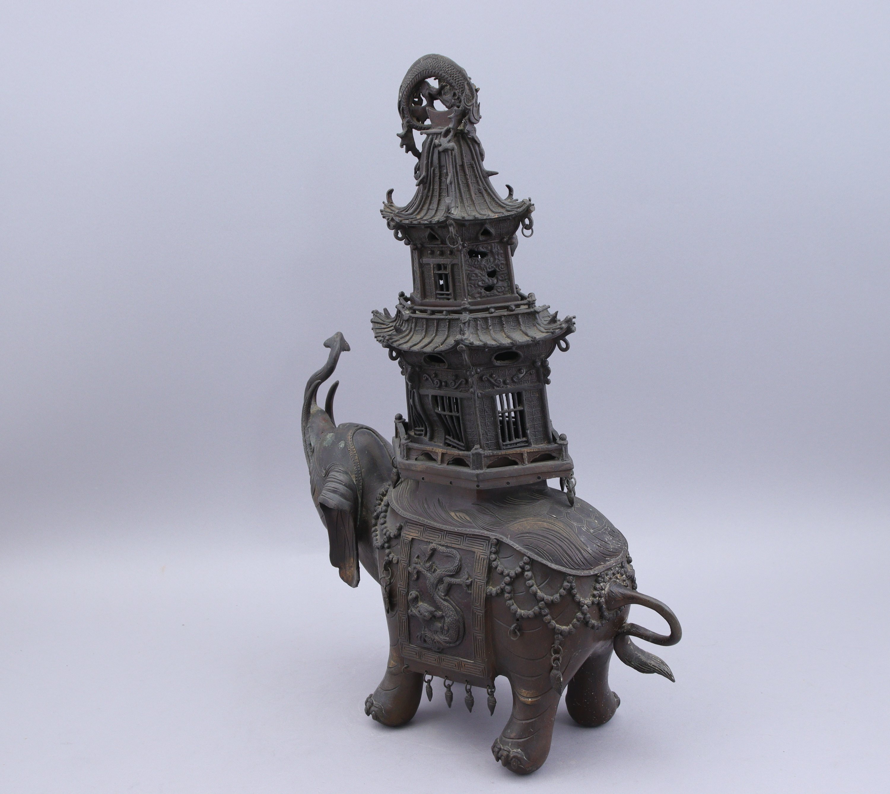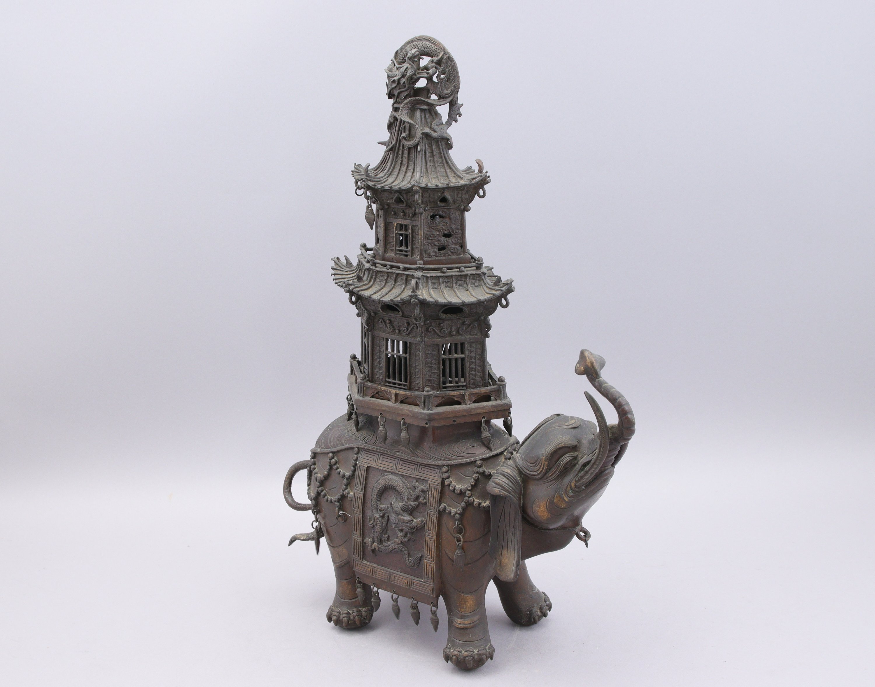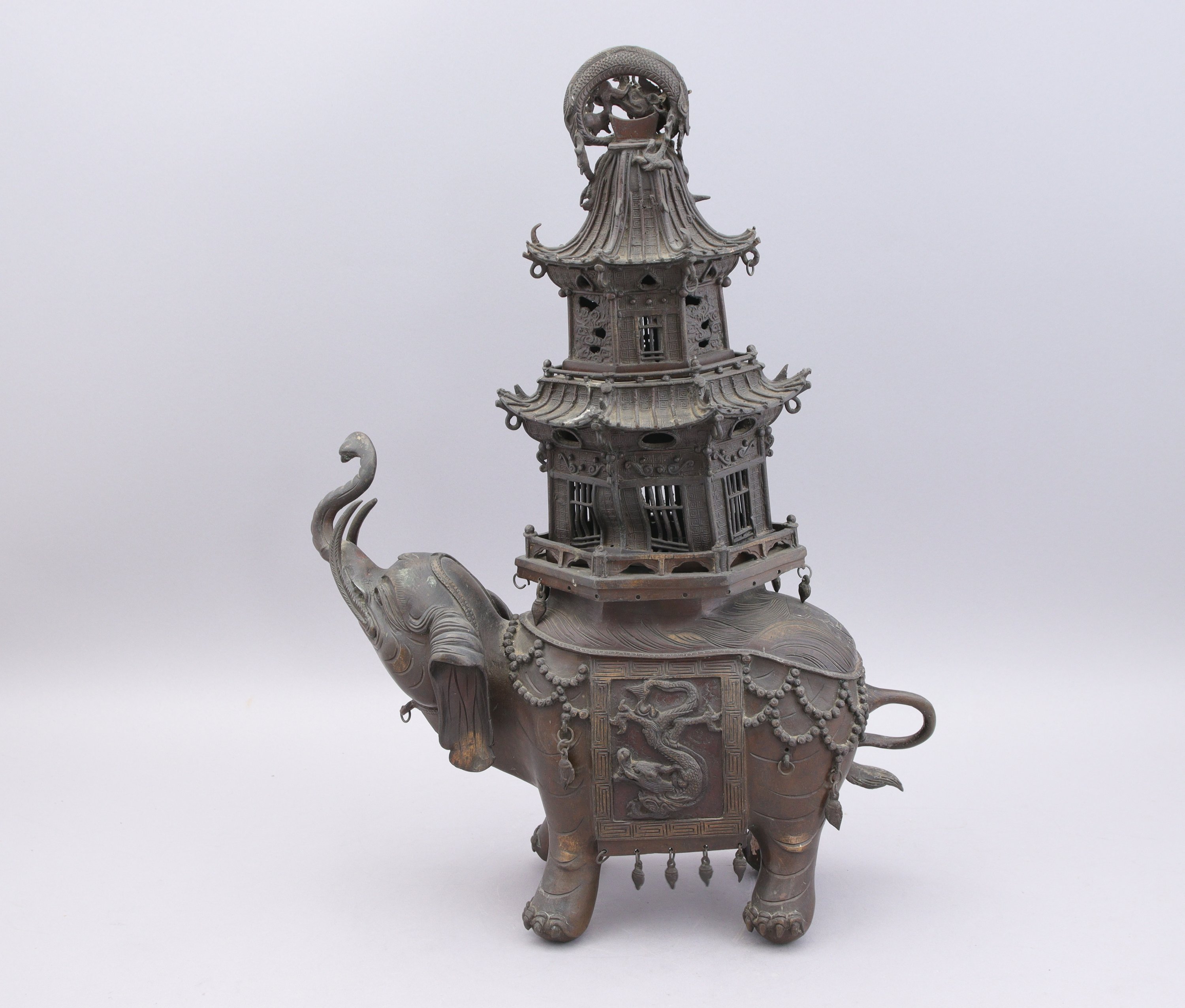 en bronze, portant sur son dos une pagode ajourée. Un dragon lové posé sur le toit de la pagode, des dragons ornant le tapis de selle.