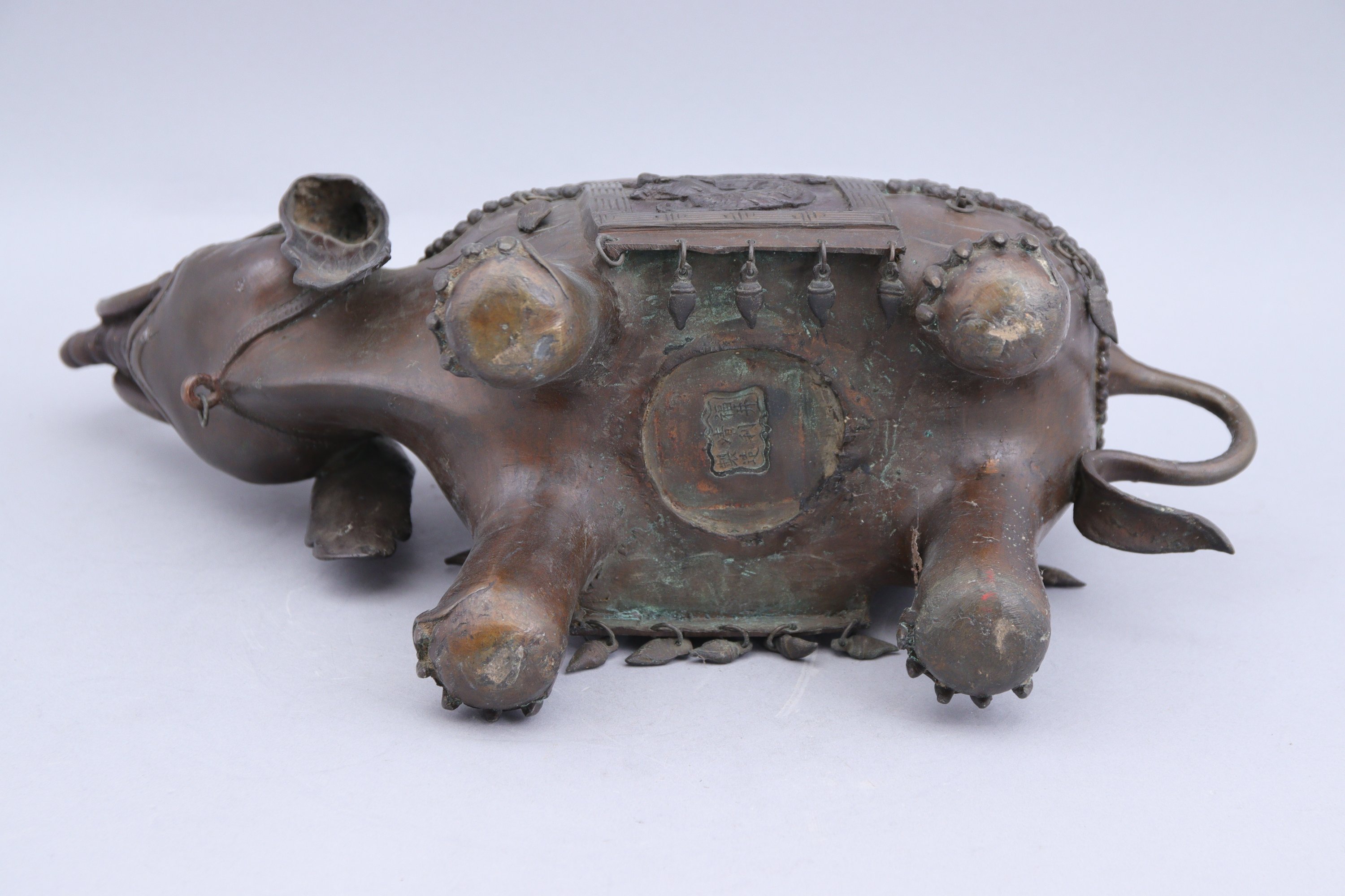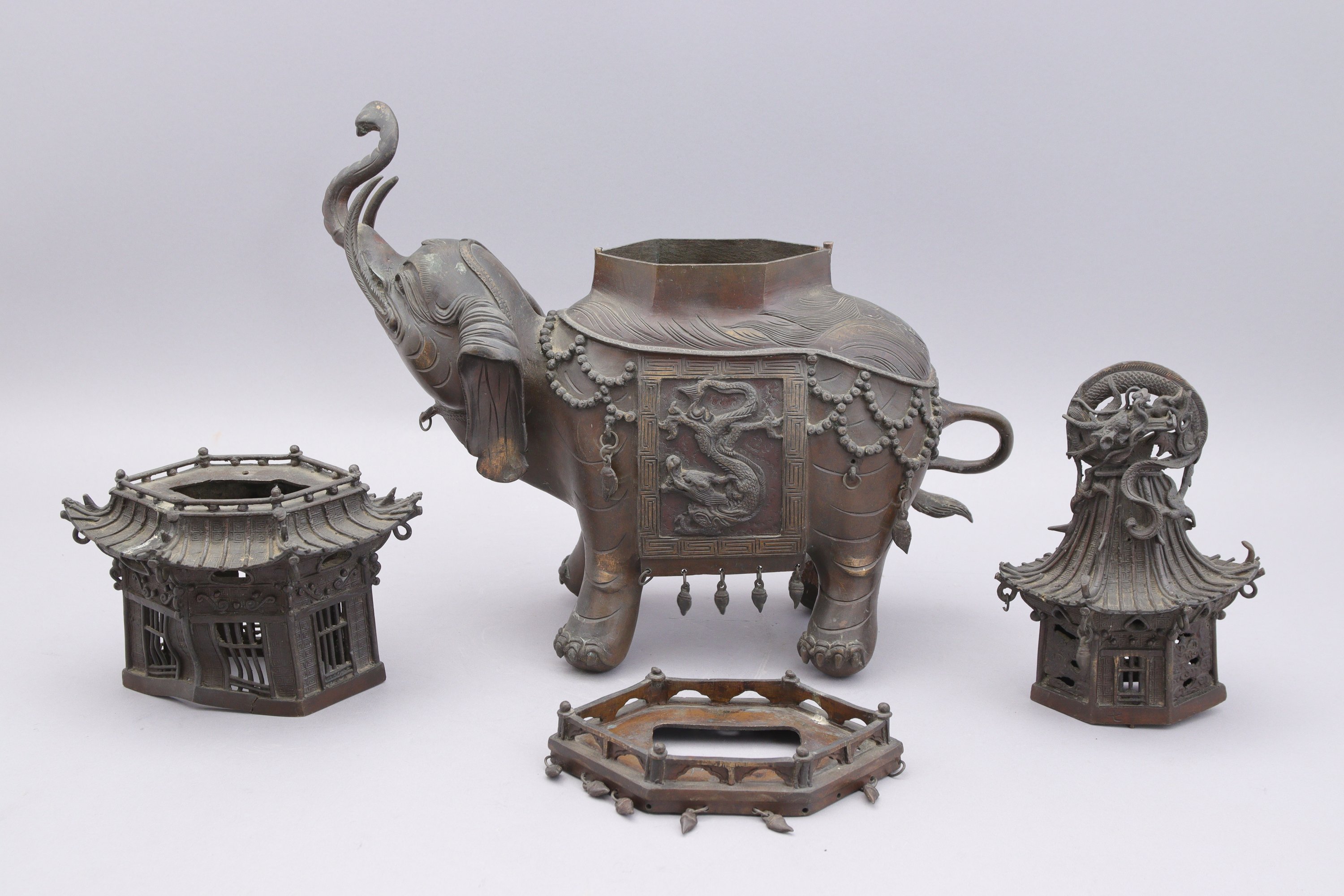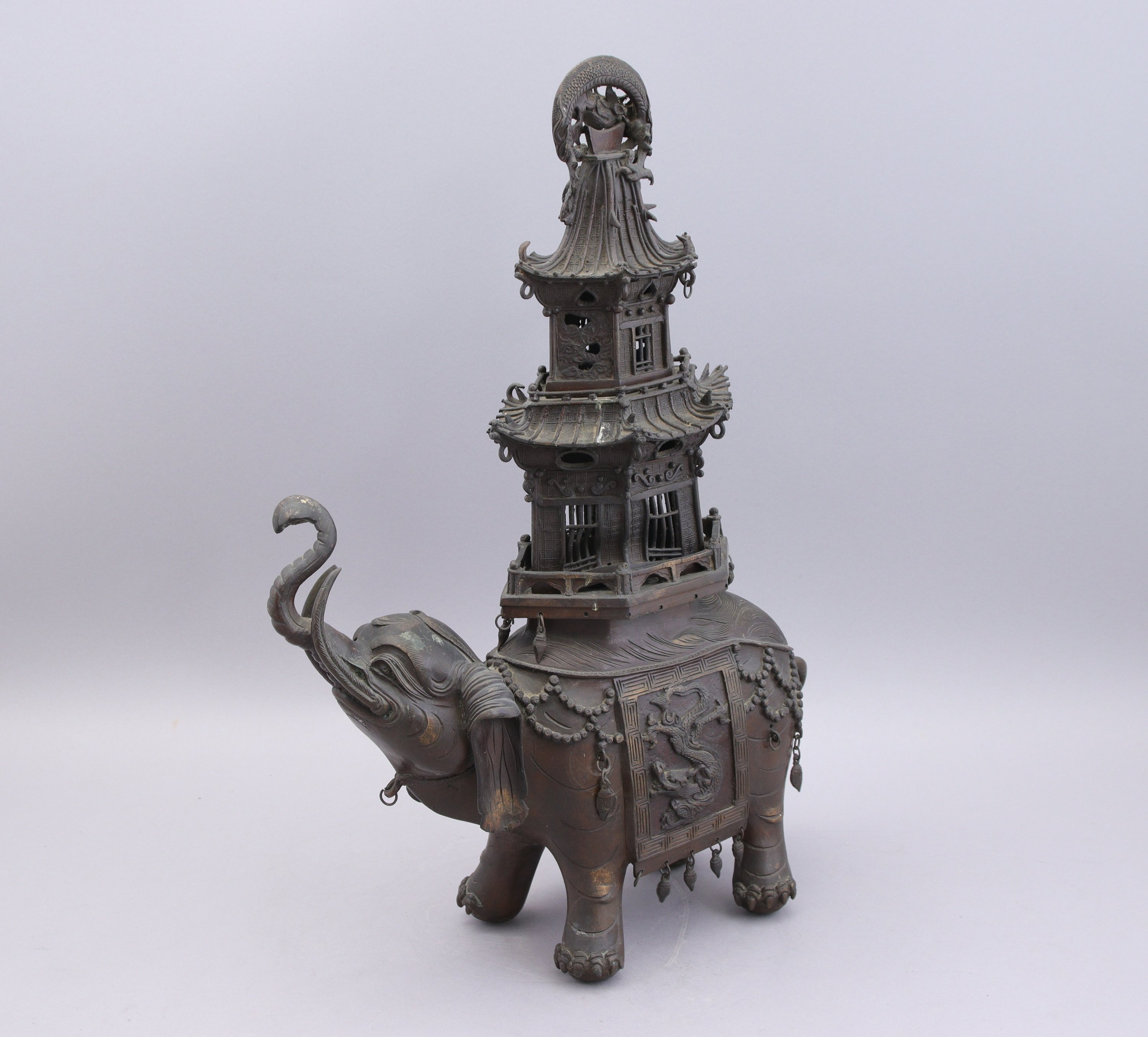 en bronze, portant sur son dos une pagode ajourée. Un dragon lové posé sur le toit de la pagode, des dragons ornant le tapis de selle.