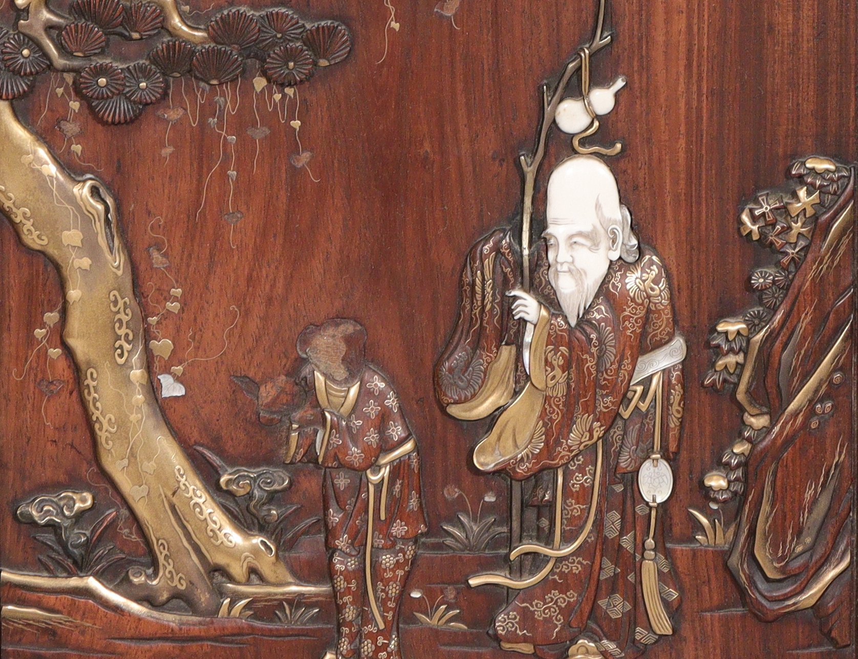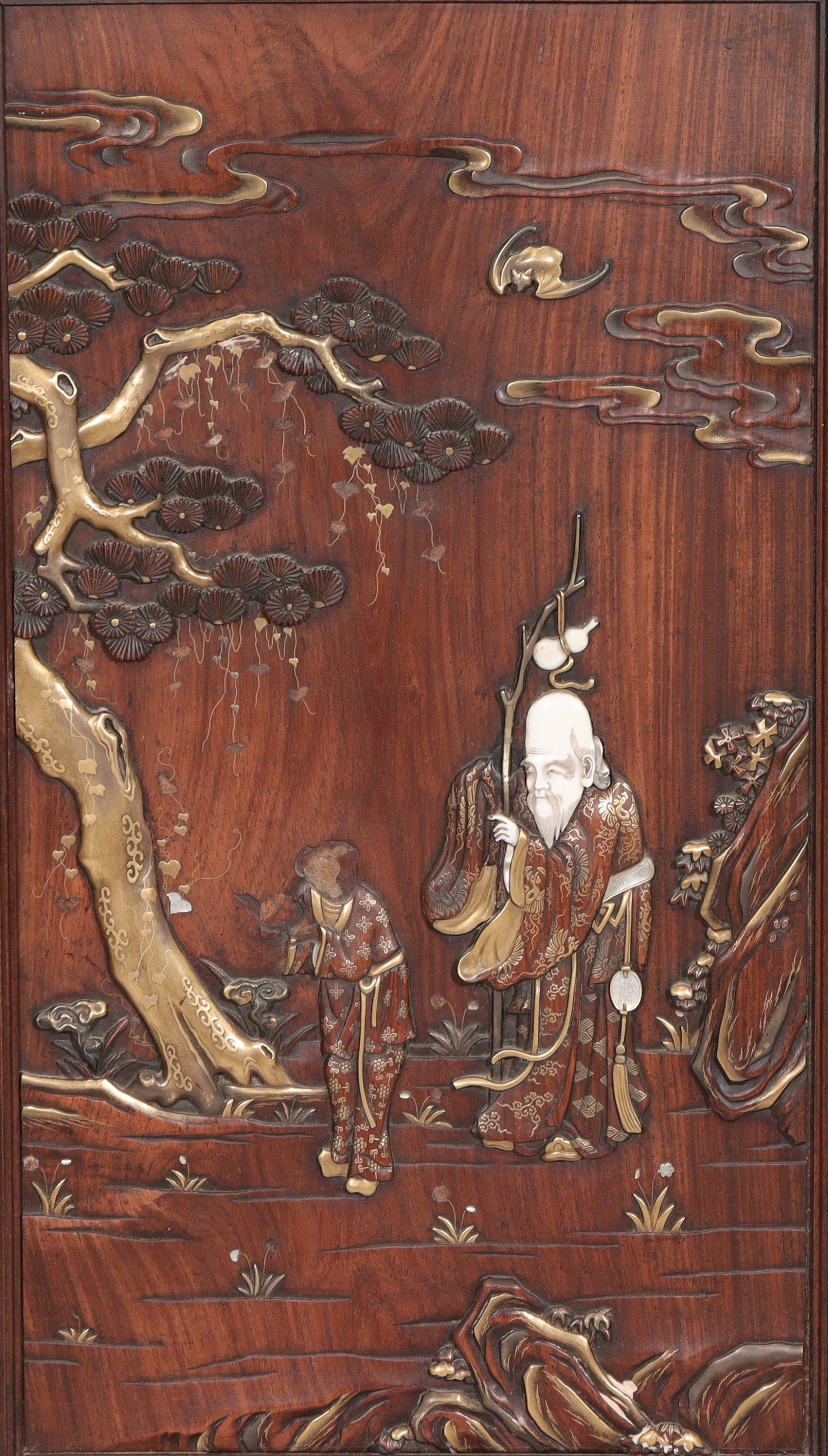 - Panneau représentant Jurojin en bois, à décor sculpté en relief figurant Jurojin tenant un bâton auquel est accroché une gourde, accompagné d'un enfant.