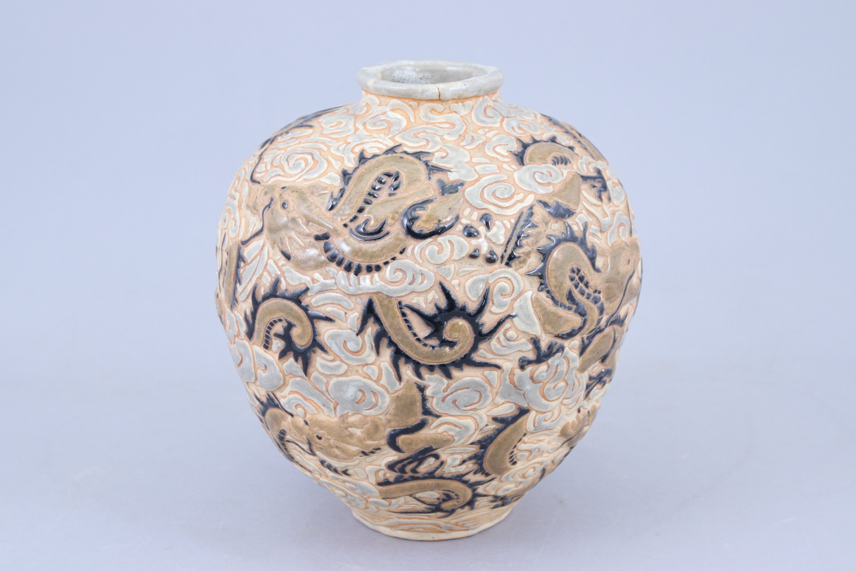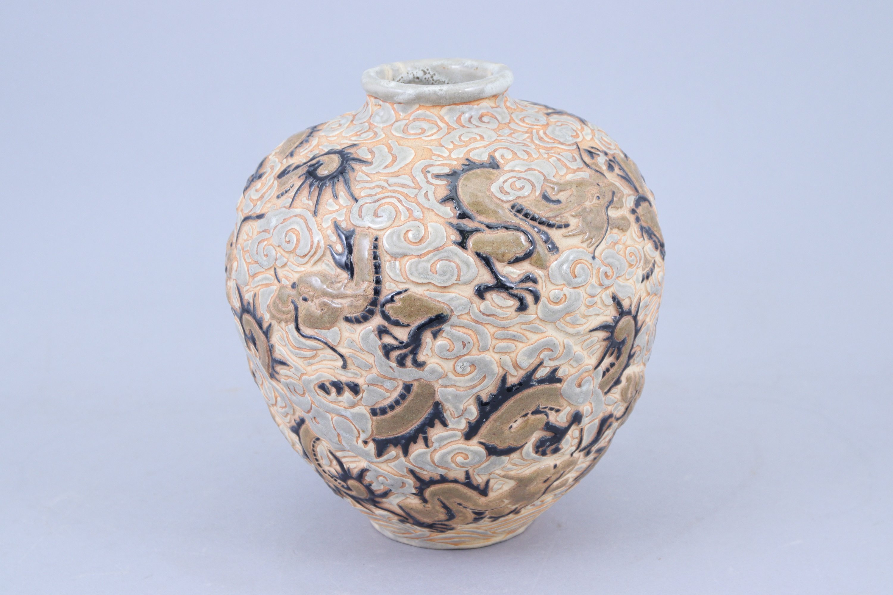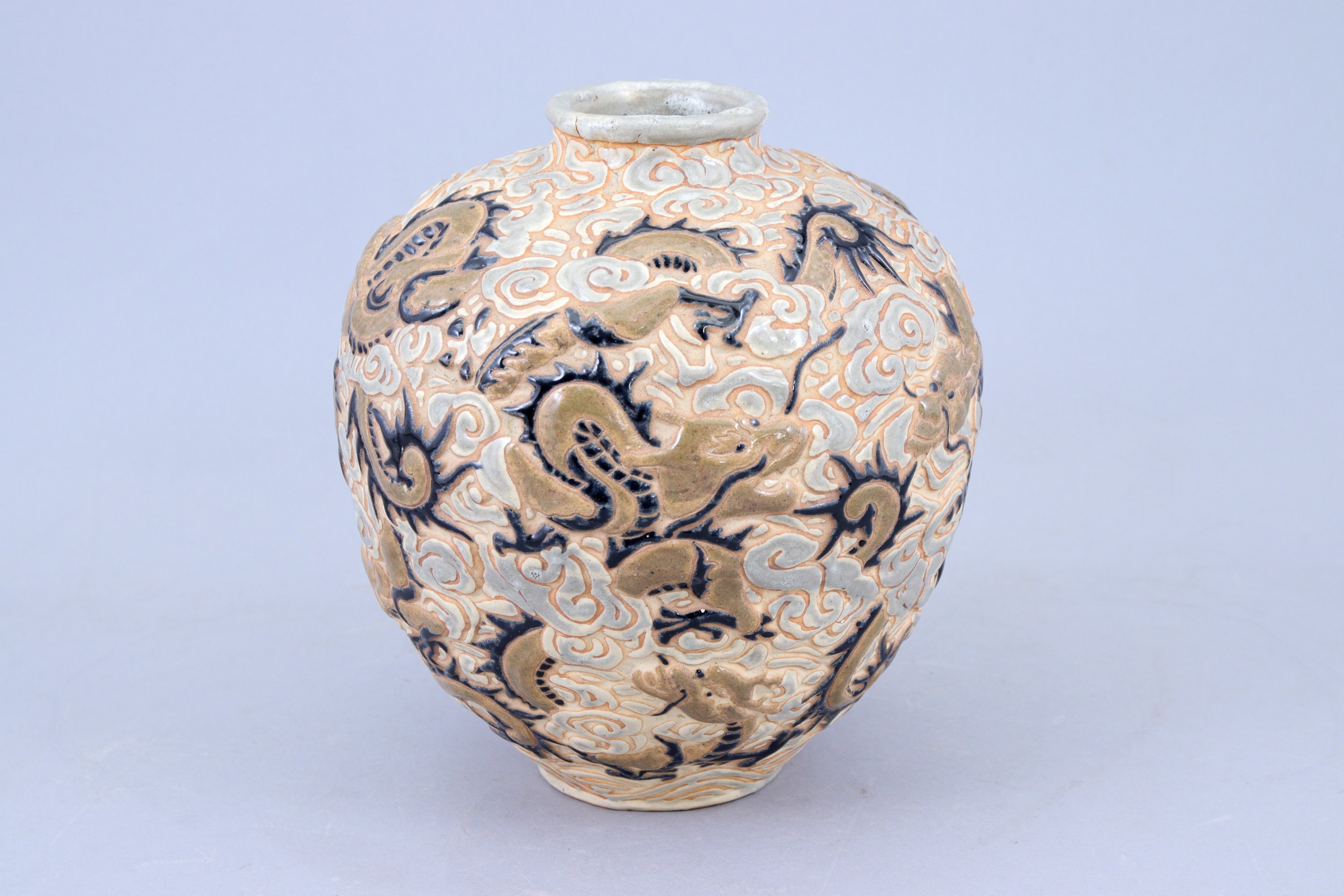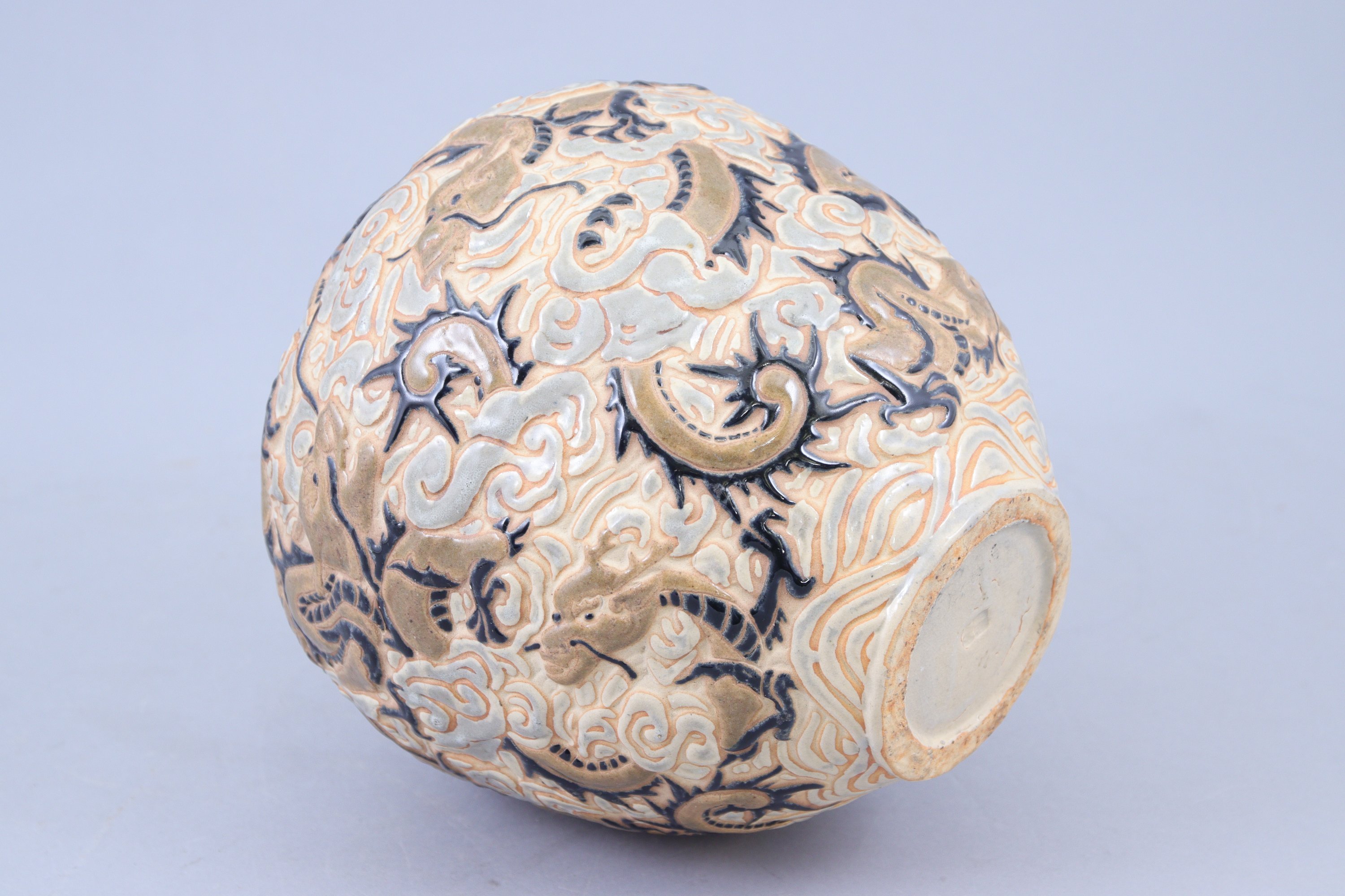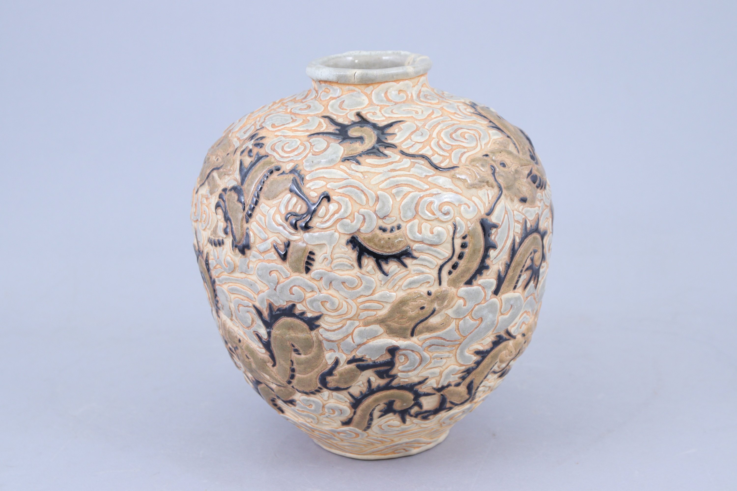 en grès émaillé polychrome à décor de dragons dans les nuages.