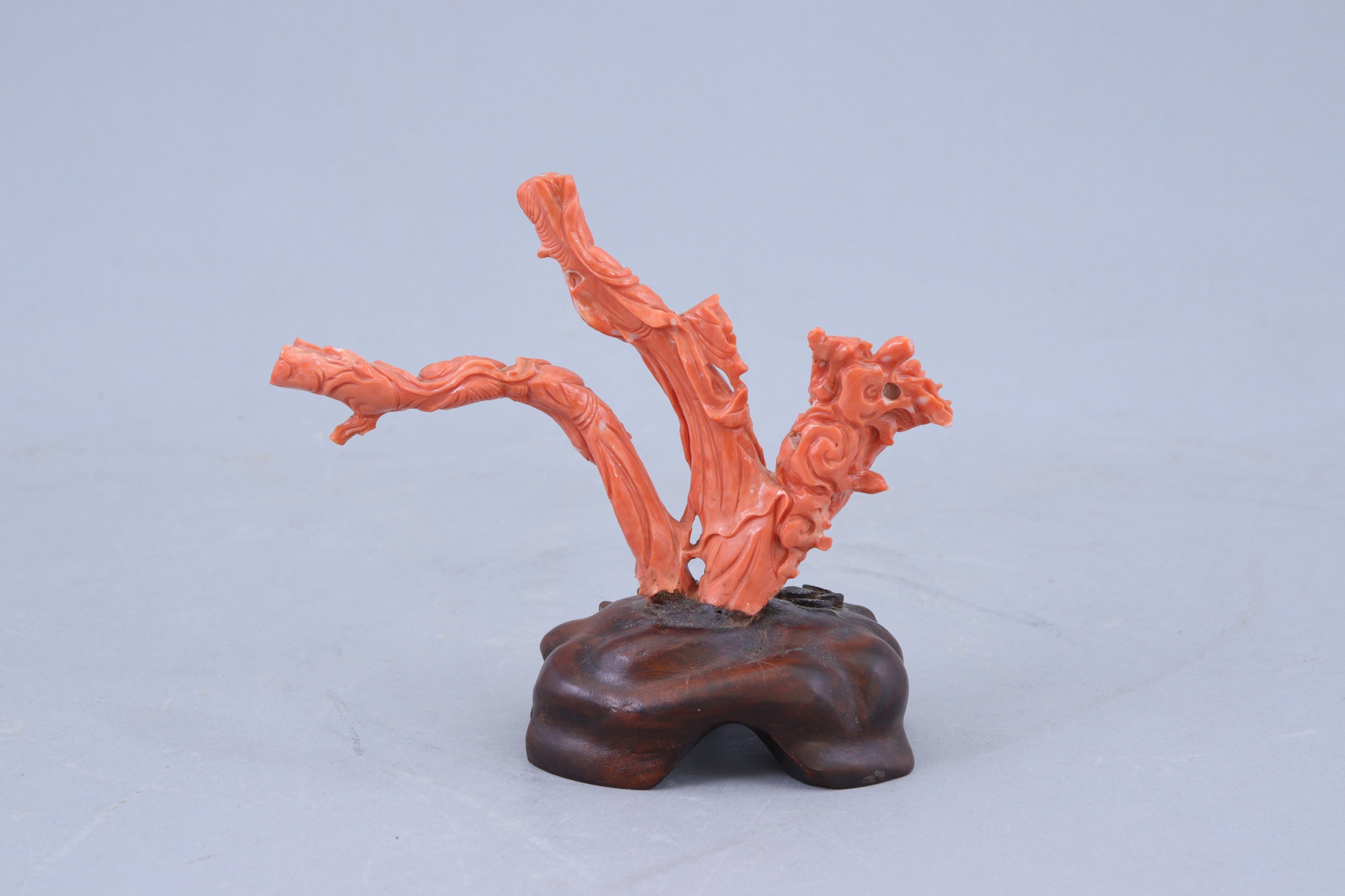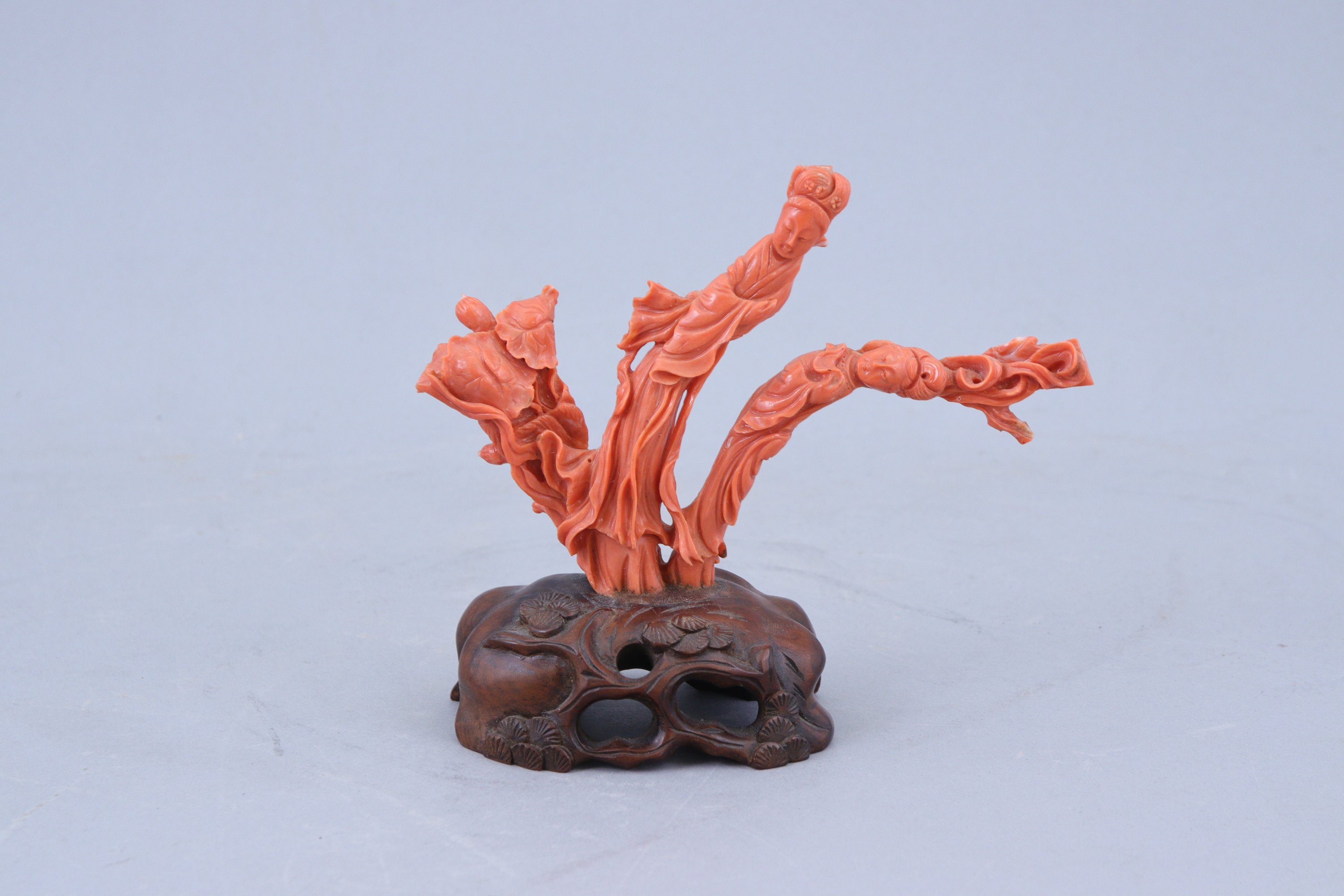 en corail rouge sculpté de deux jeunes femmes et lotus.