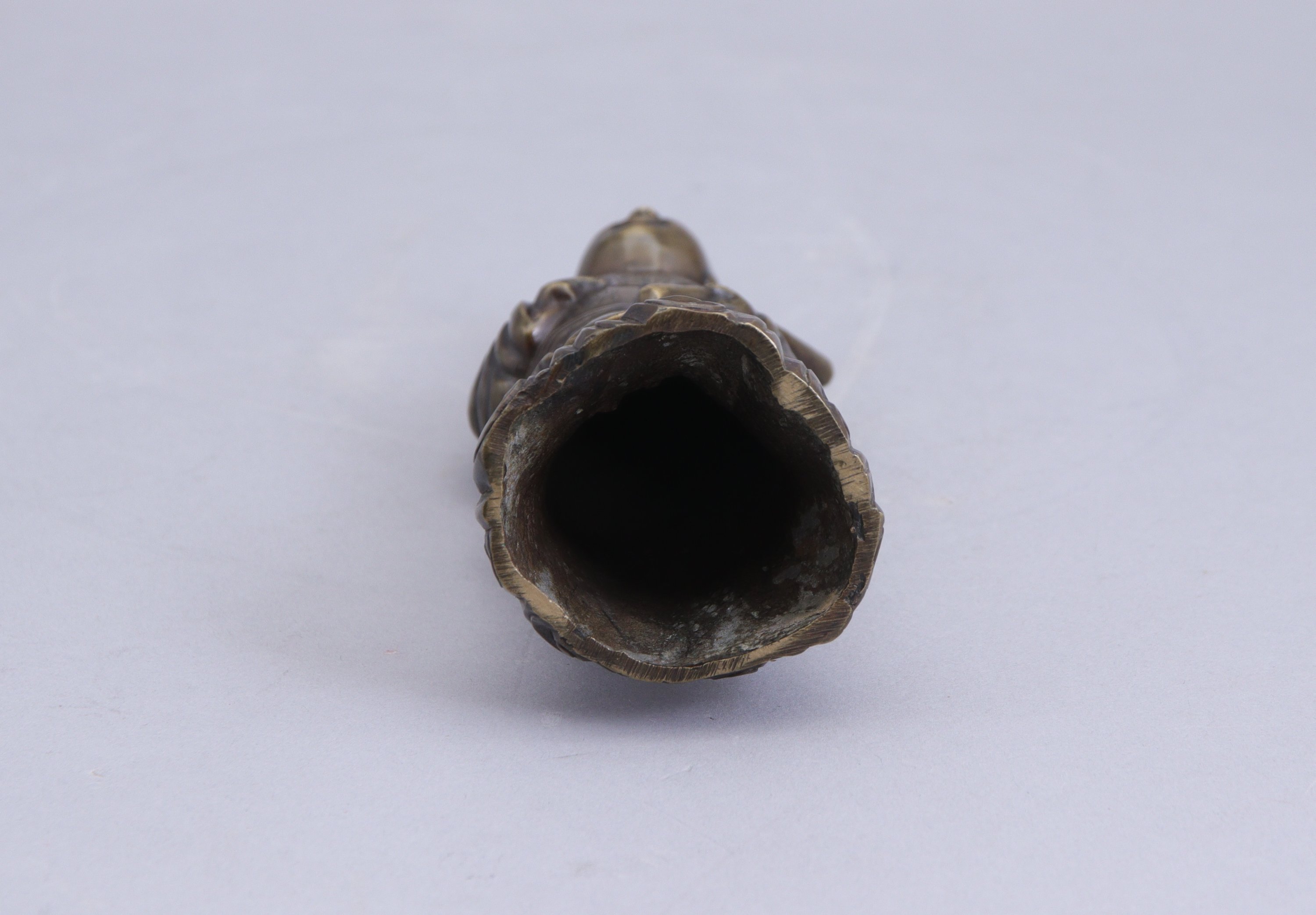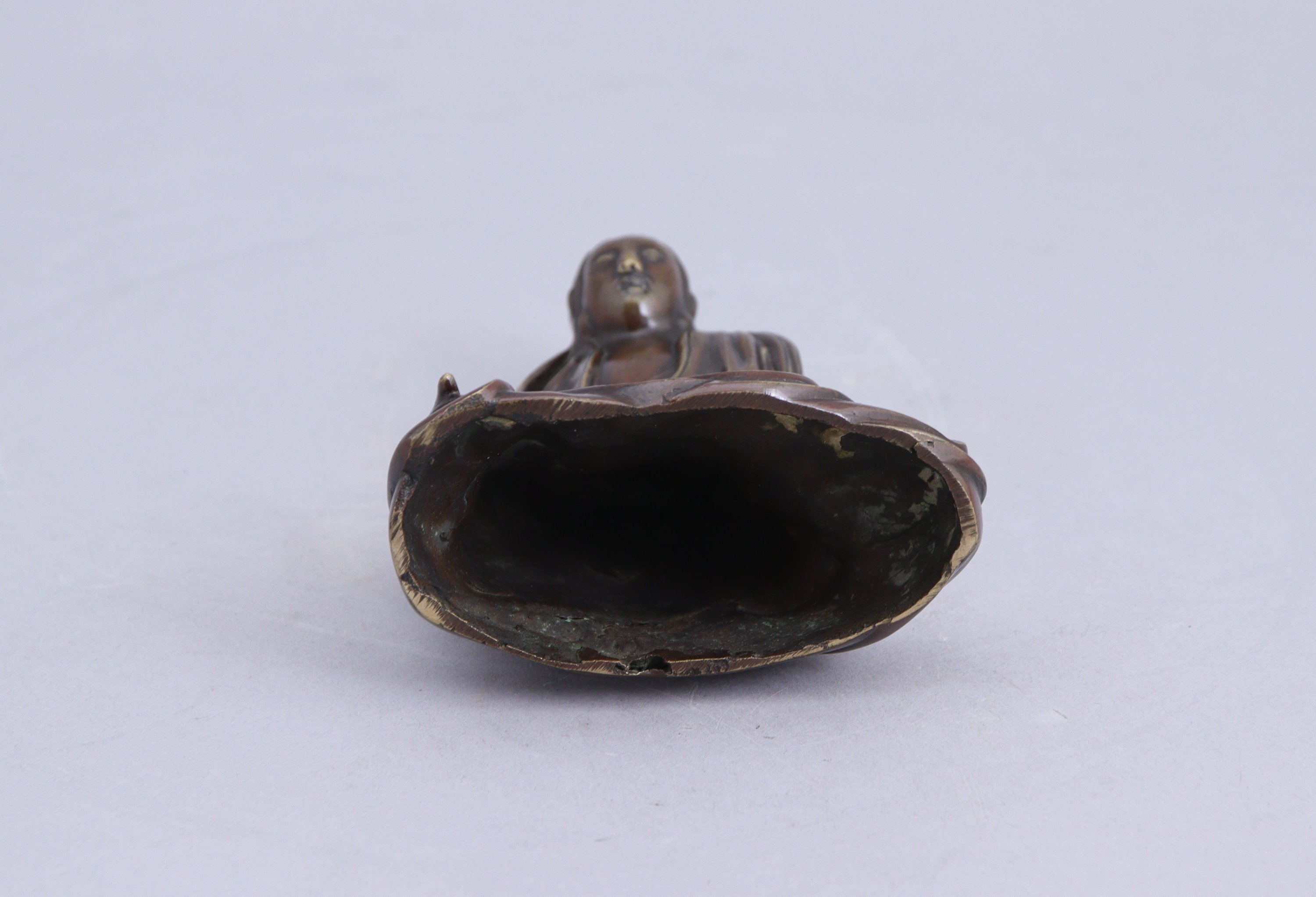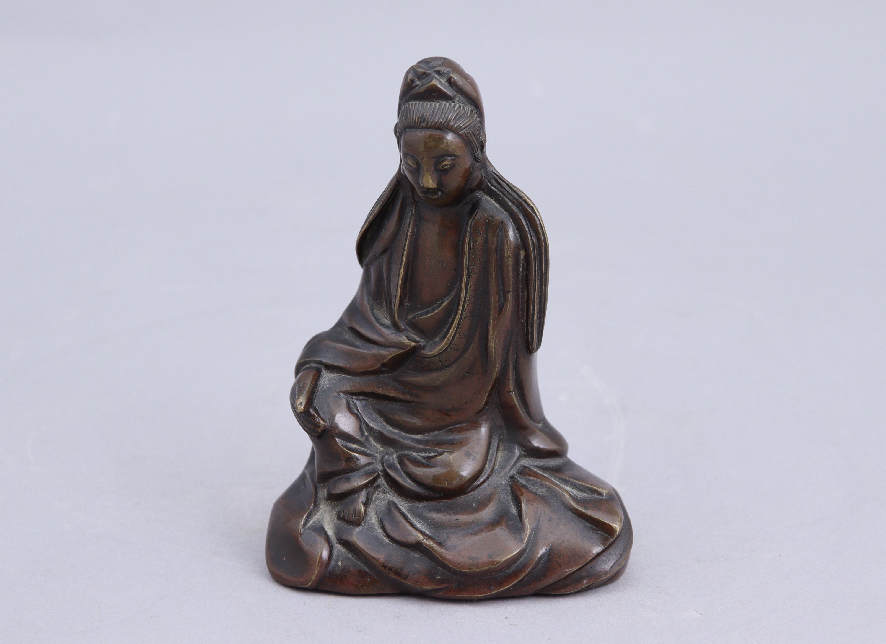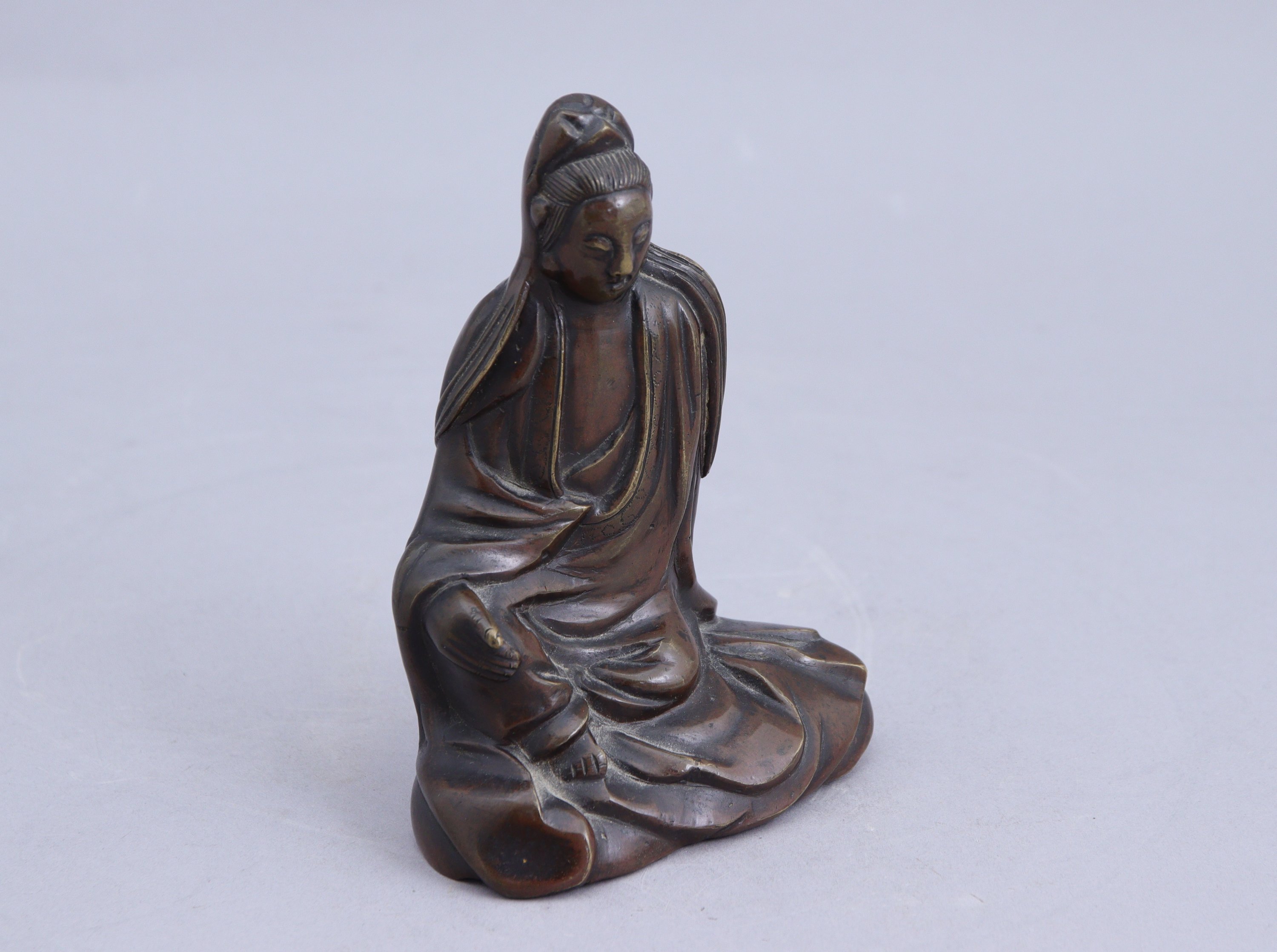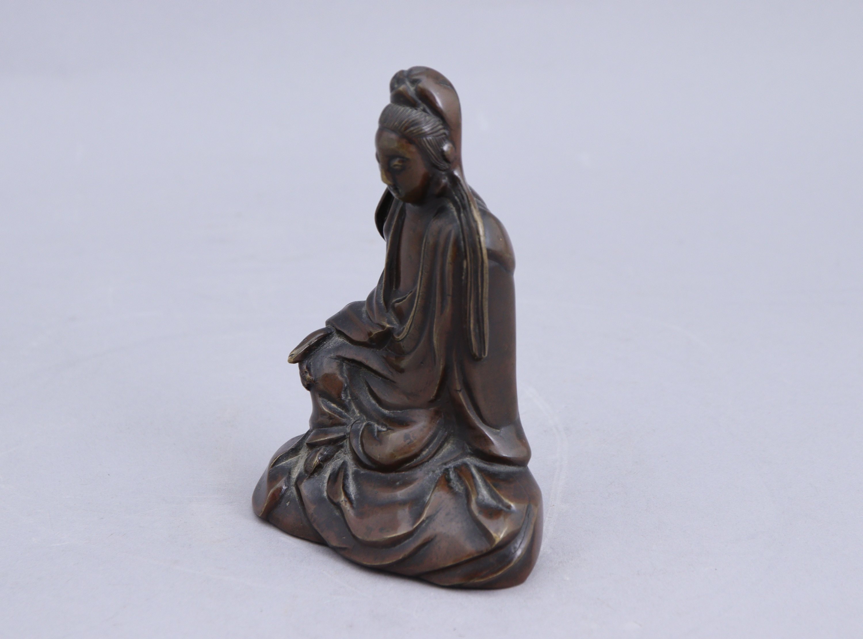 en bronze à patine brune, Guanyin assise en lalitasana sur un rocher.