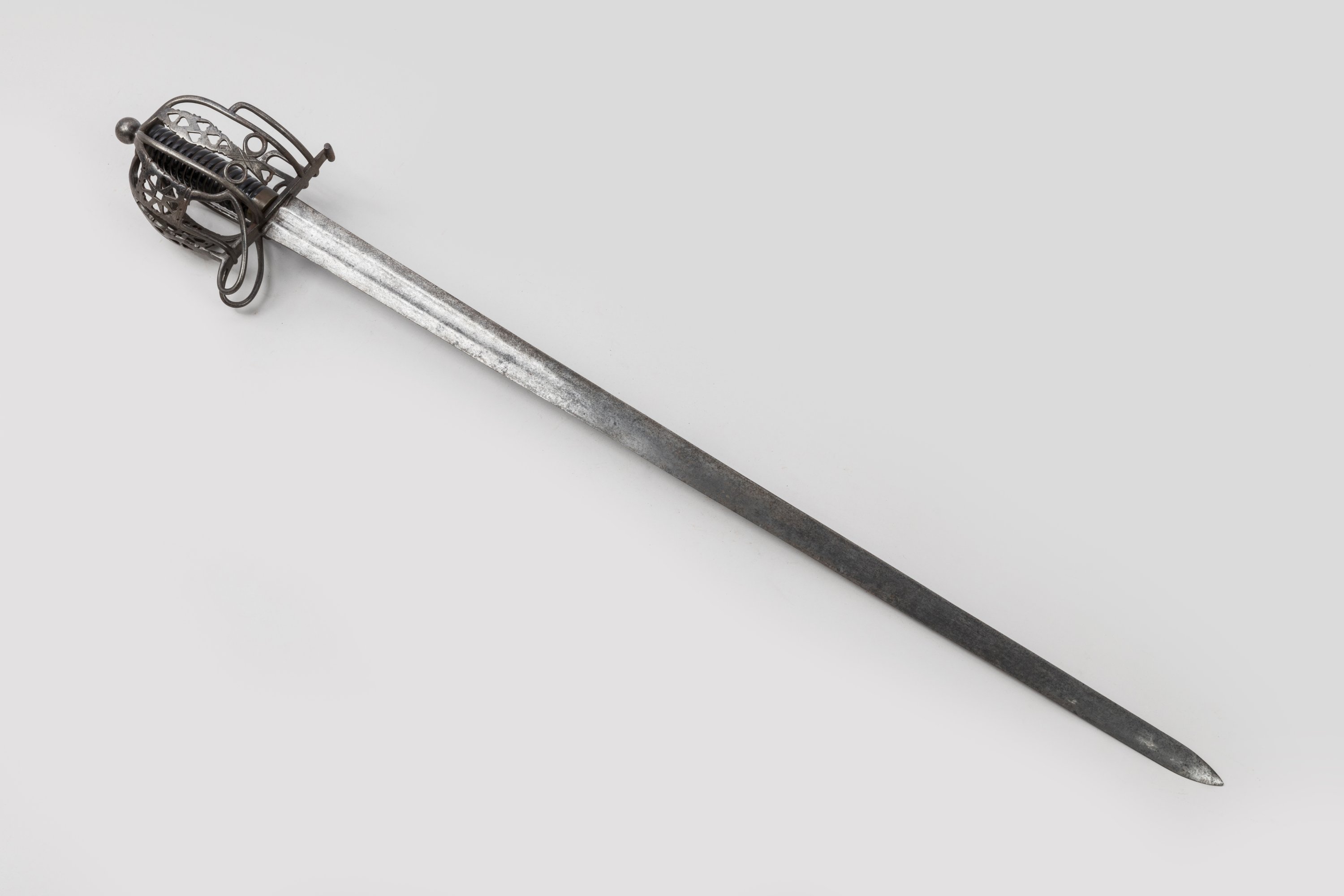 Monture en fer forgé, garde à multiples branches ajourées. Fusée en corne vernie. Belle lame plate à gouttière médiane au talon.
