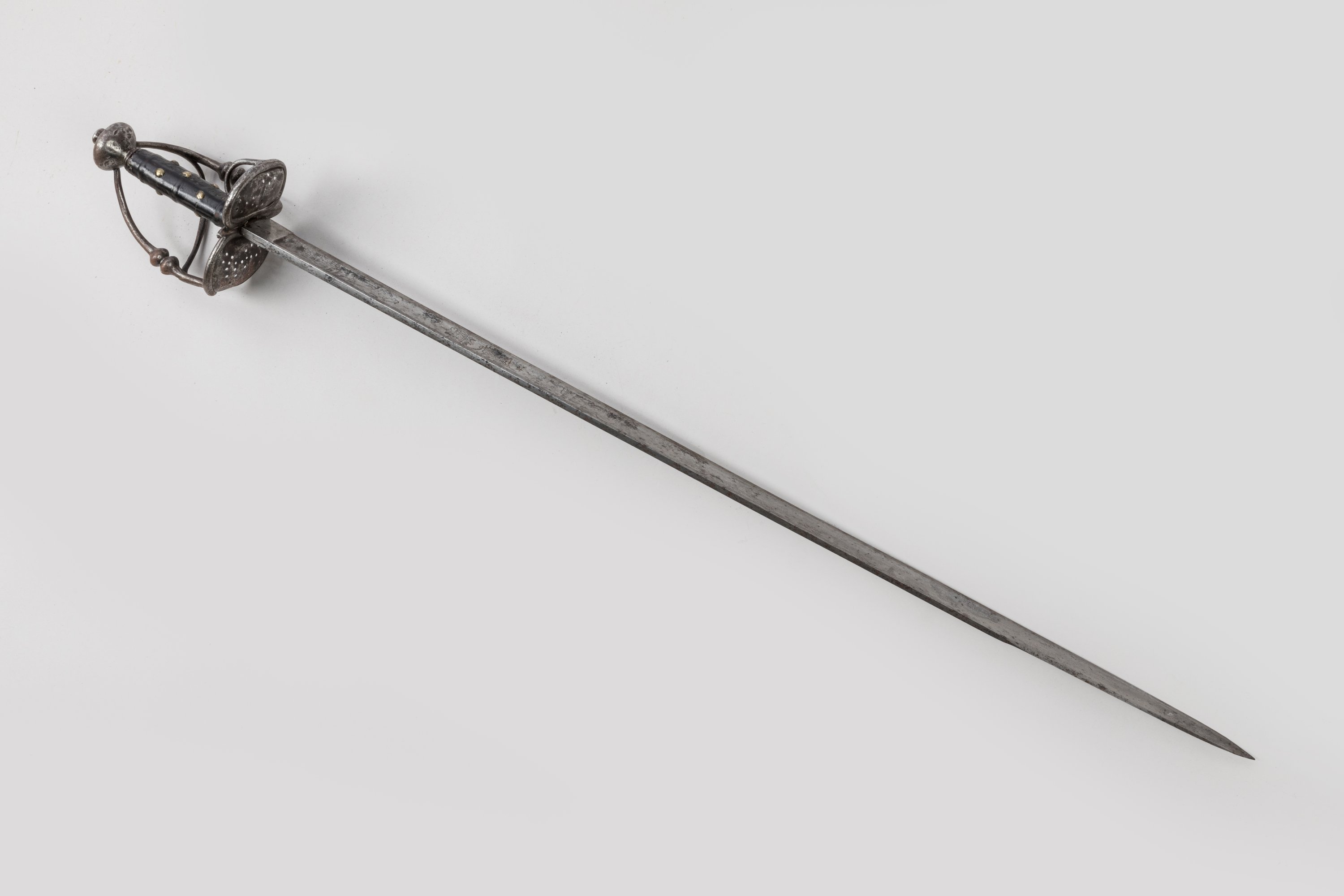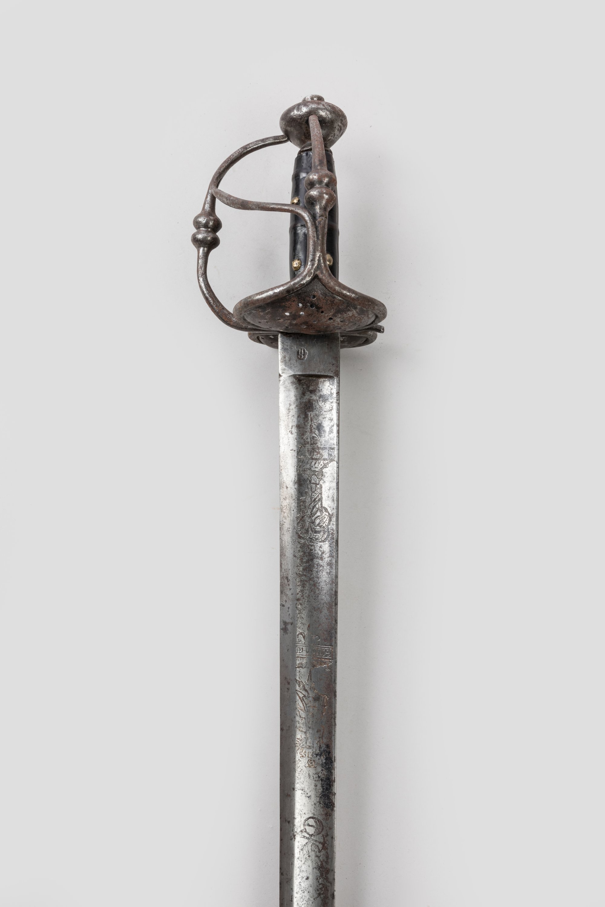Pommeau en oignon. Monture en fer forgé, garde à trois branches et coquille repercée. Fusée en cuir clouté de cuivre. Lame à dos et pans creux, gravée de personnages allégoriques et de la mention « Solie deo gloria ». Talon poinçonné.