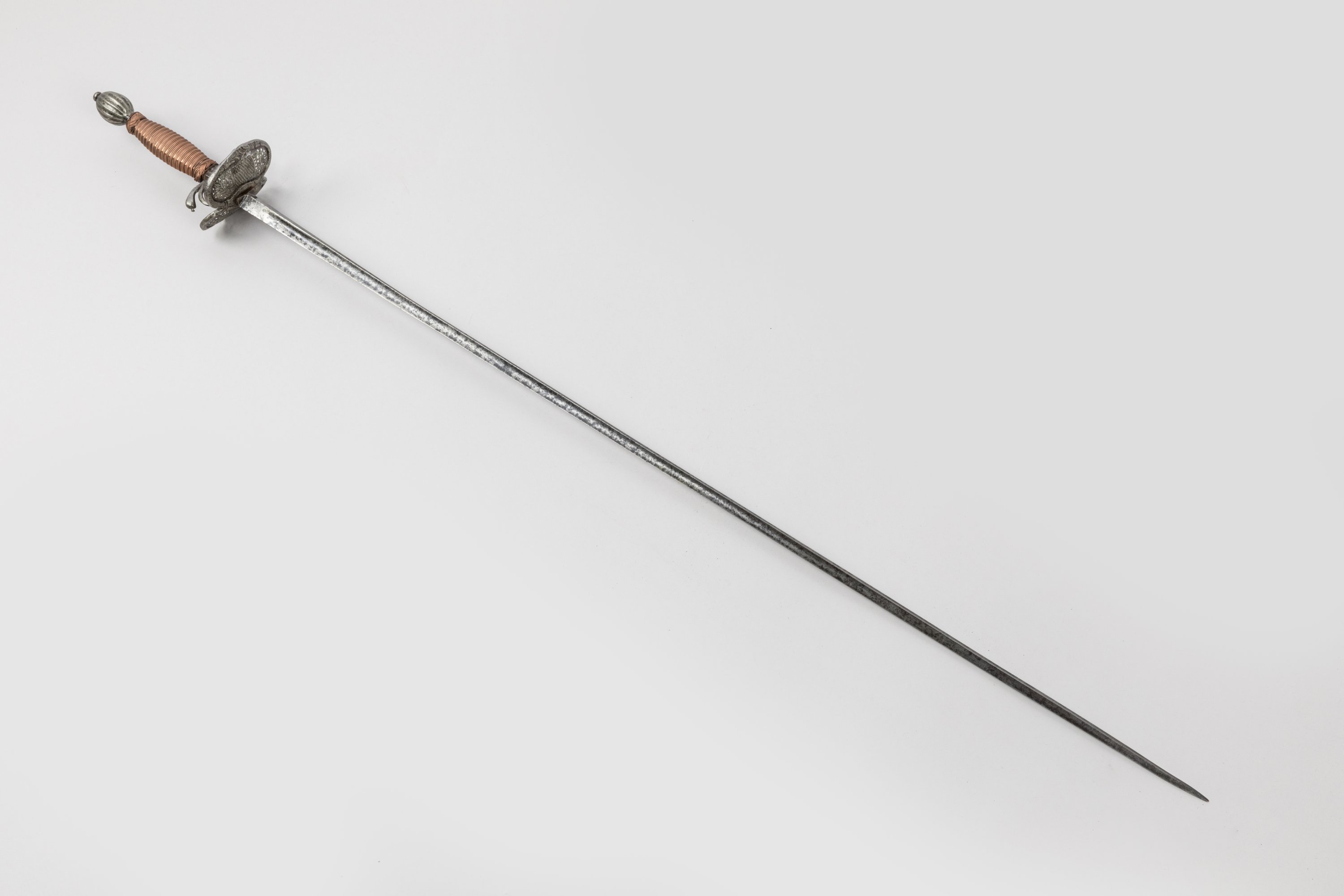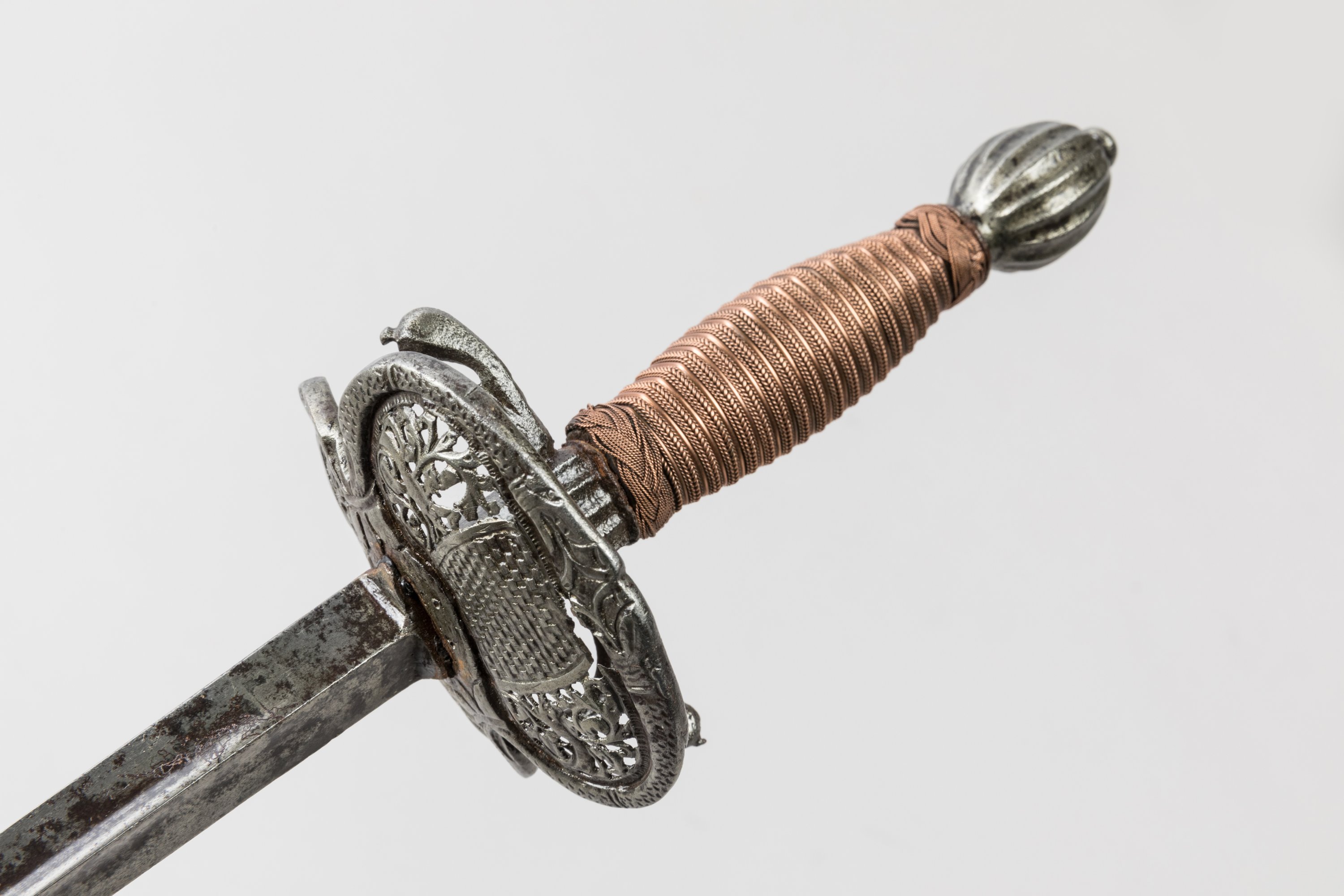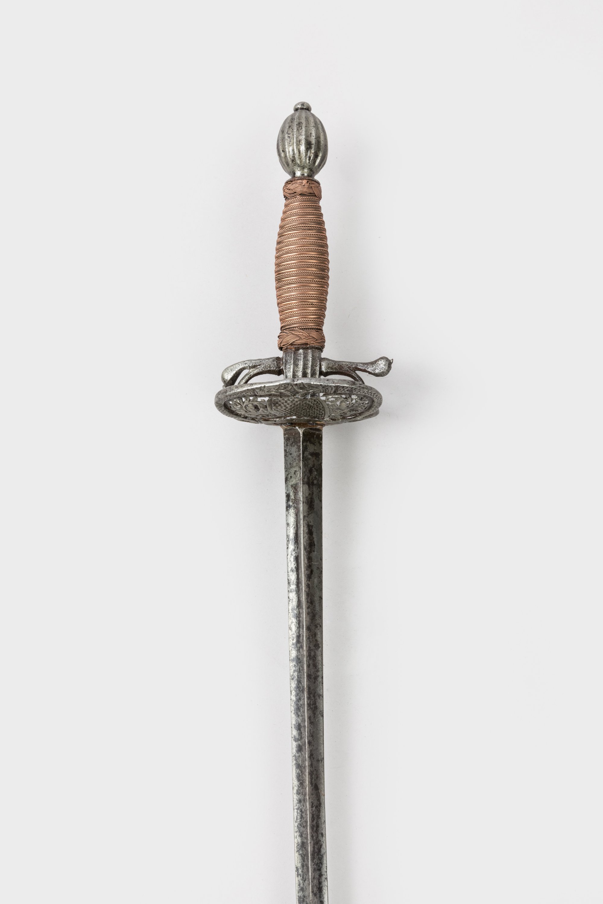 Pommeau en olive à côtes de melon. Monture en fer forgé. Fusée filigranée de cuivre. Garde à pas d’âne ornée de deux coquilles à jours décorées de feuillages et serpents. Lame triangulaire, incrustée « JE TE PERCE ».