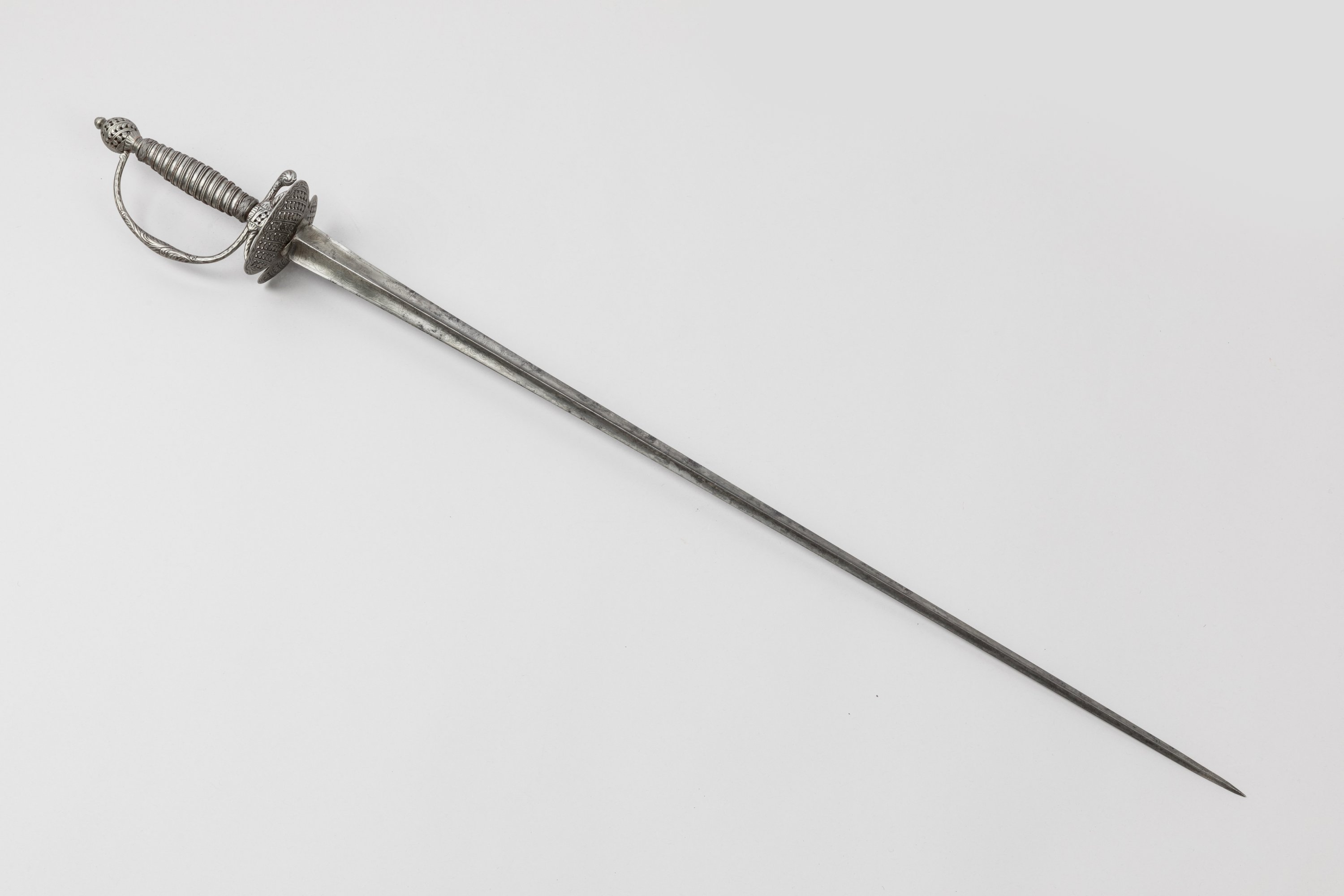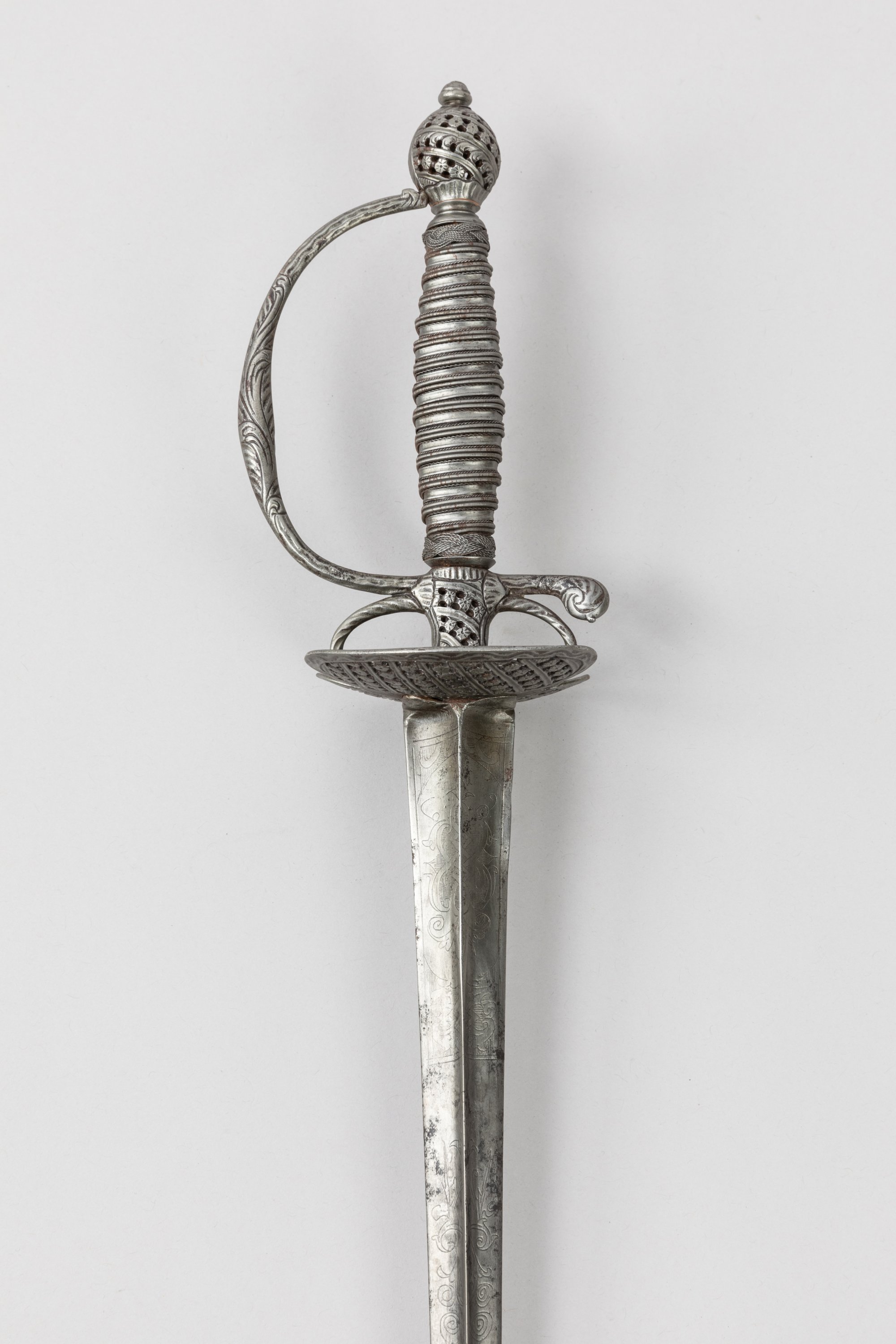 Fusée filigranée et lamée de fer. Pommeau, branche de garde et coquille bivalve a décor à jours de frises et de fleurettes. Monture en fer ciselé. Large lame triangulaire à arête médiane gravée au tiers.
