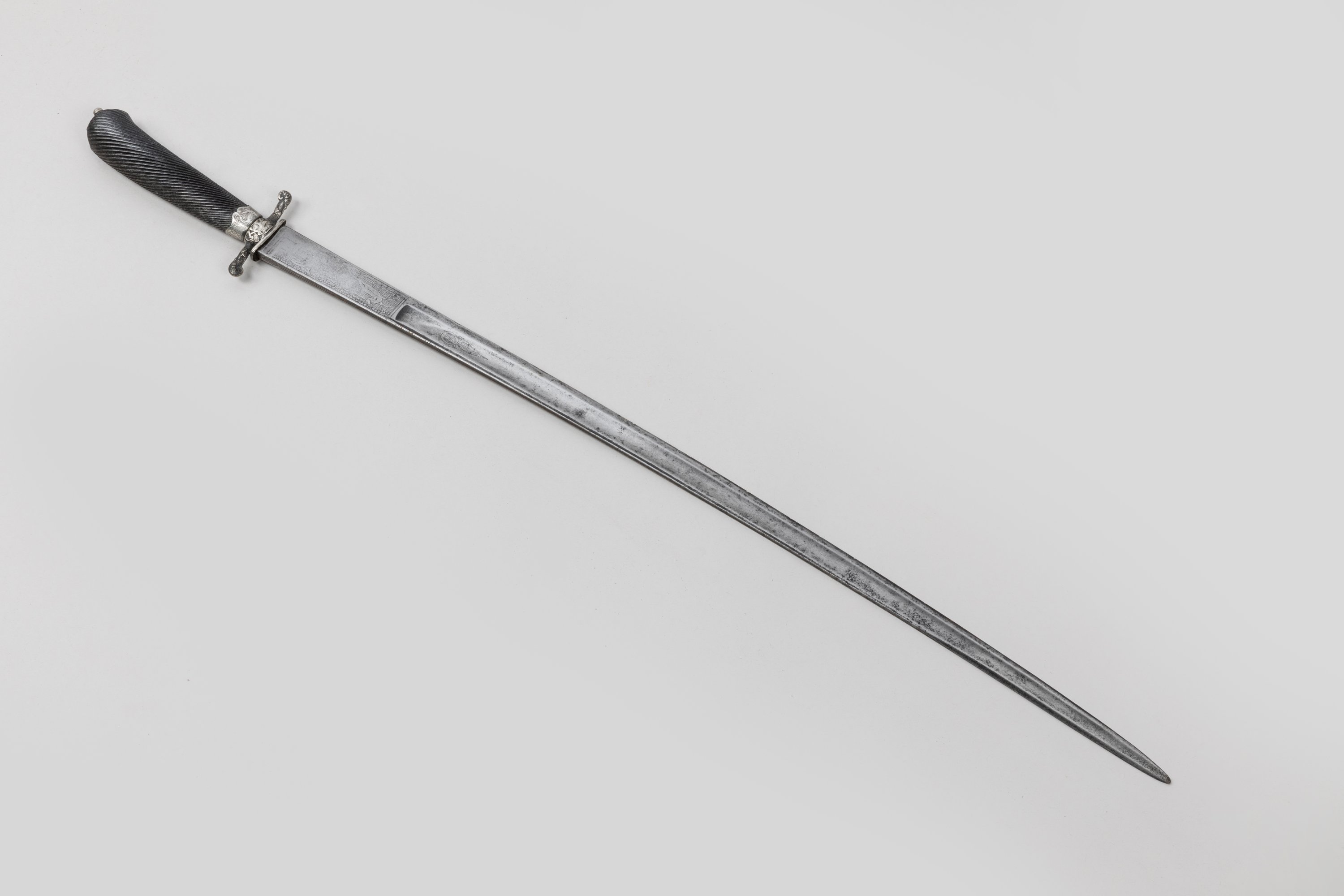Monture en argent, garde à deux quillons. Fusée en ébène spiralé. Lame cintrée, gravée d'animaux et rinceaux.