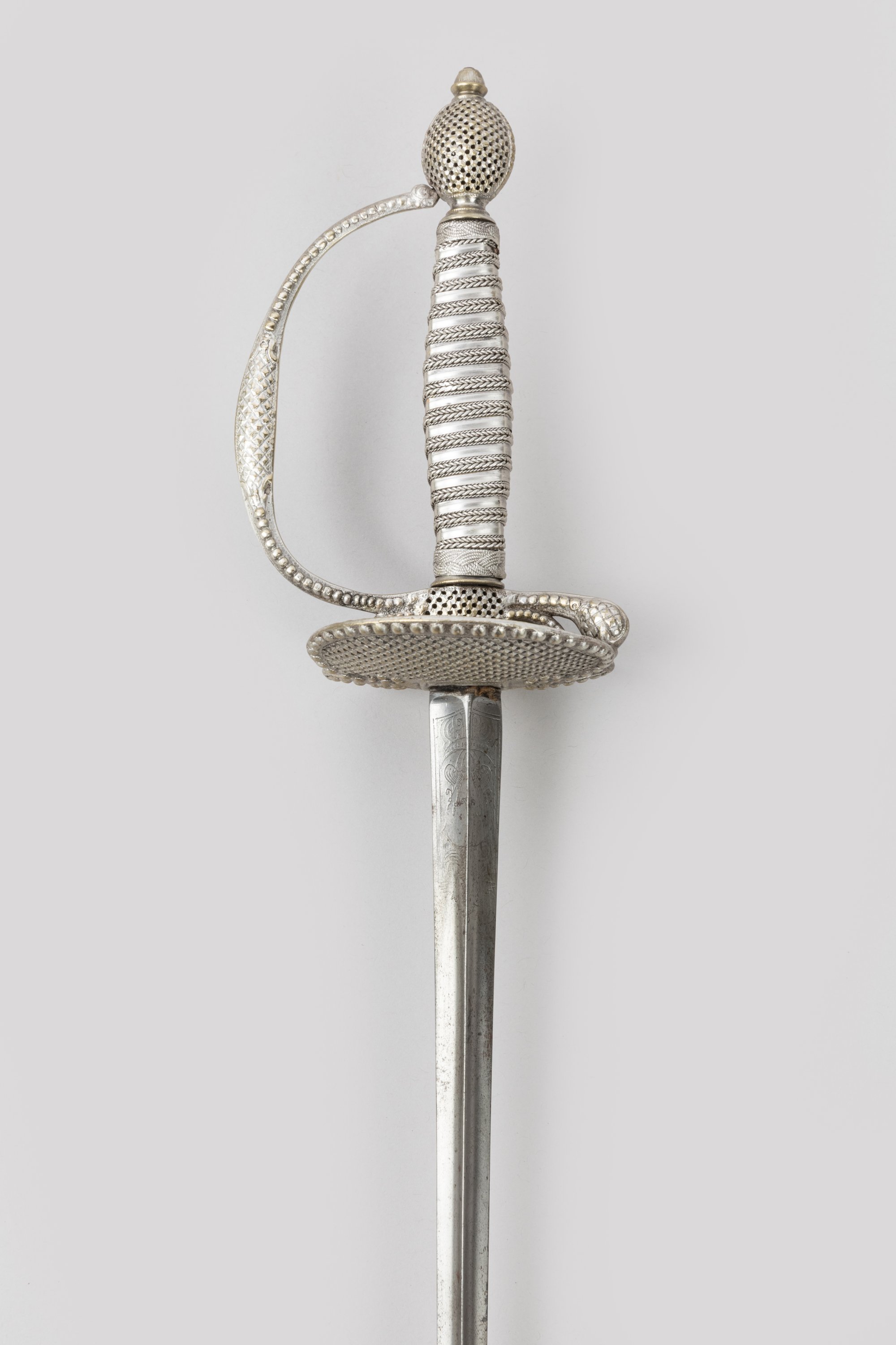 Monture en argent ciselé à pointe de diamant et repercée. Pommeau en olive, fusée filigranée et lamée. Garde à une branche, pas d’âne et coquille bivalve. Lame triangulaire signée au talon " Guilmin Md Fourbisseur à Versailles ".