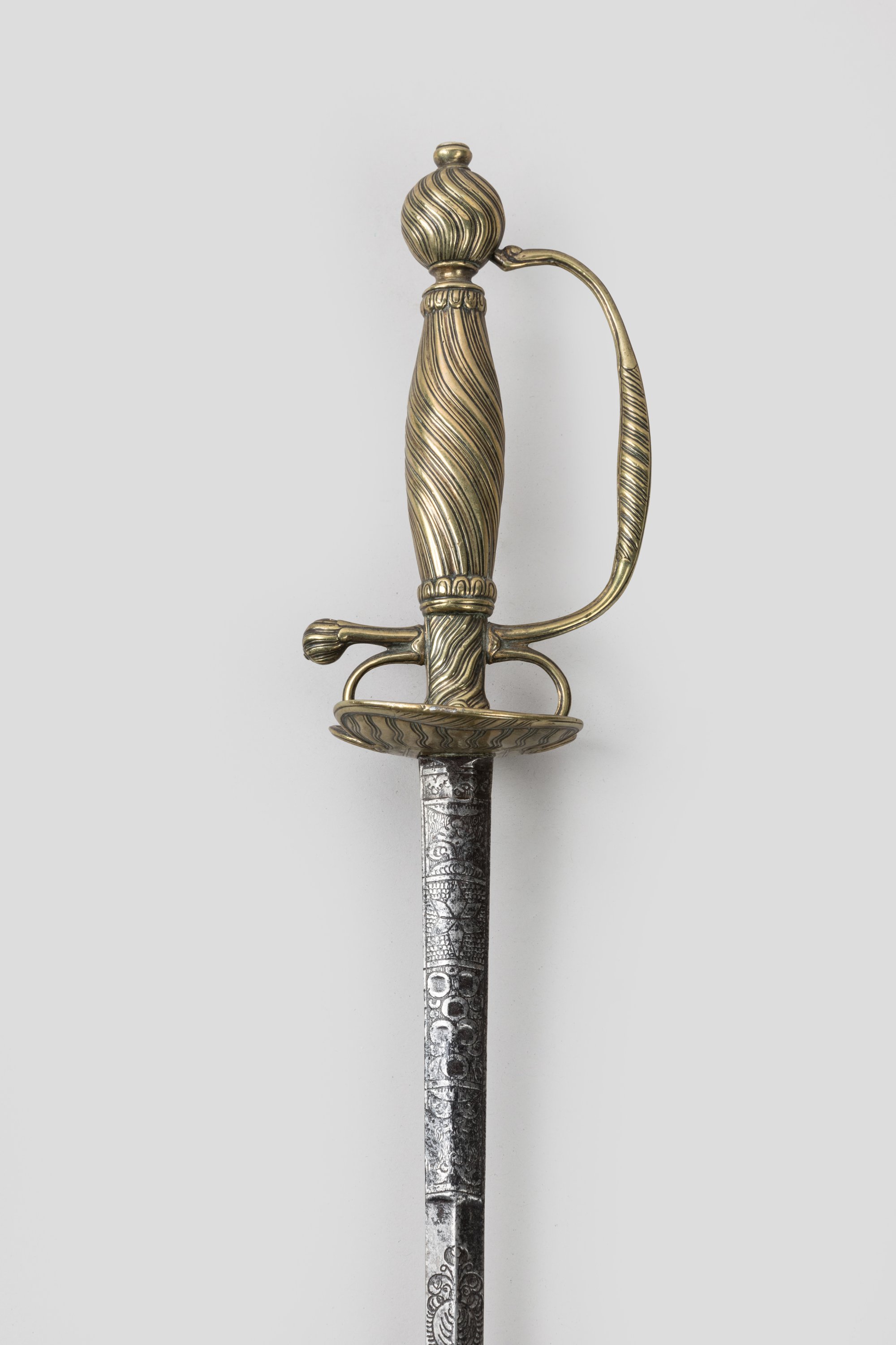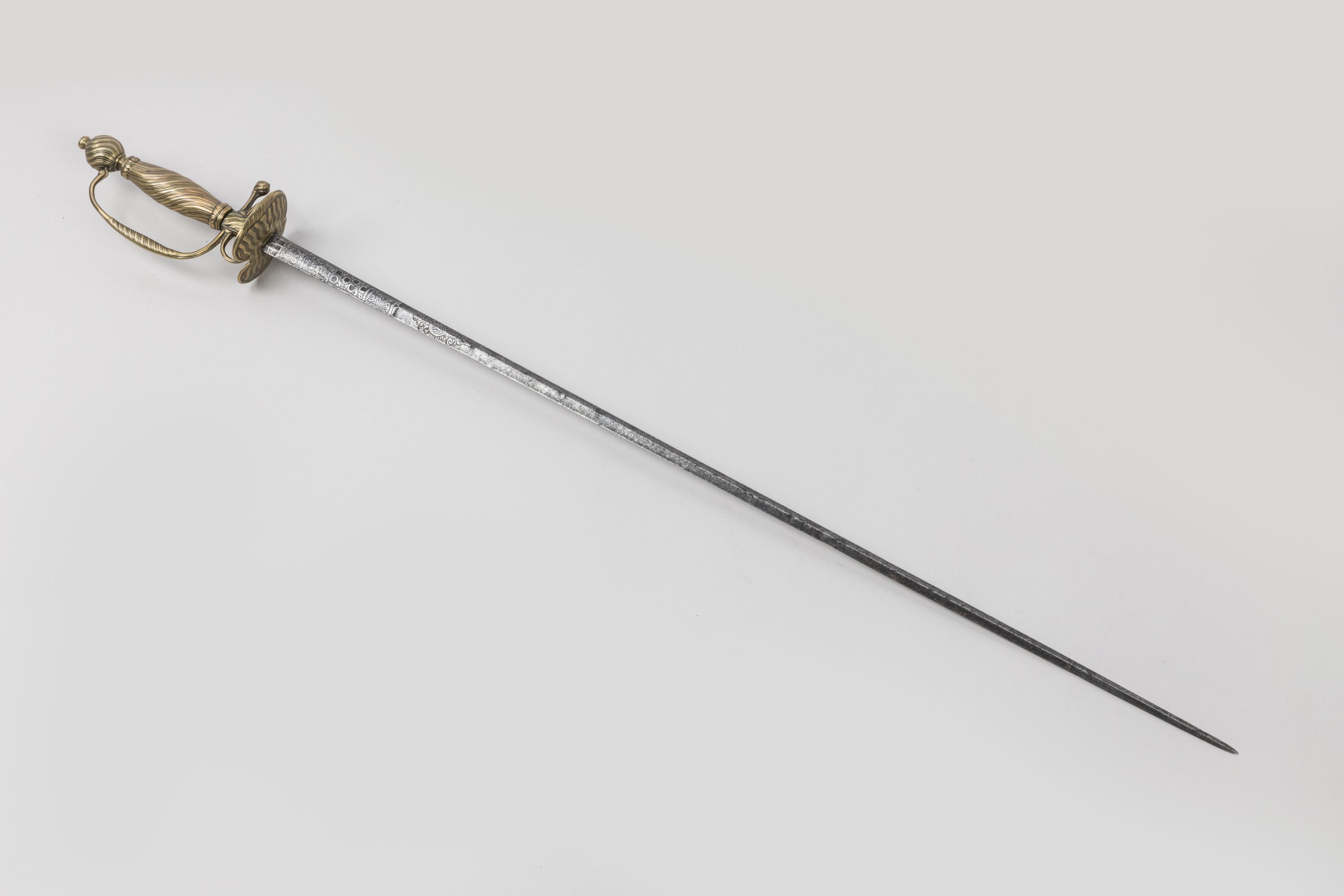 Monture en laiton ciselé. Pommeau rond, fusée, branche de garde, pas d’âne, coquille à décor rainuré. Lame arrondie au talon, gravée au tiers et à arête médiane.