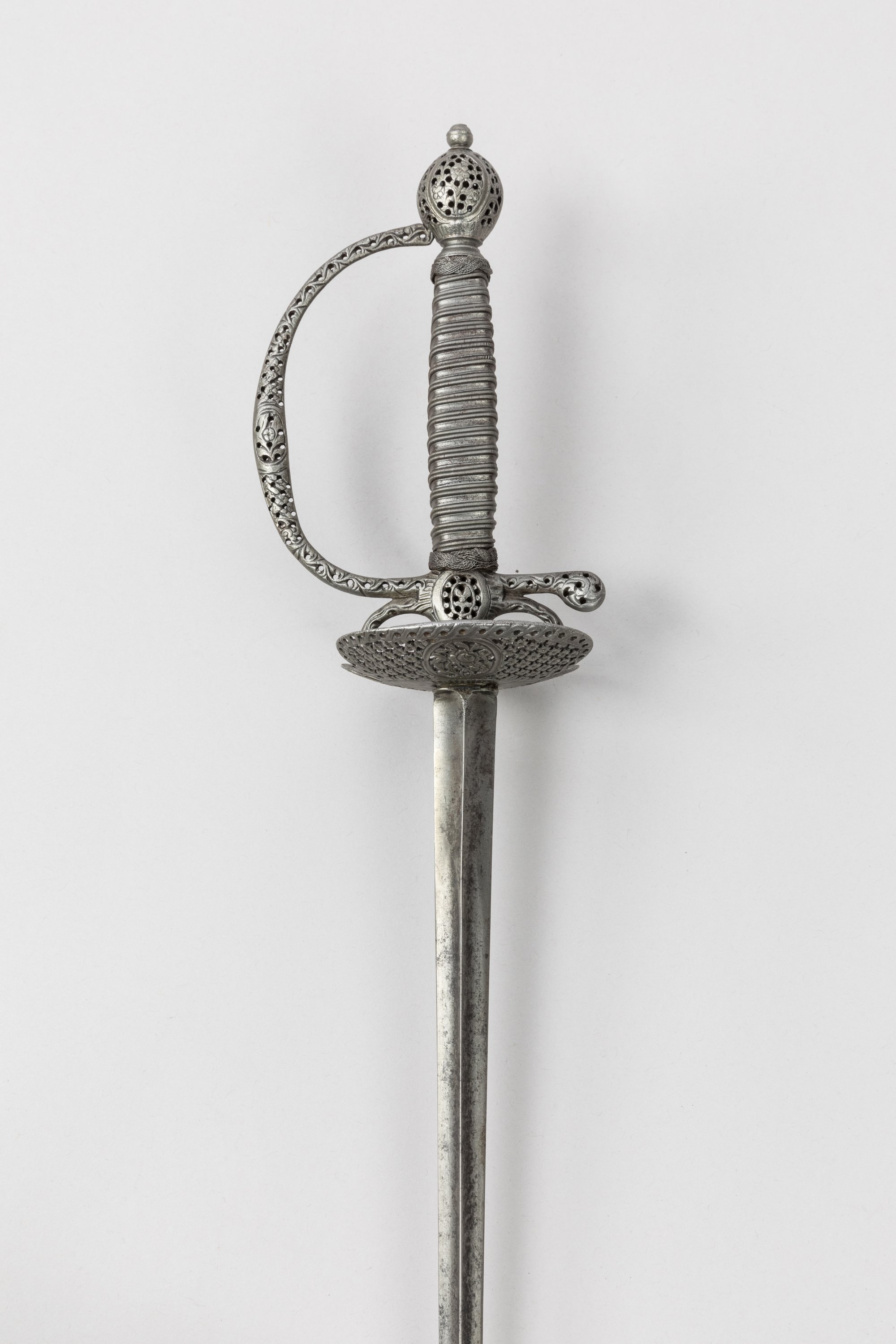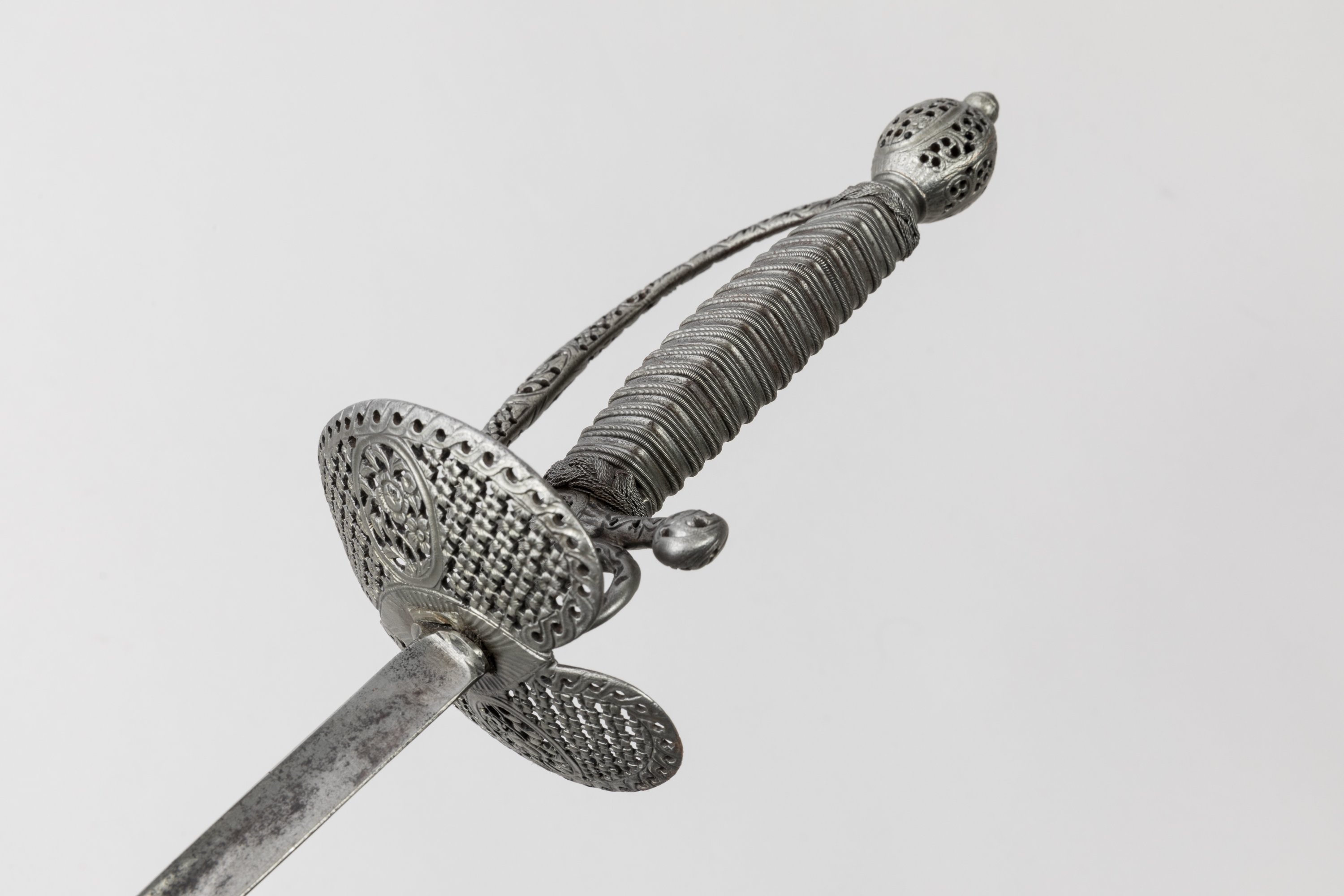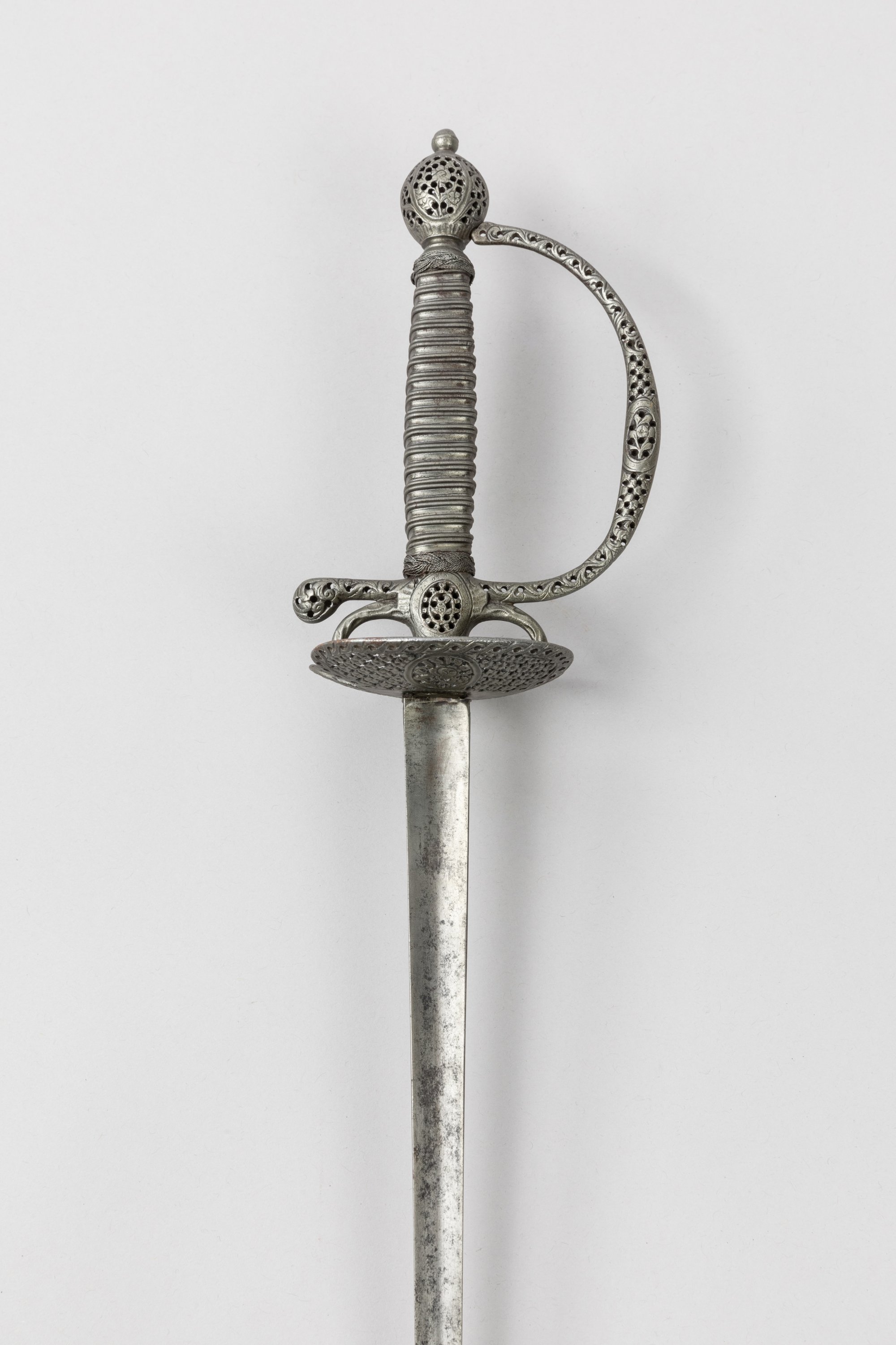 Monture en fer. Fusée filigranée et lamé de fer. Pommeau rond, branche de garde, pas d’âne et coquille travaillée à jours de frises de fleurettes et médaillons. Lame triangulaire.
