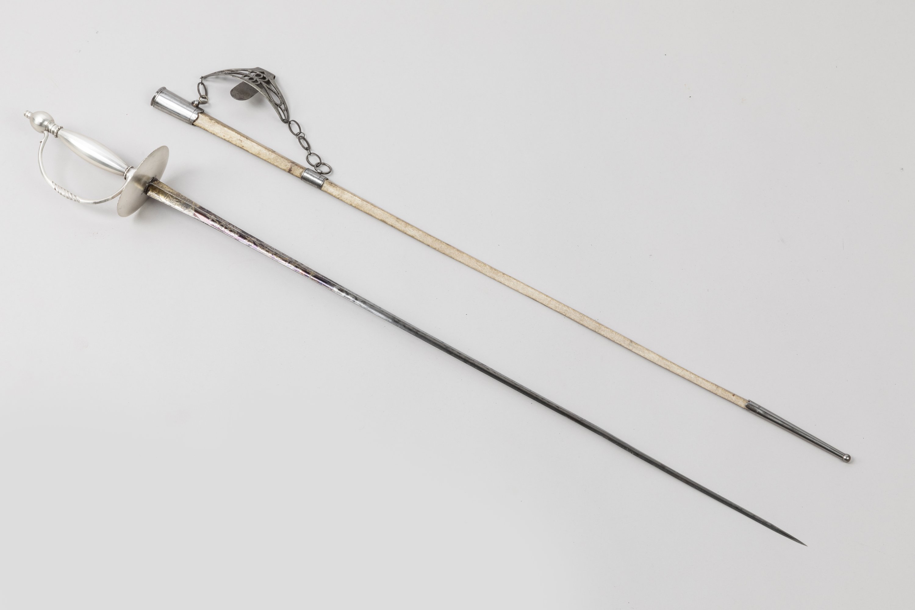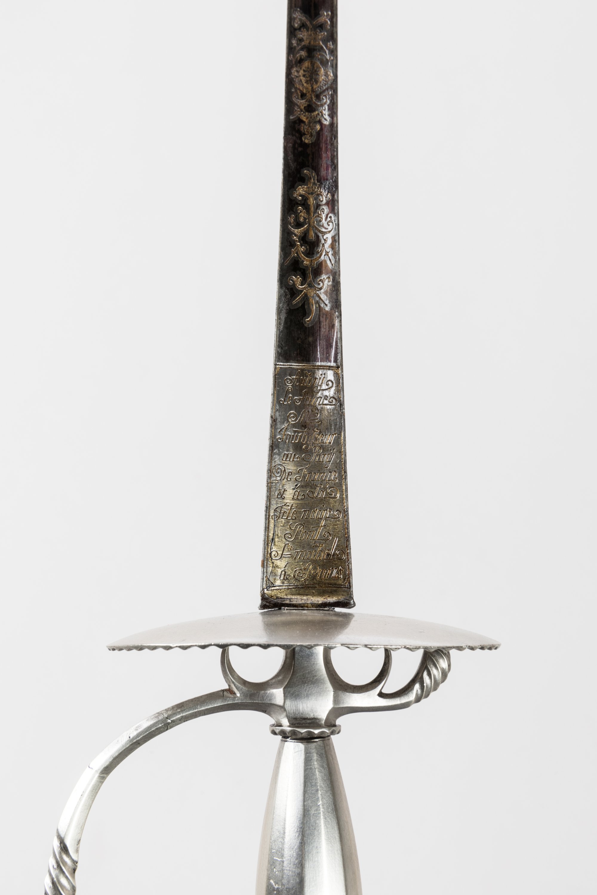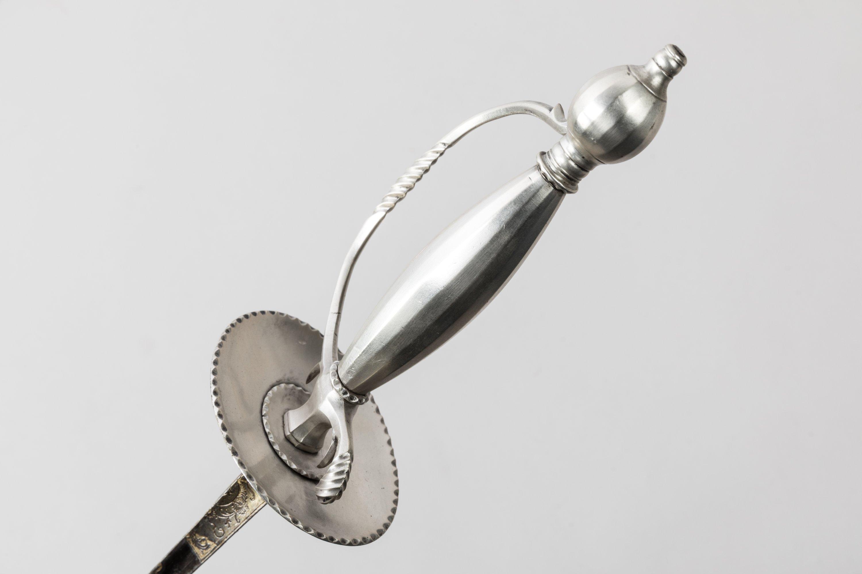 Monture en argent pommeau et fusée à pans, garde une branche, pas d’âne et coquille à décor dentelé. Lame triangulaire gravée, dorée et bleuie au tiers et marquée « Aubrÿ Le Jeune Md Fourbisseur au Roÿ de France et à la tête noire Pont St Michel à Paris».