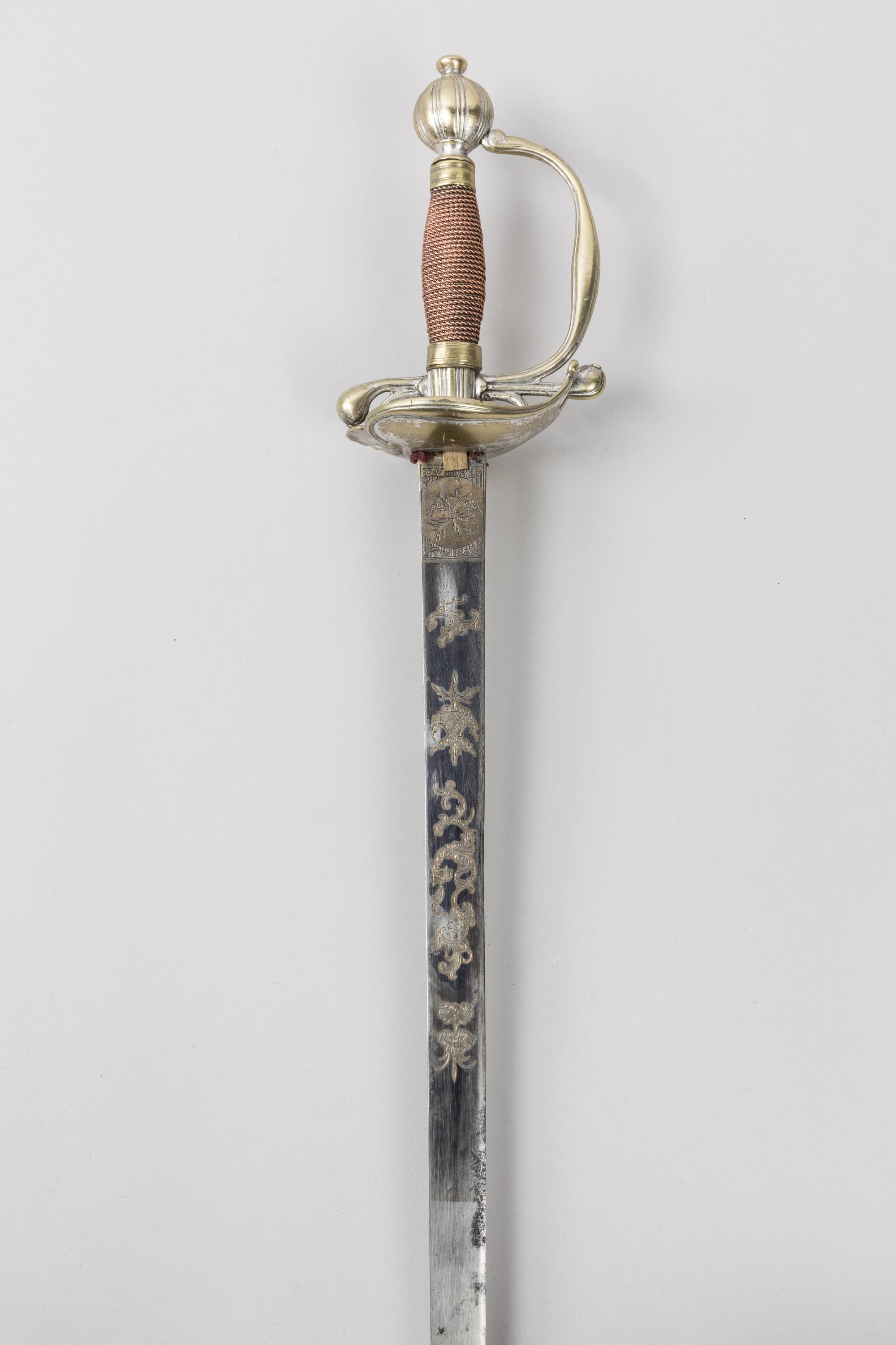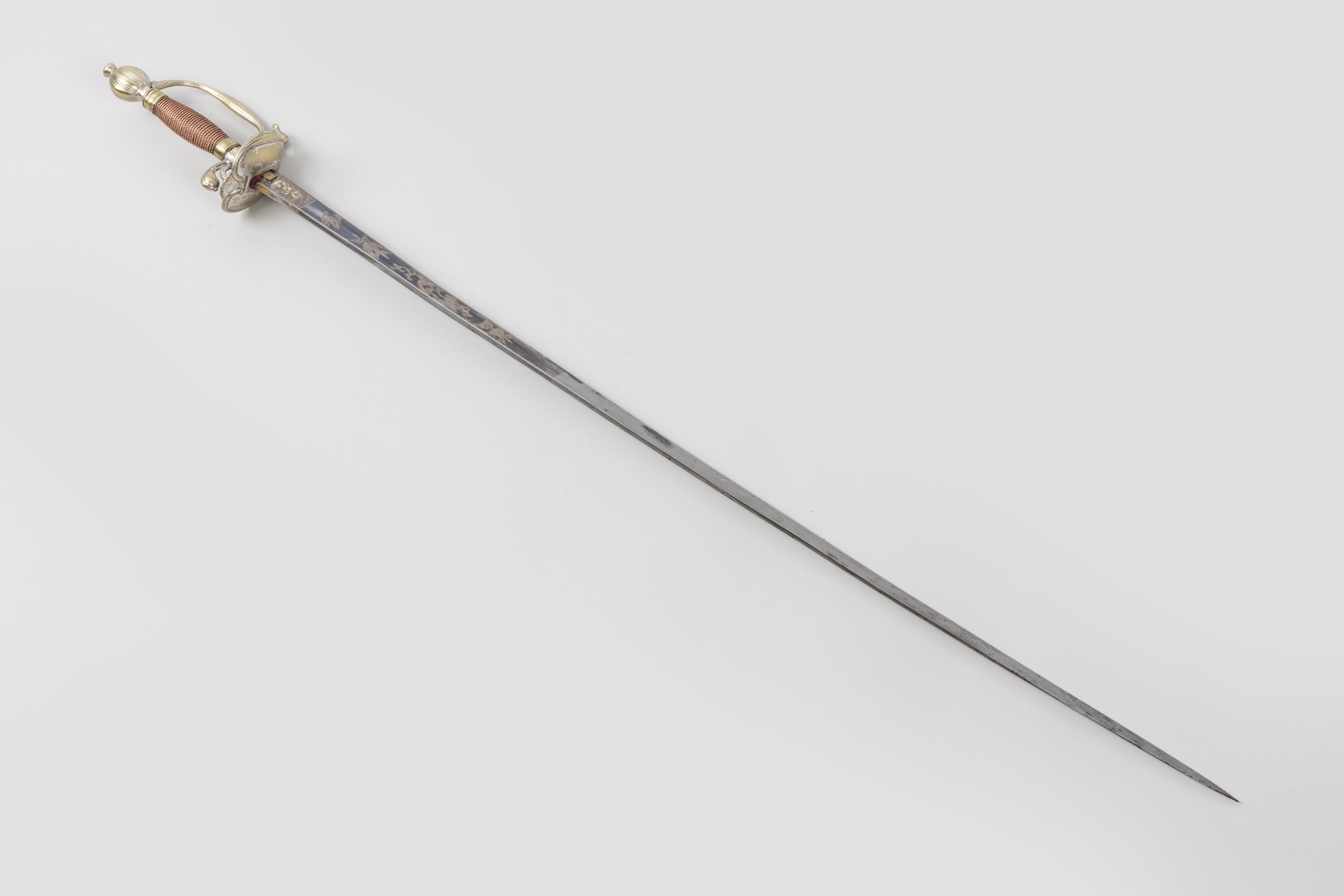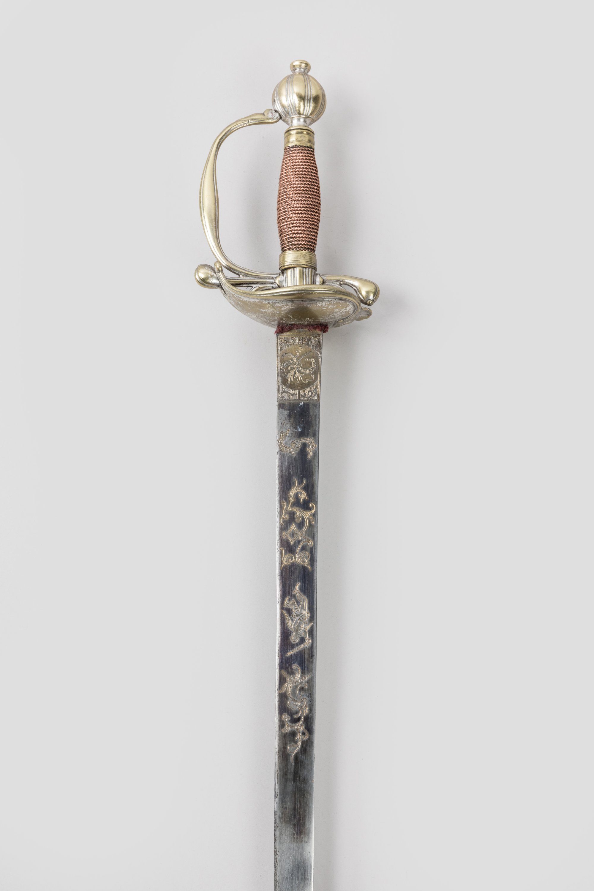 Fusée filigranée de cuivre. Monture en bronze décoré au trait avec restes d’argenture. Pommeau rond, garde à une branche, pas d’âne et deux quillons boulés, et coquille. Lame à dos plat contre tranchant, gravée, dorée et bleuie au tiers.