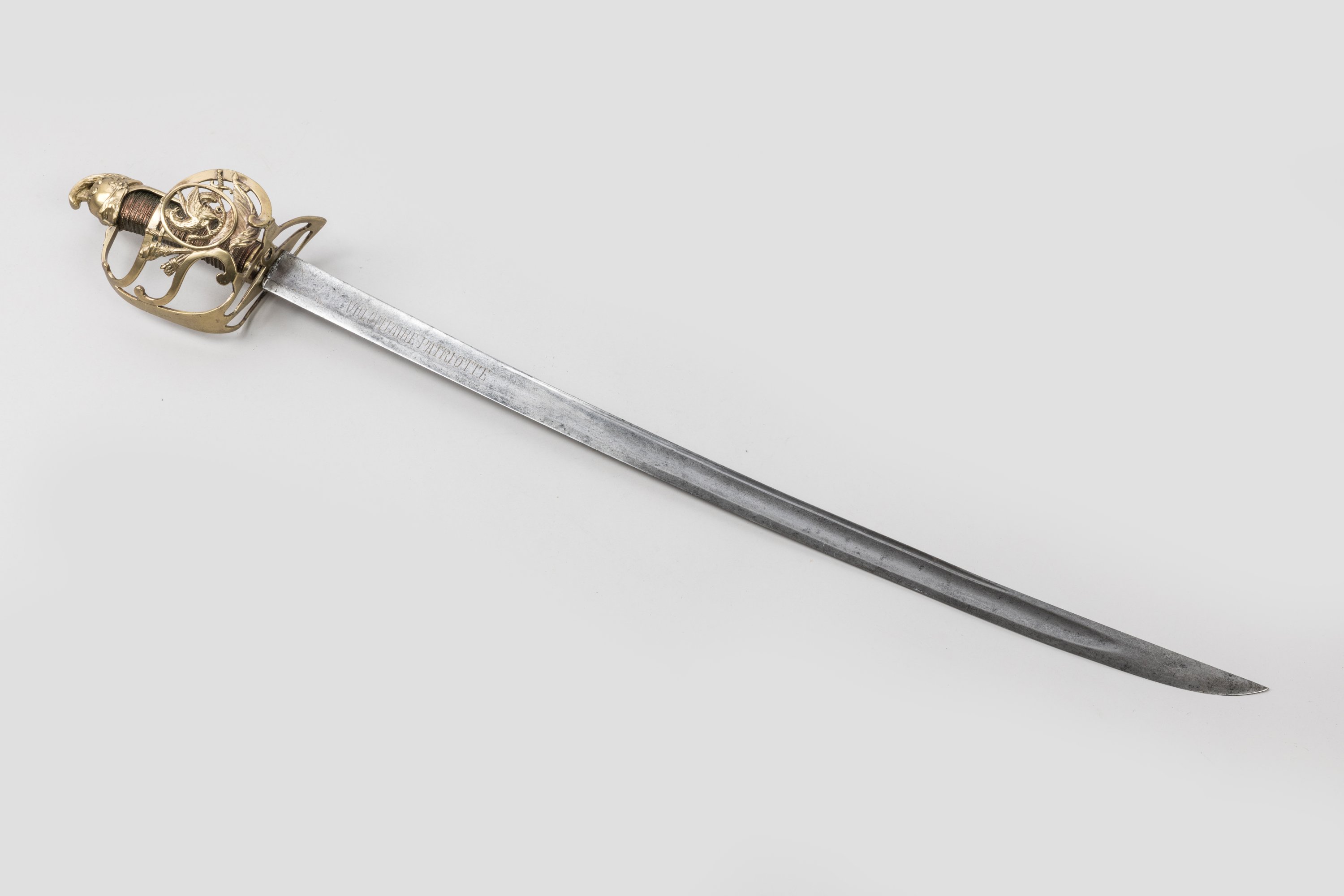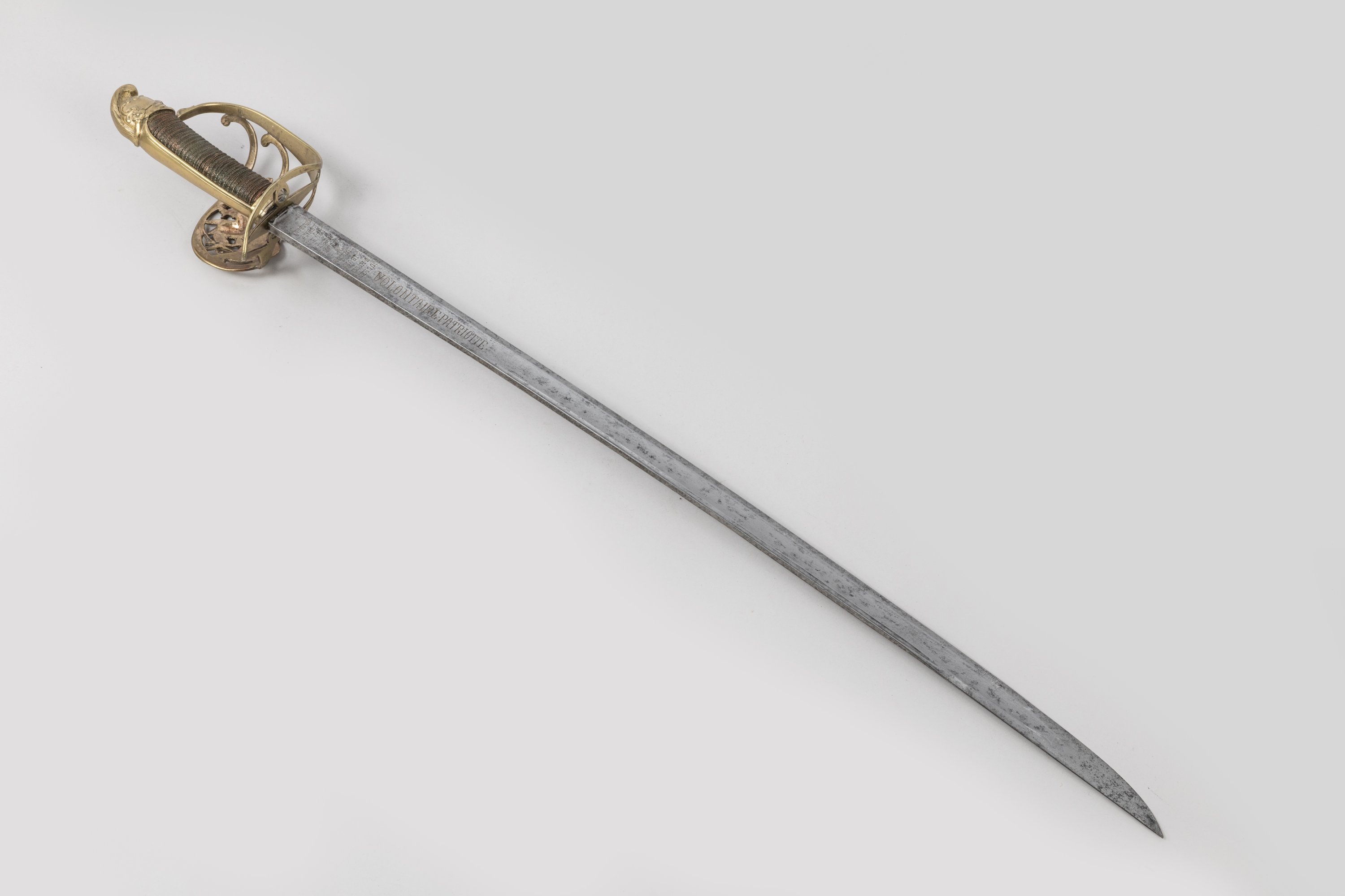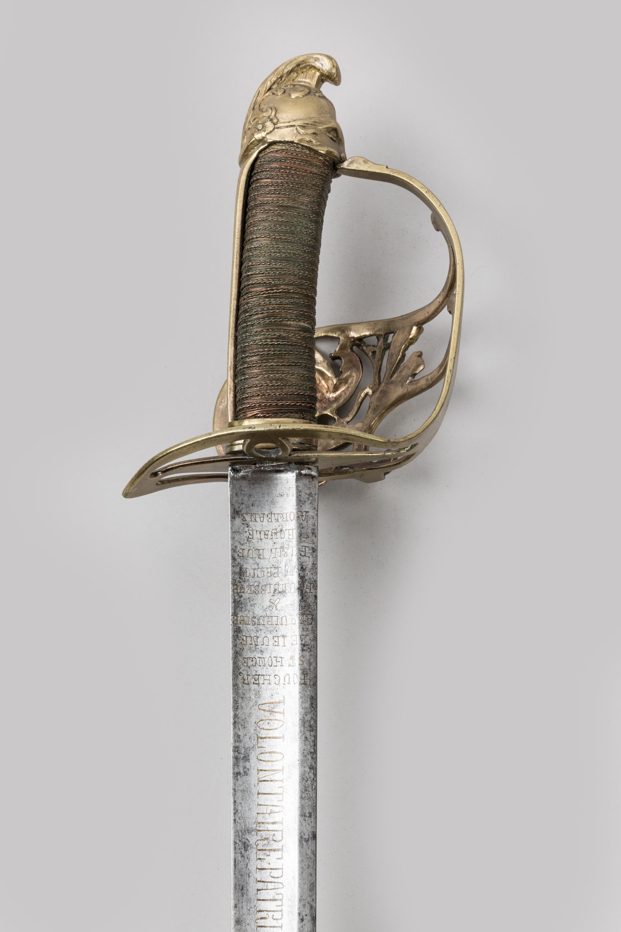 Calotte à longue queue surmontée d’un casque empanaché. Poignée entièrement filigranée de cuivre. Garde à une branche et coquille à médaillon ovale entourée de trophées d’armes et d’un coq tenant dans ses pattes un serpent. Lame cintrée à dos plat, contre-tranchant et gouttière gravée signée « Fouchet Saint-Honge le Jeune arquebusier et fourbisseur au Petit Fusil, rue royale d’Orléans », gravée sur les deux faces « Volontaires Patriotes ».