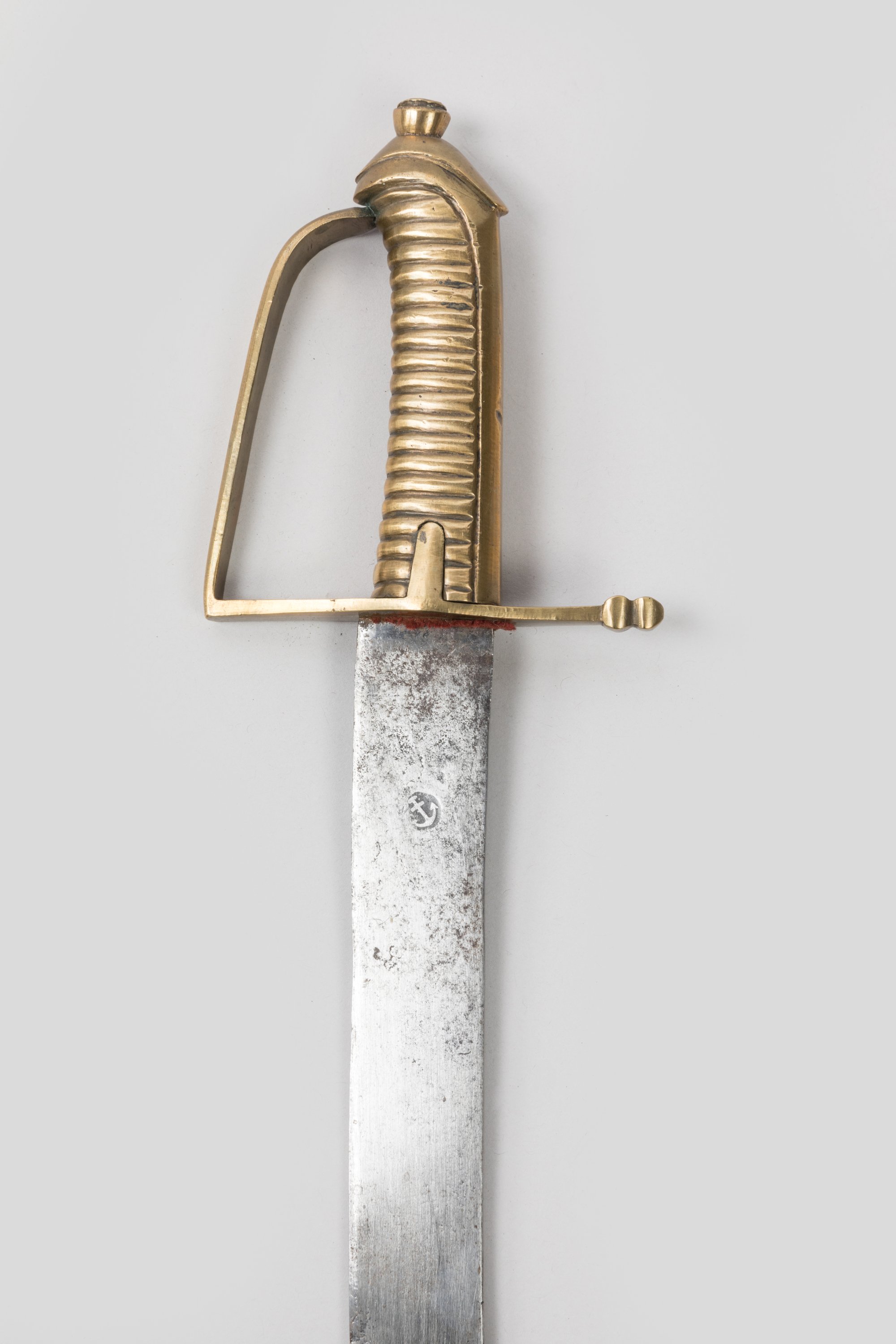 Monture en bronze, garde à une branche. Lame courbe frappée d’une ancre de marine.