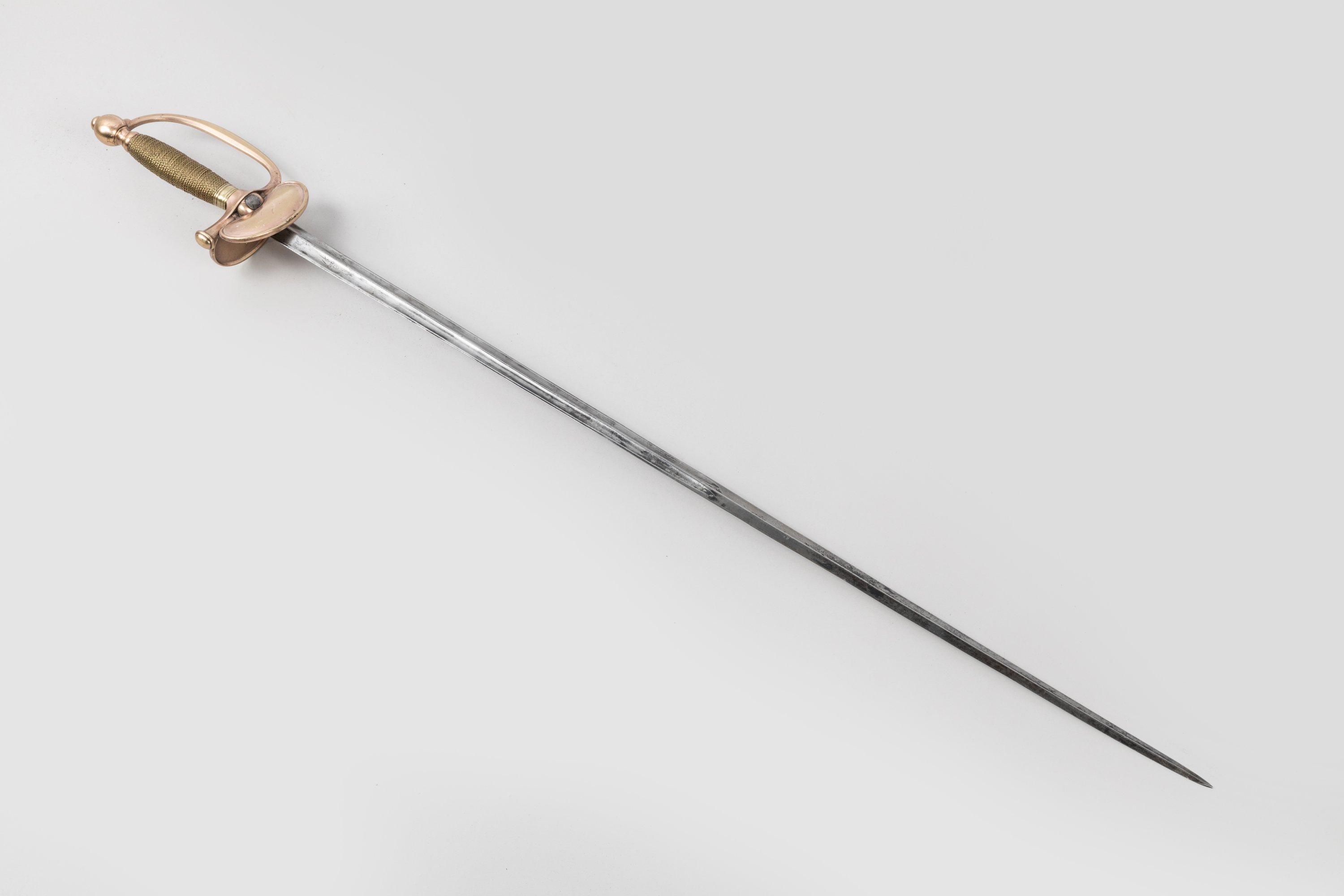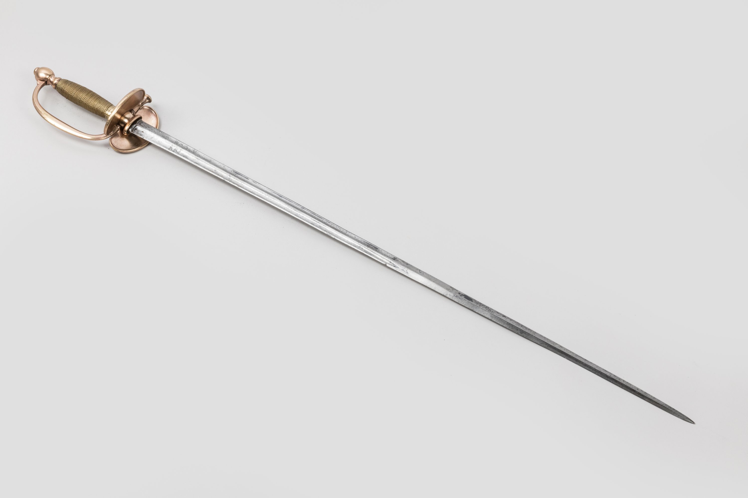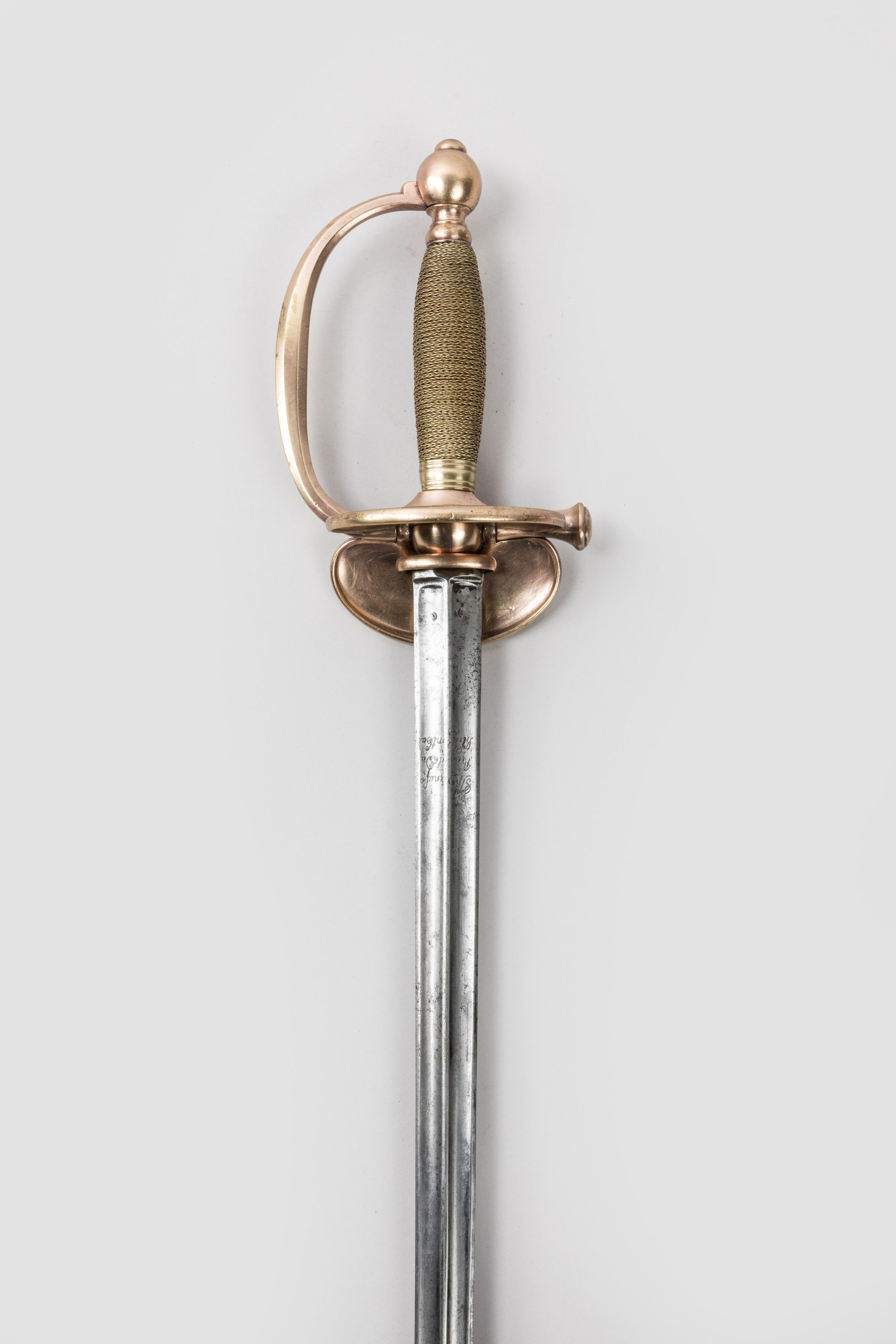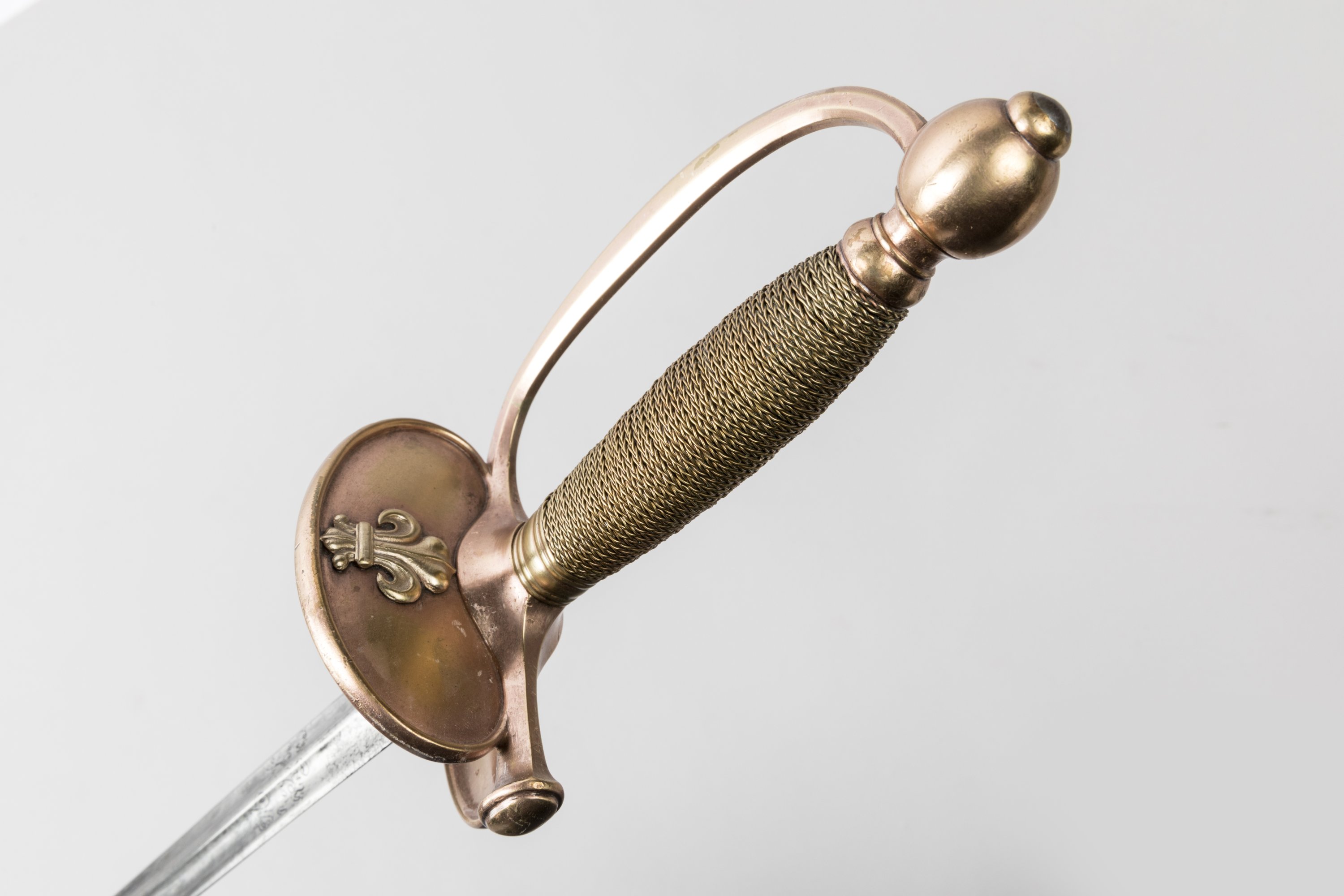 Fusée filigranée de laiton. Pommeau rond, branche de garde, clavier à la fleur de lys frappé « MANCEAUX », contre-clavier rabattable en laiton cuivré. Lame à arête médiane et doubles pans creux.