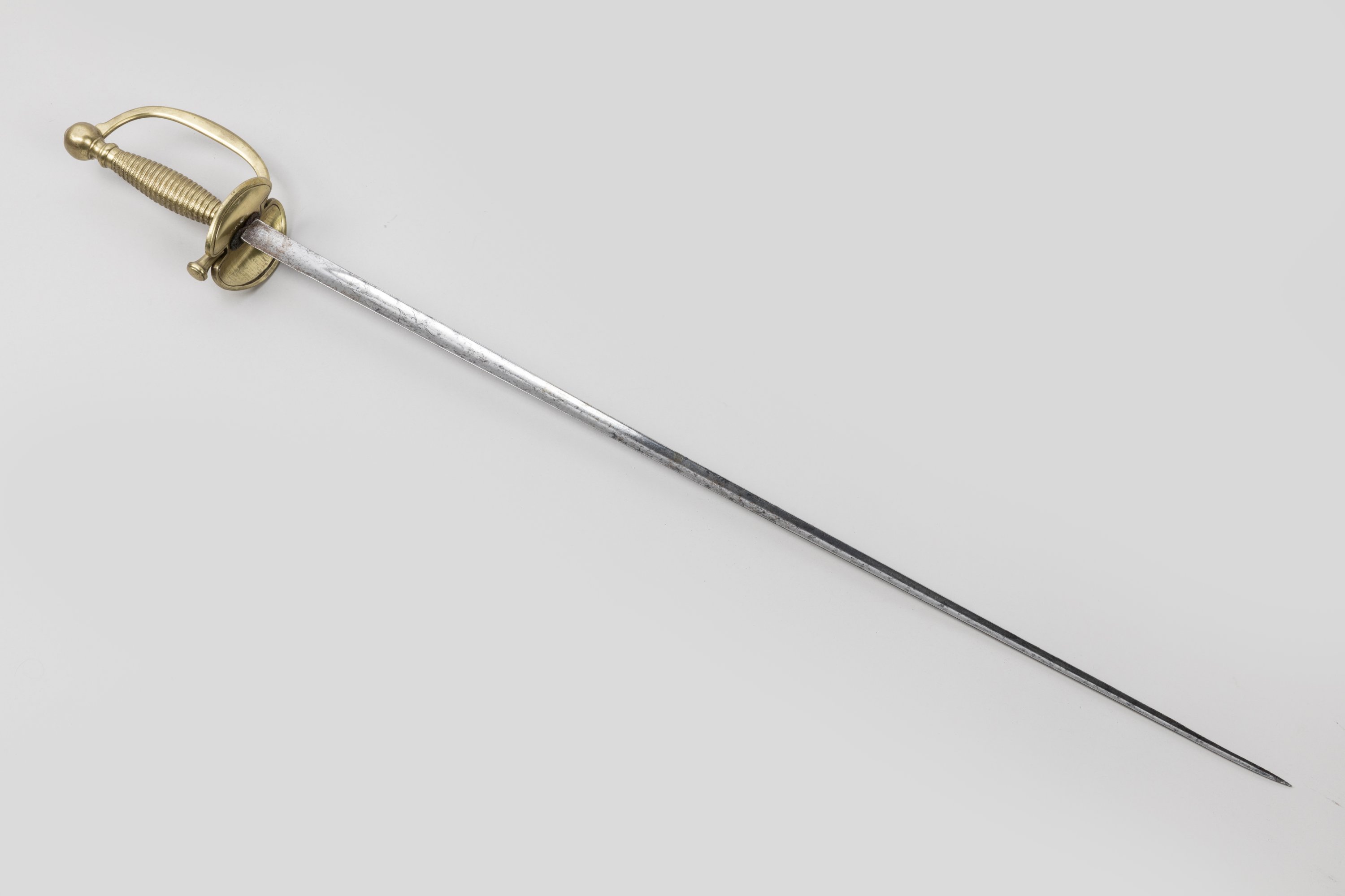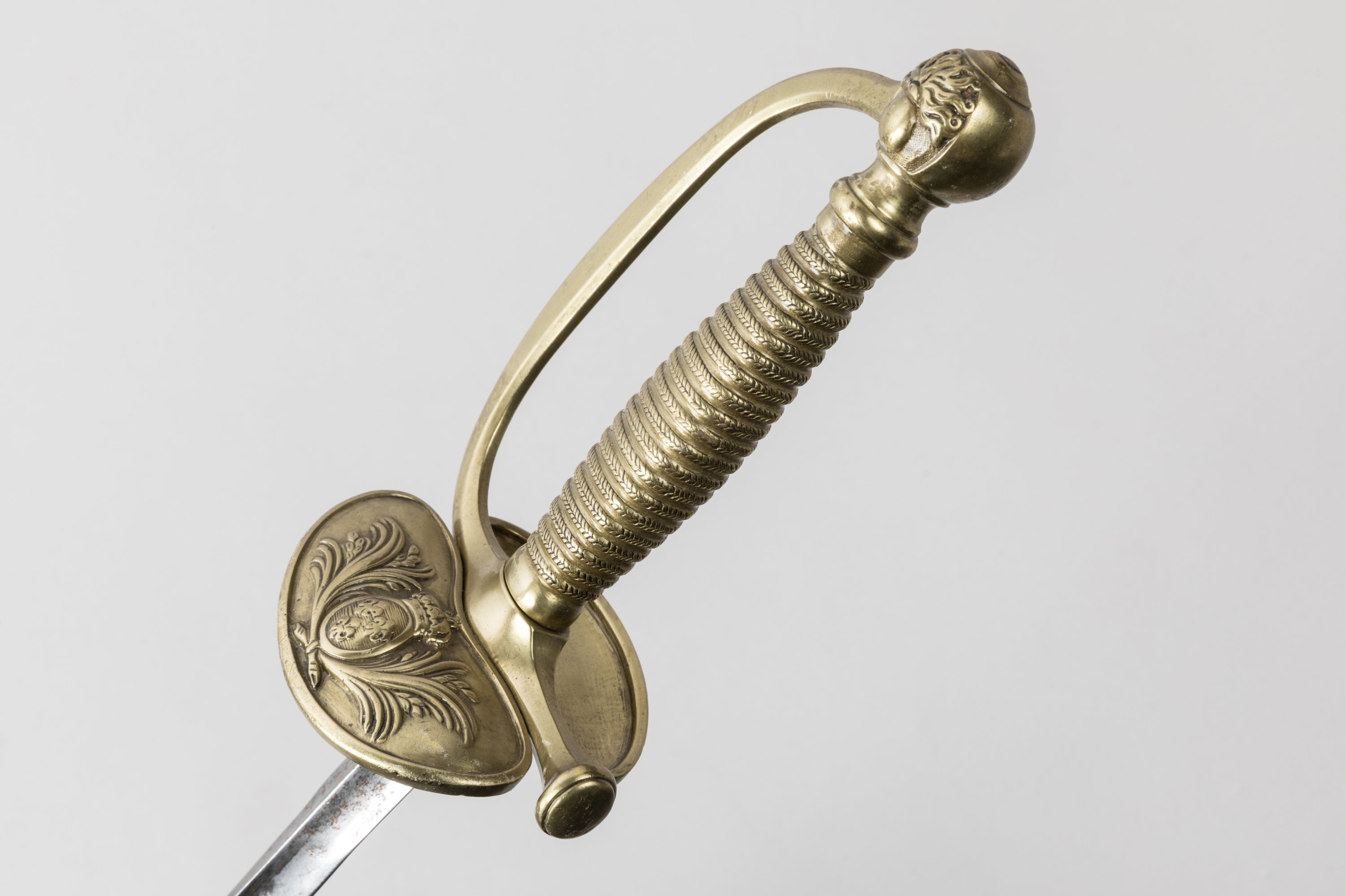 Pommeau à la grenade, filigrane simulé, branche de garde et clavier aux armes de France entouré de palmes, en laiton. Lame triangulaire.