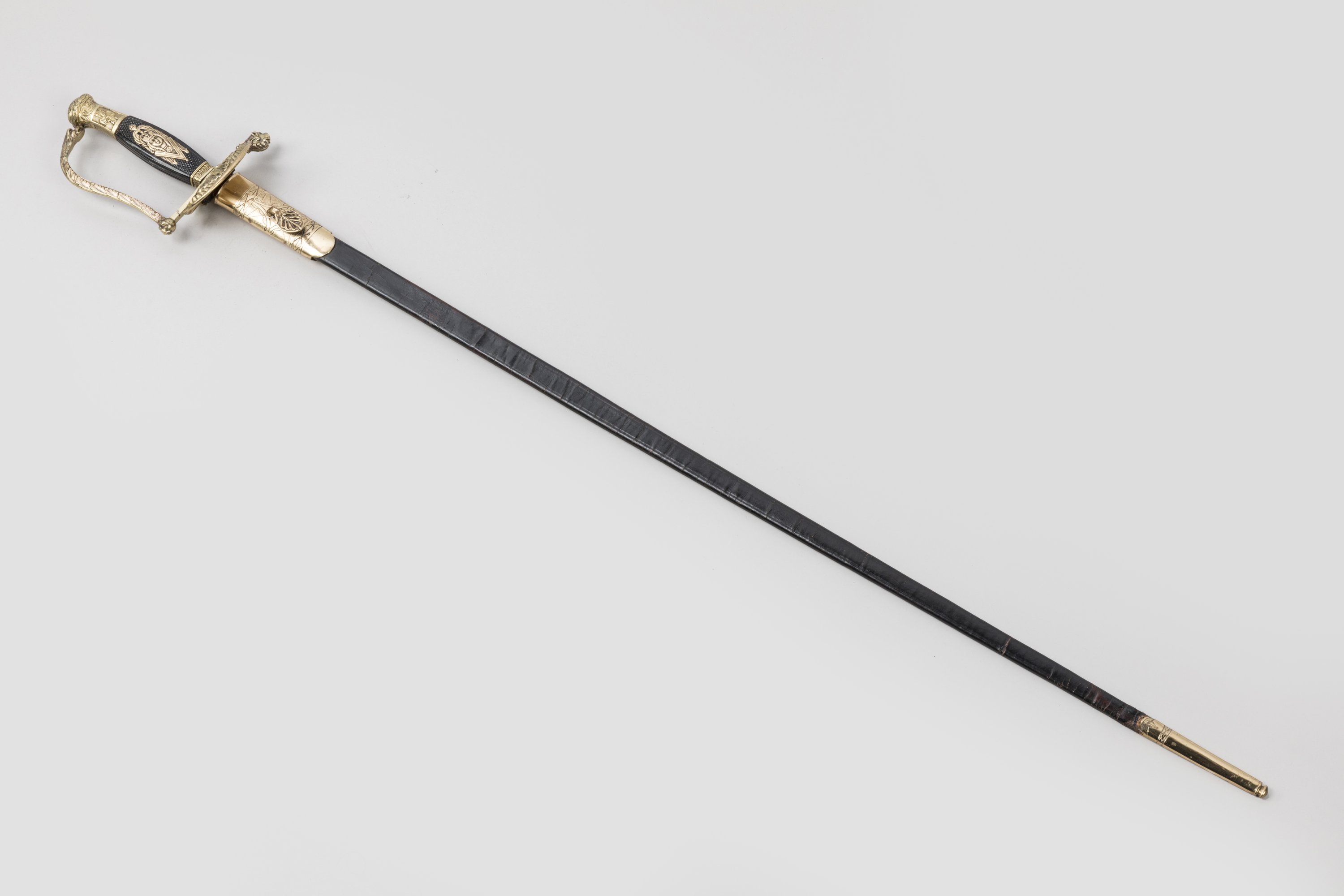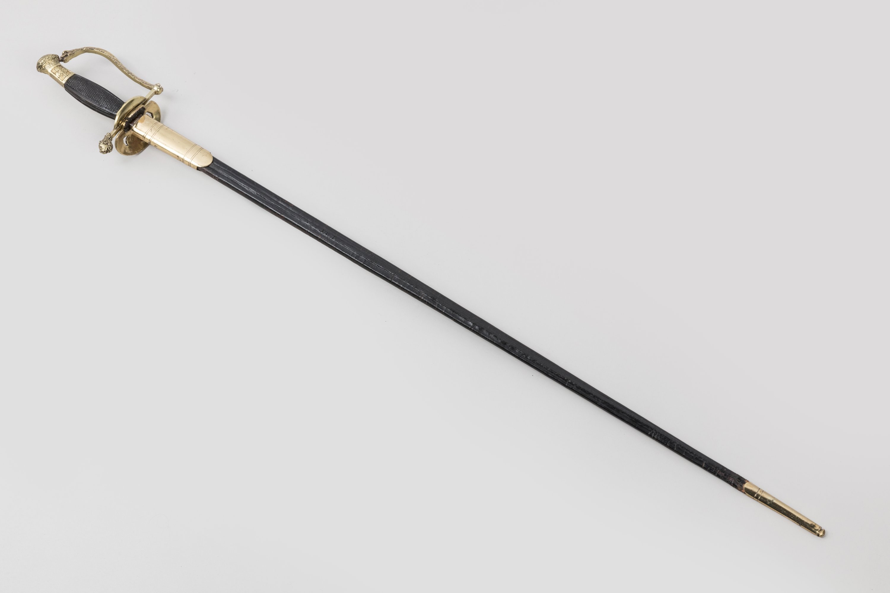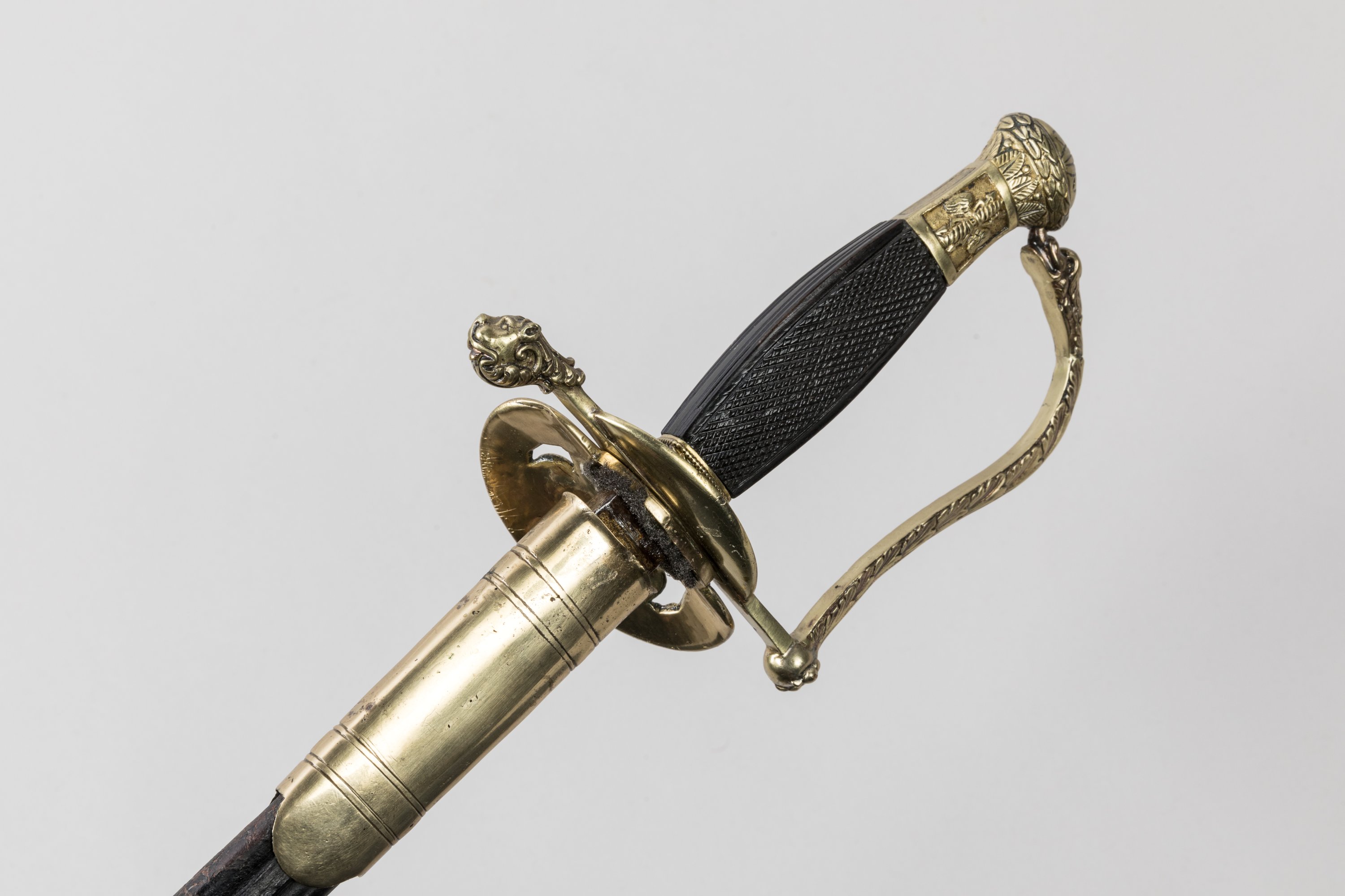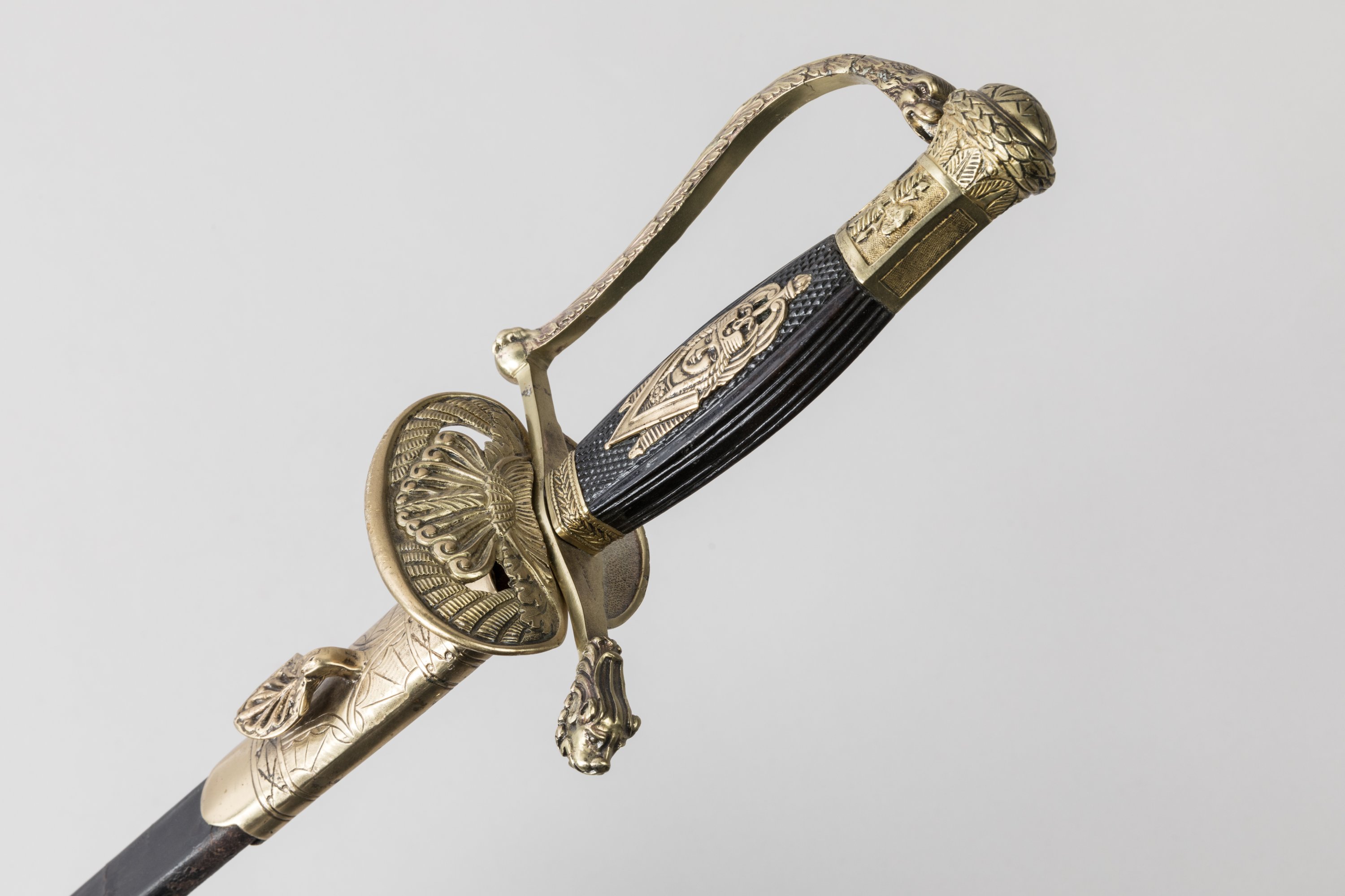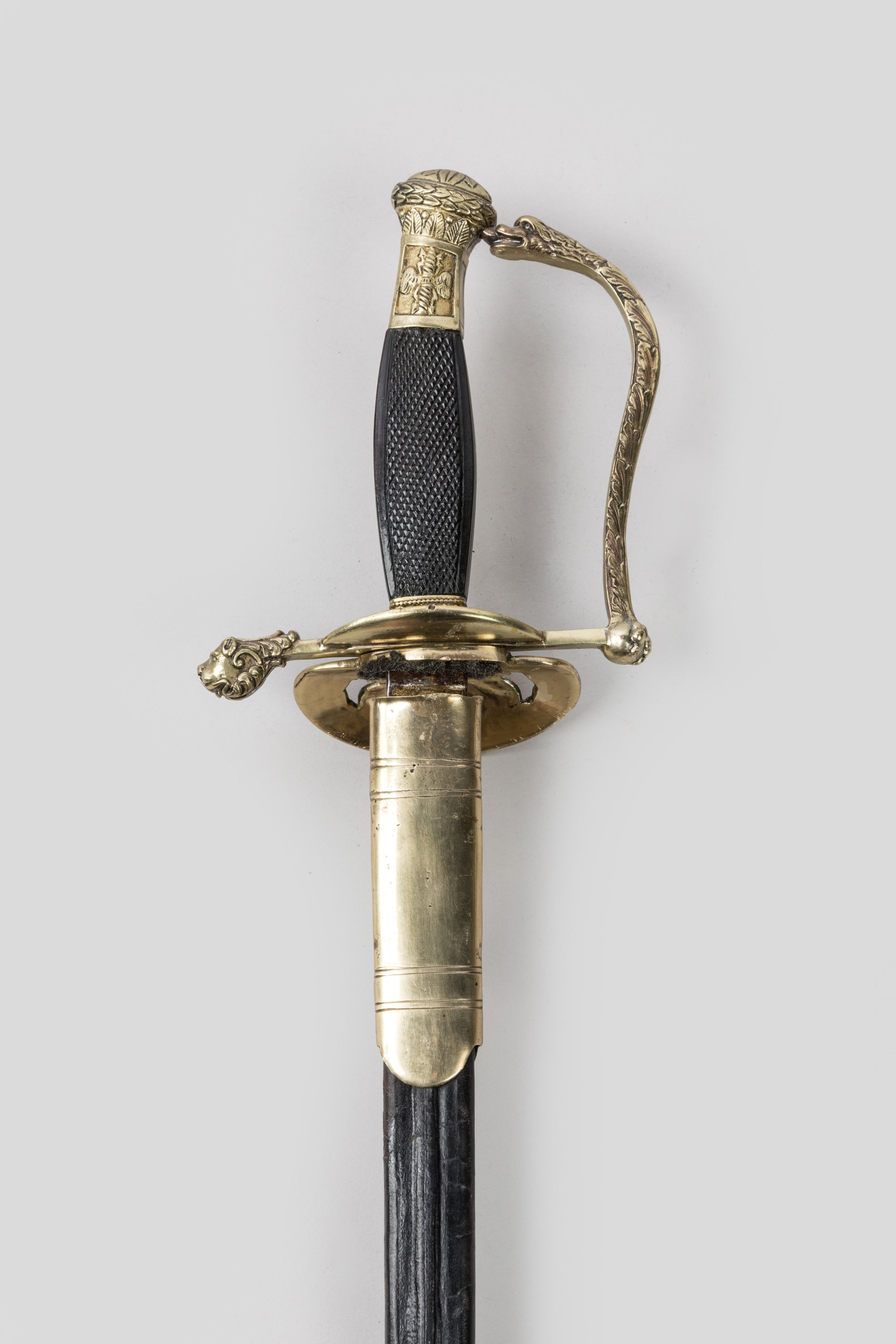 Fusée en ébène quadrillé, ornée d’un motif d’Isis Pharia. Monture en laiton, garde à une branche en serpent, quillon en mufle de lion et clavier à décor de toile d’araignée ajourée. Lame à dos, bloquée dans un fourreau en cuir à deux garnitures en laiton gravé.