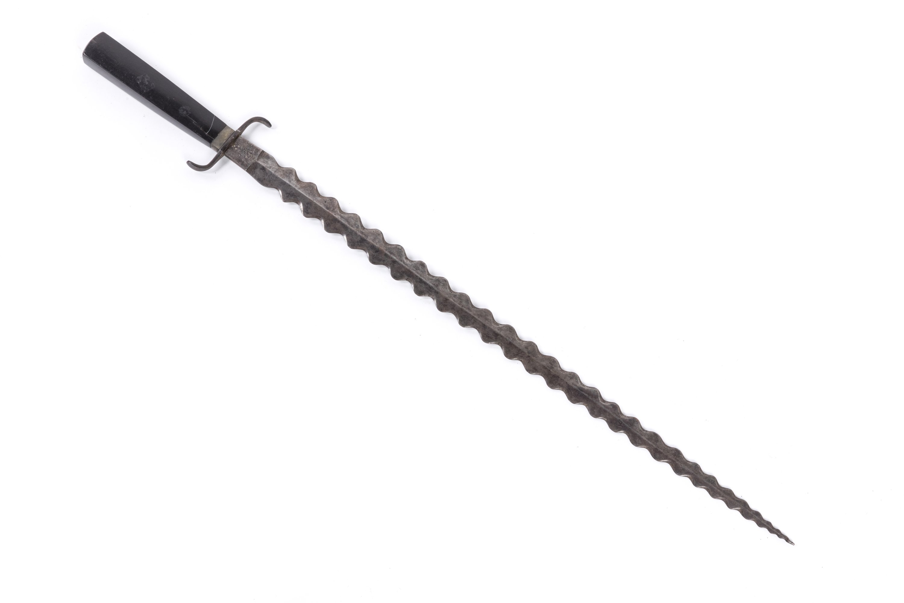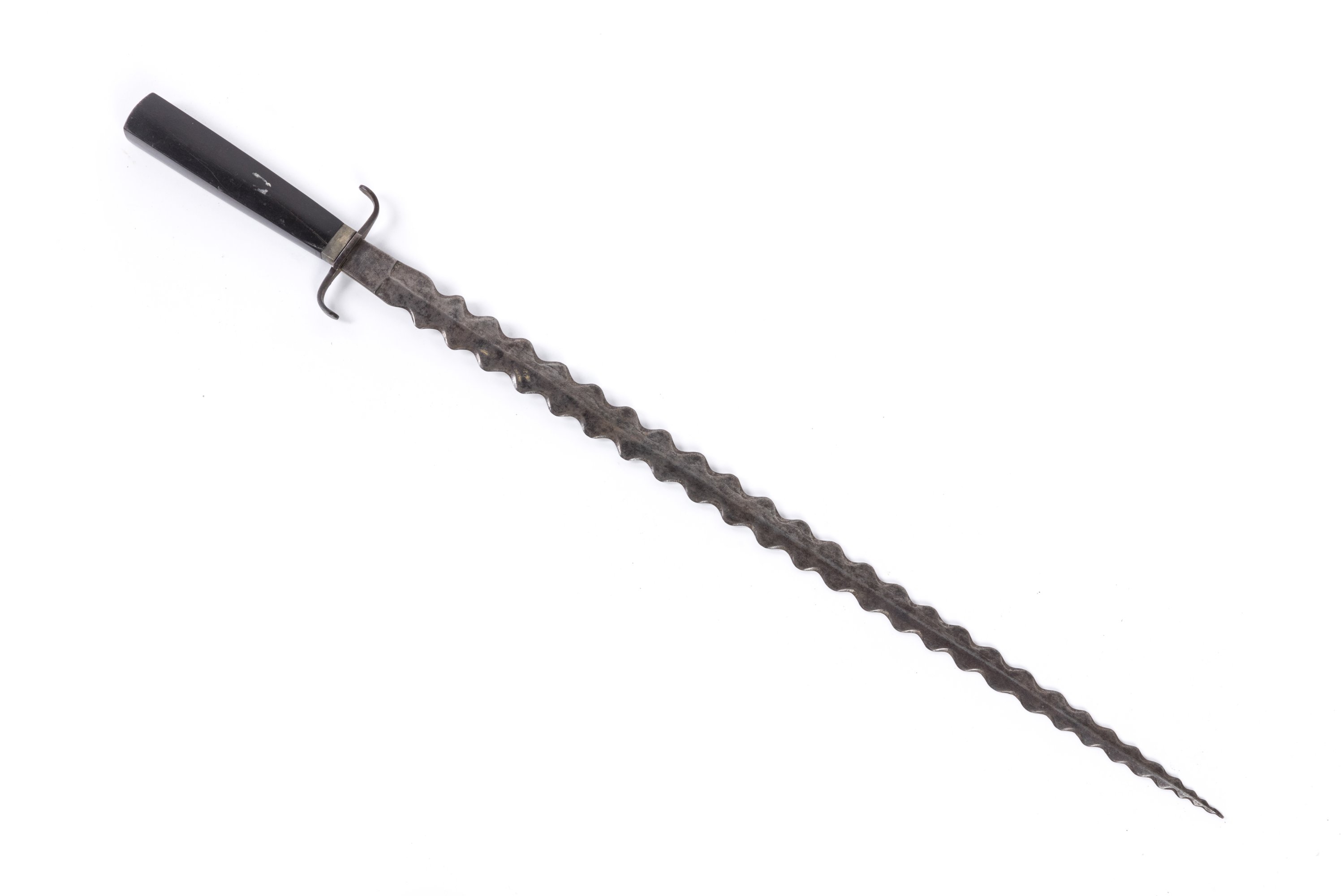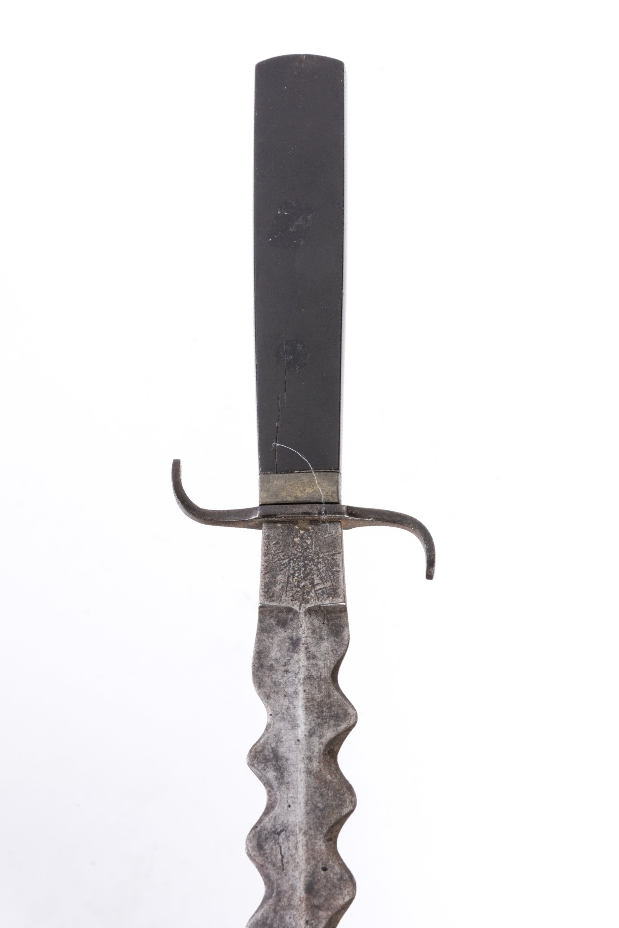 Poignée en ébène, garde en fer, à deux quillons inversés. Longue lame mouvementée à arête médiane.