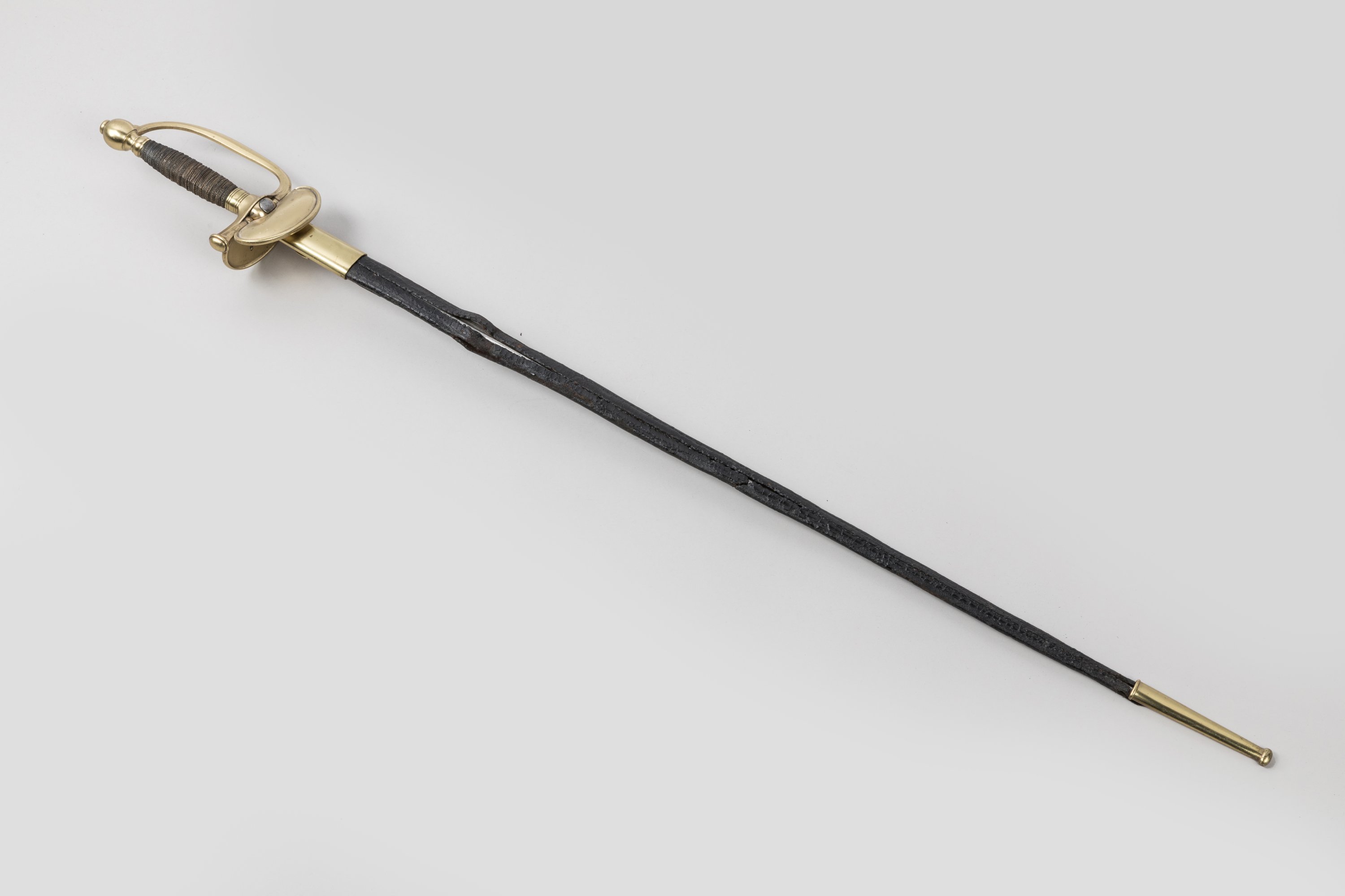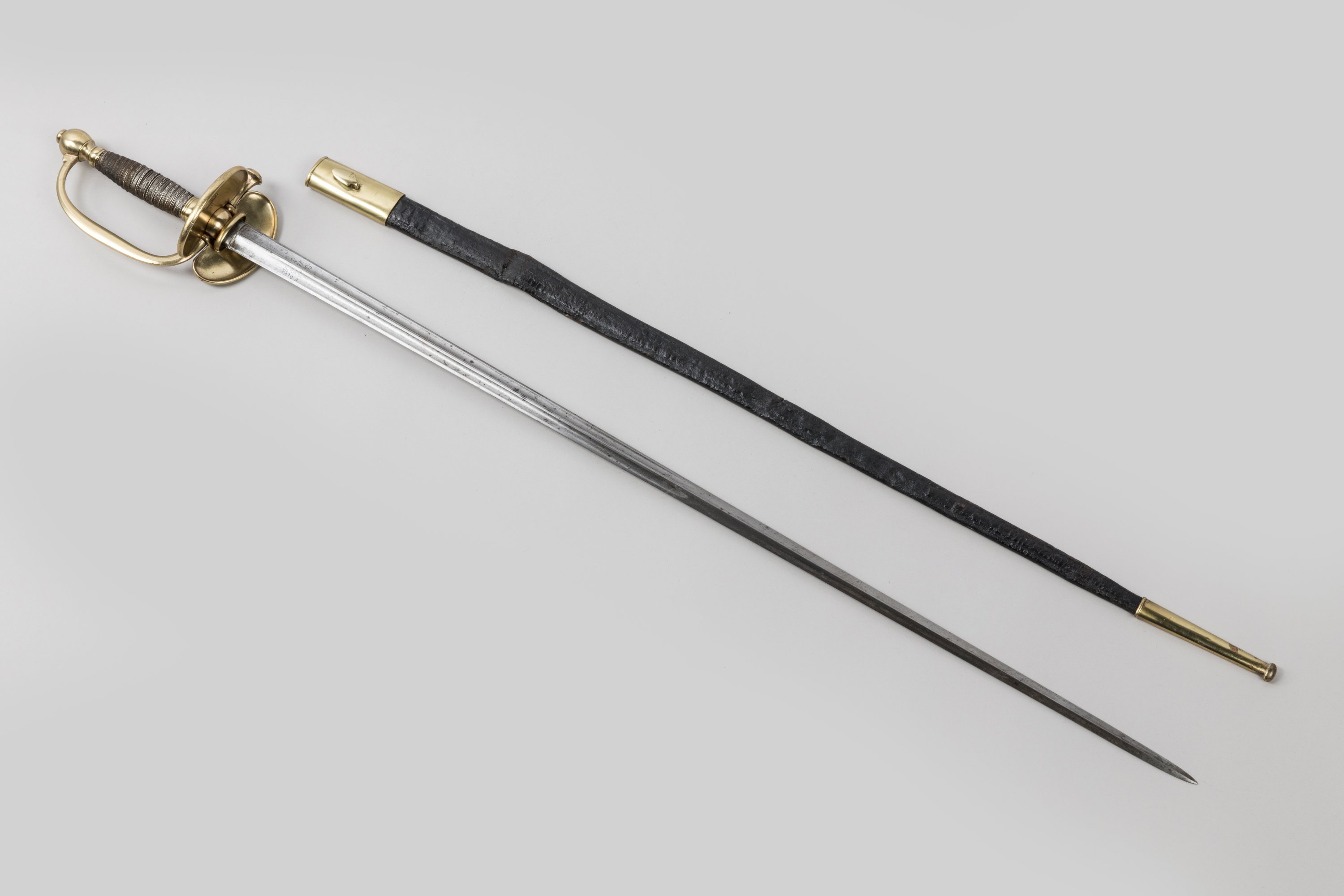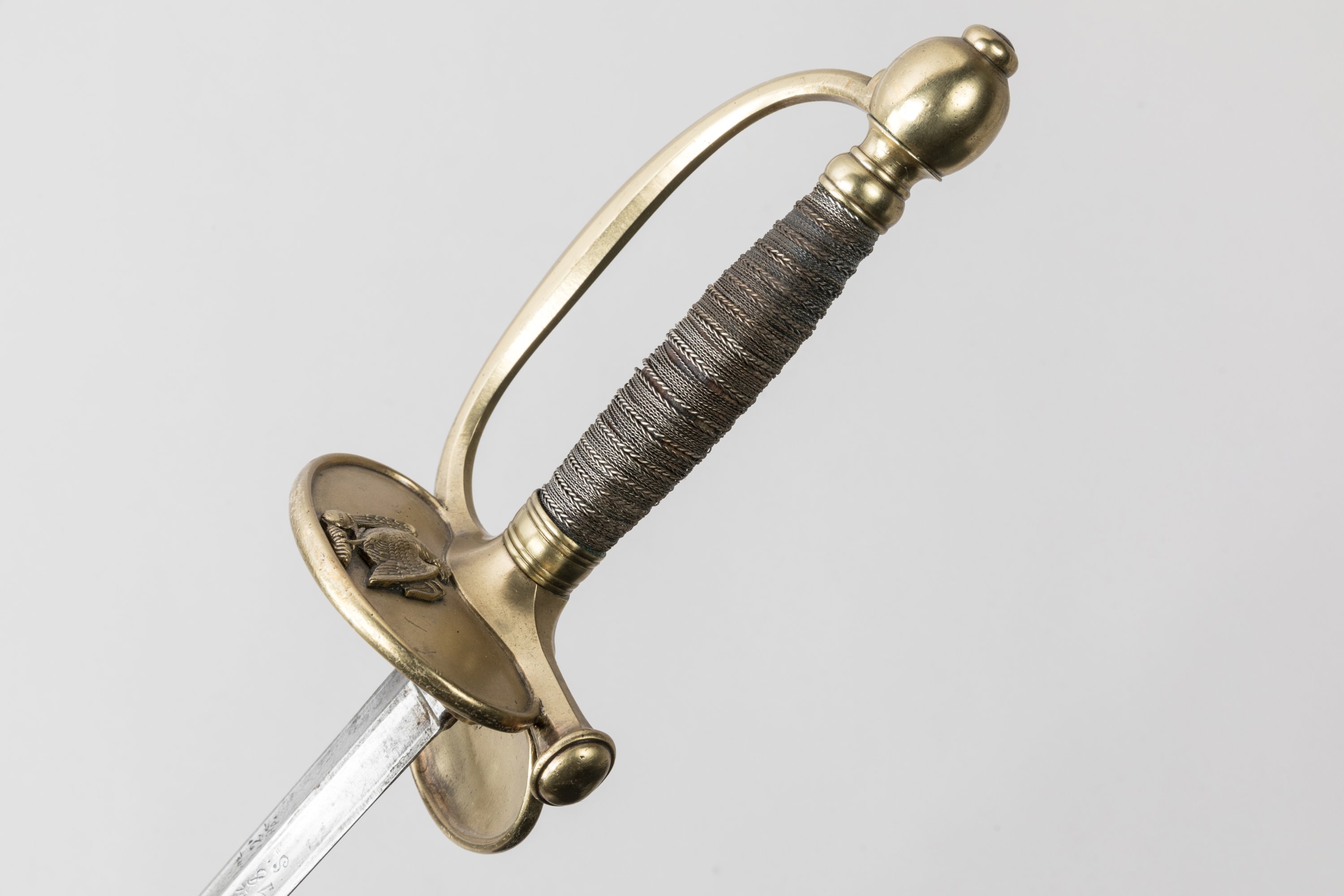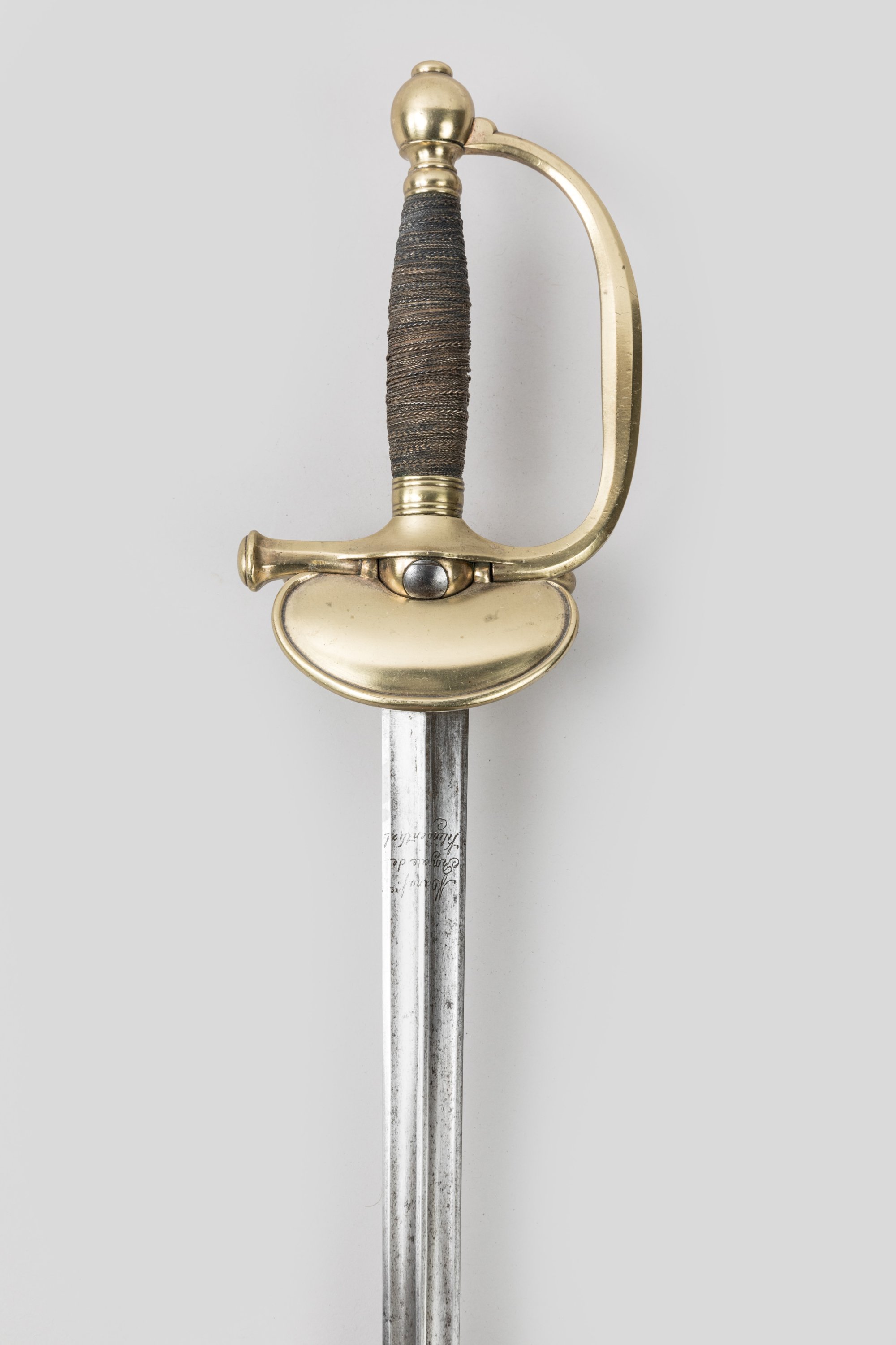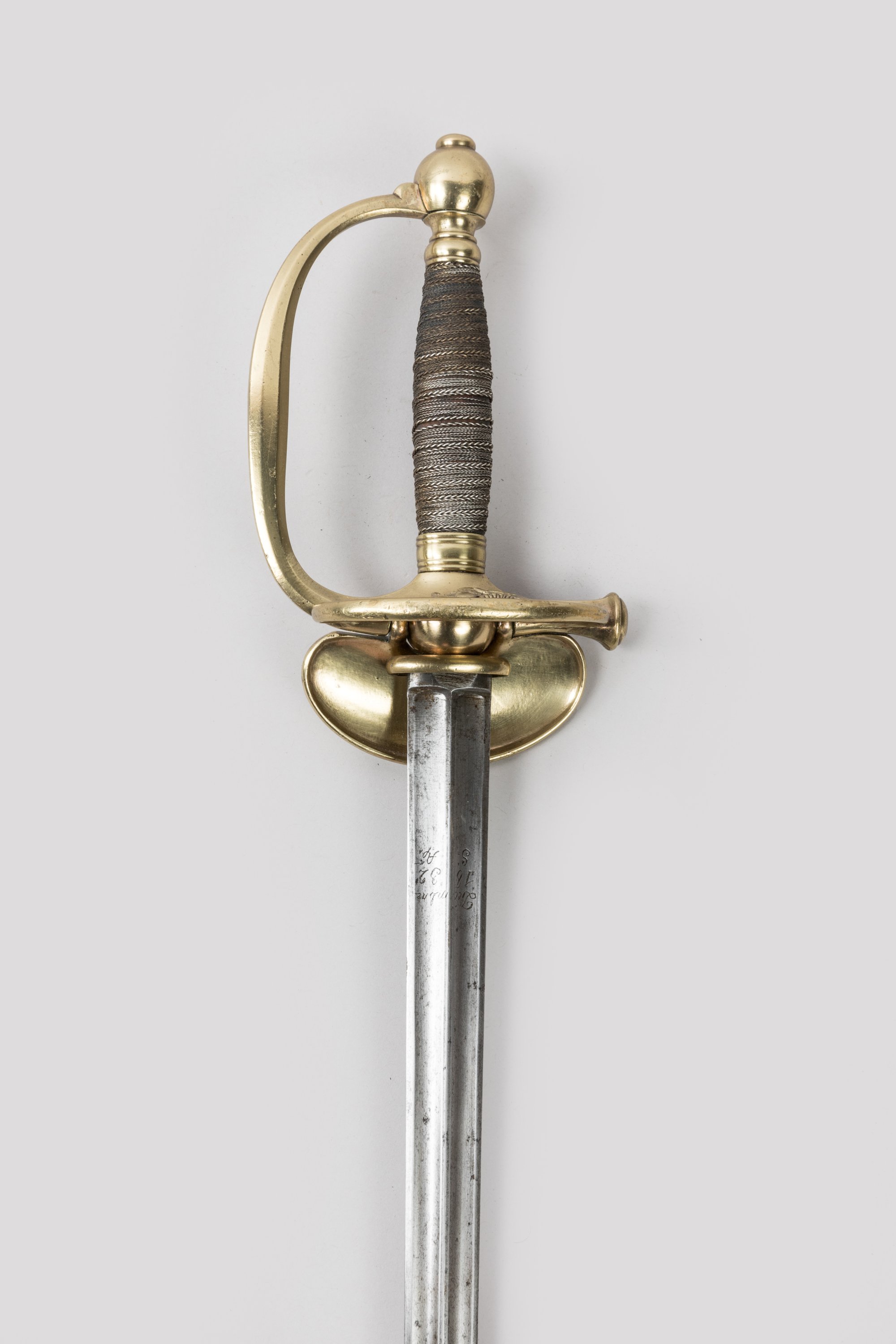 Fusée filigranée d’argent. Monture en laiton, garde à une branche, clavier au coq et contre-clavier à pompe. Forte lame de Klingenthal à arête médiane et pans creux. Fourreau en cuir à deux garnitures en laiton.