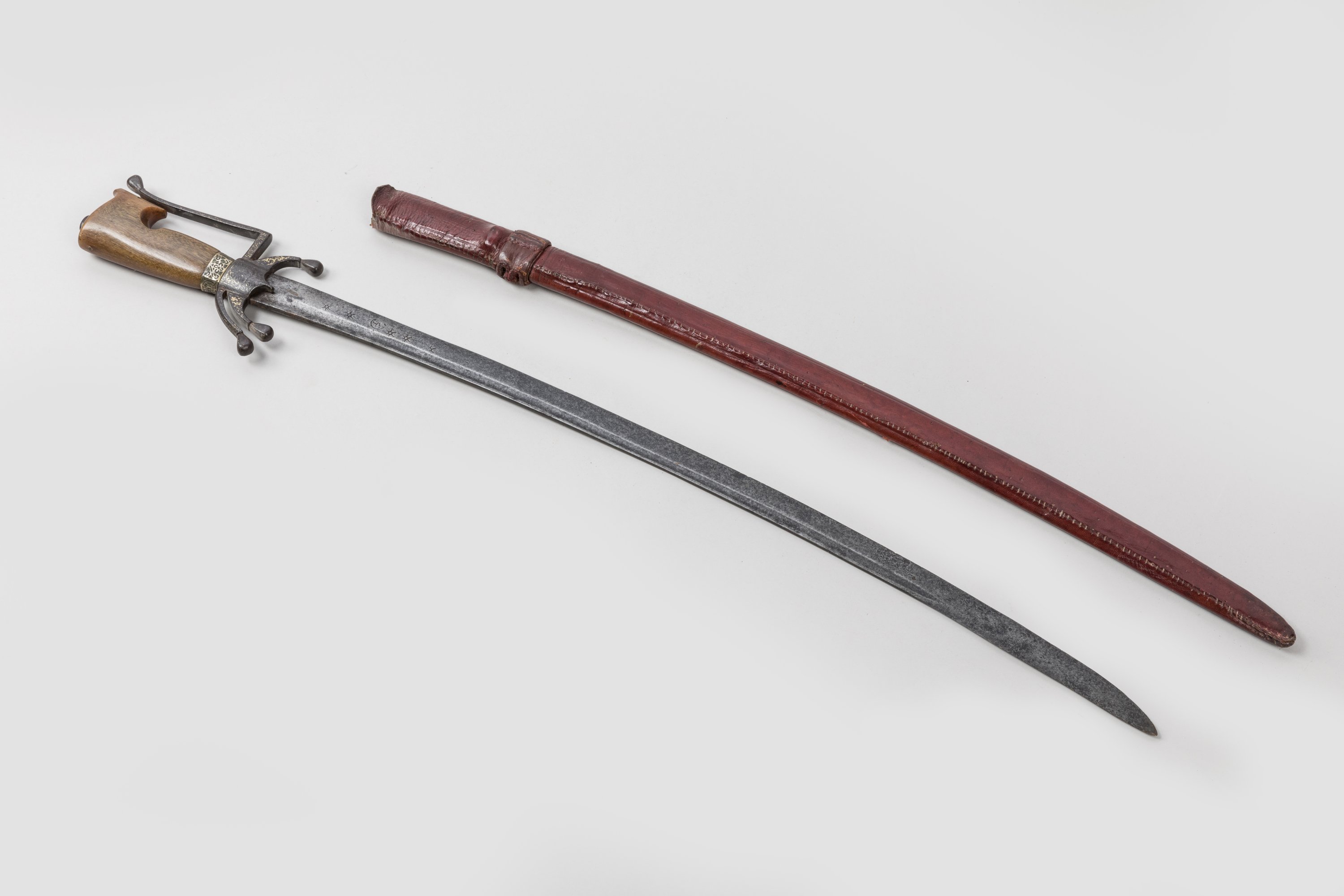 Poignée en corne claire. Monture en fer forgé damasquiné d’or, garde à une branche et trois quillons boulés courbés vers le bas. Lame courbe à dos plat, contre-tranchant et pans creux, poinçonnée au talon. Fourreau en cuir décoré.
