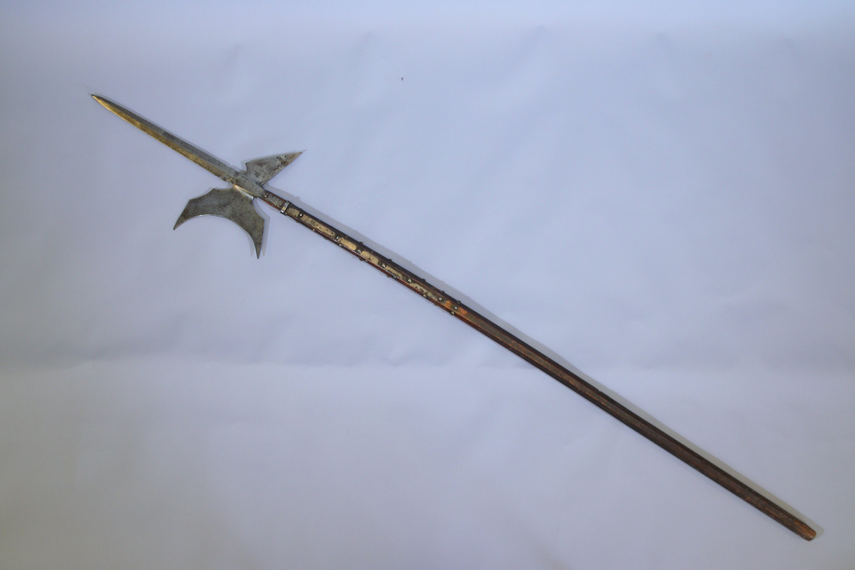 Long fer d’estoc à gouttière médiane. Fer de hache en croissant à pic poinçonnée sur trois fleurettes. Douille à deux longues attelles, hampe en bois.