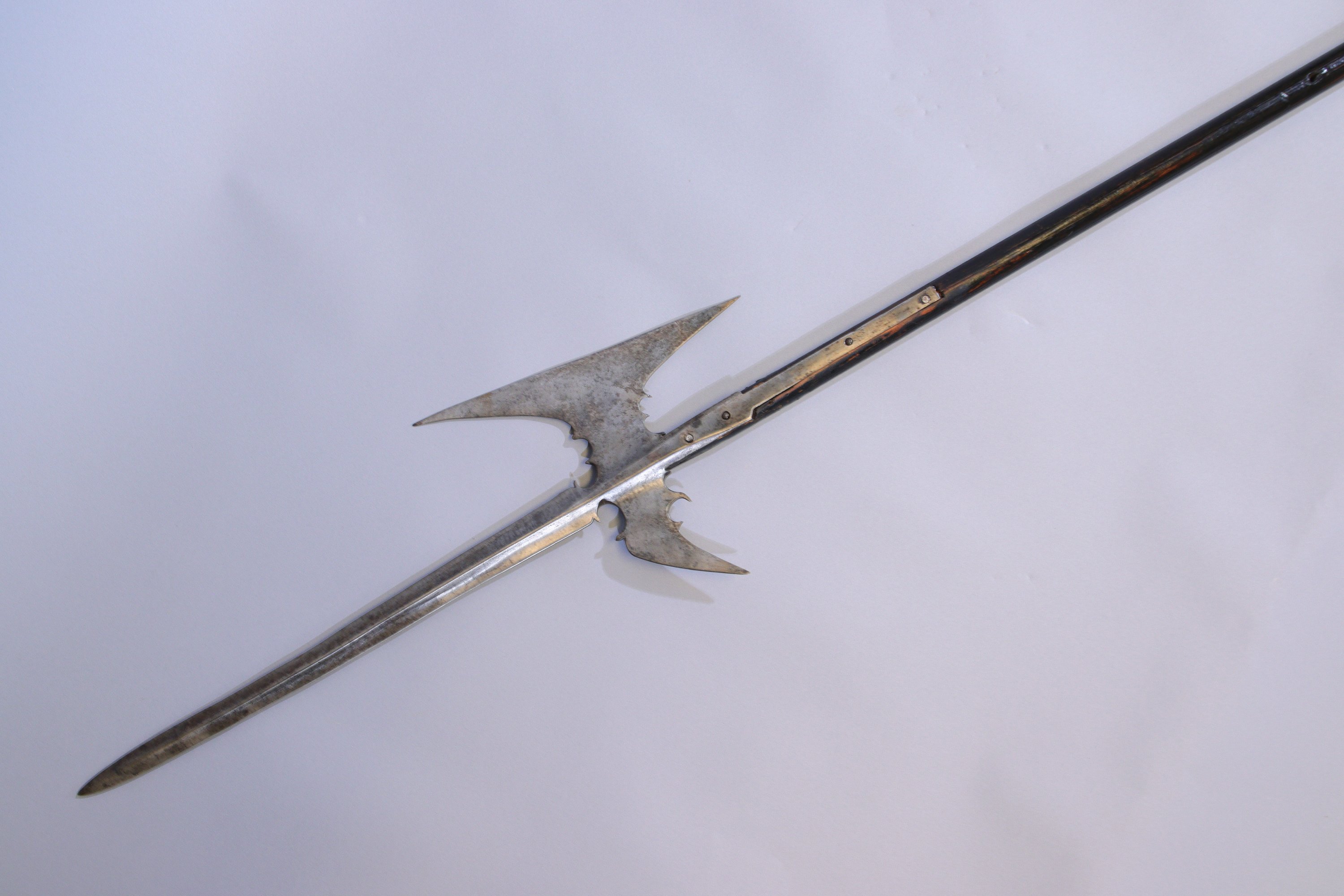 Pointe d’estoc à arête médiane. Fer de hache découpé à dos droit et pic à dos arrondi. Prolongé de deux courtes attèles - raccourcies - sur hampe en bois postérieure.