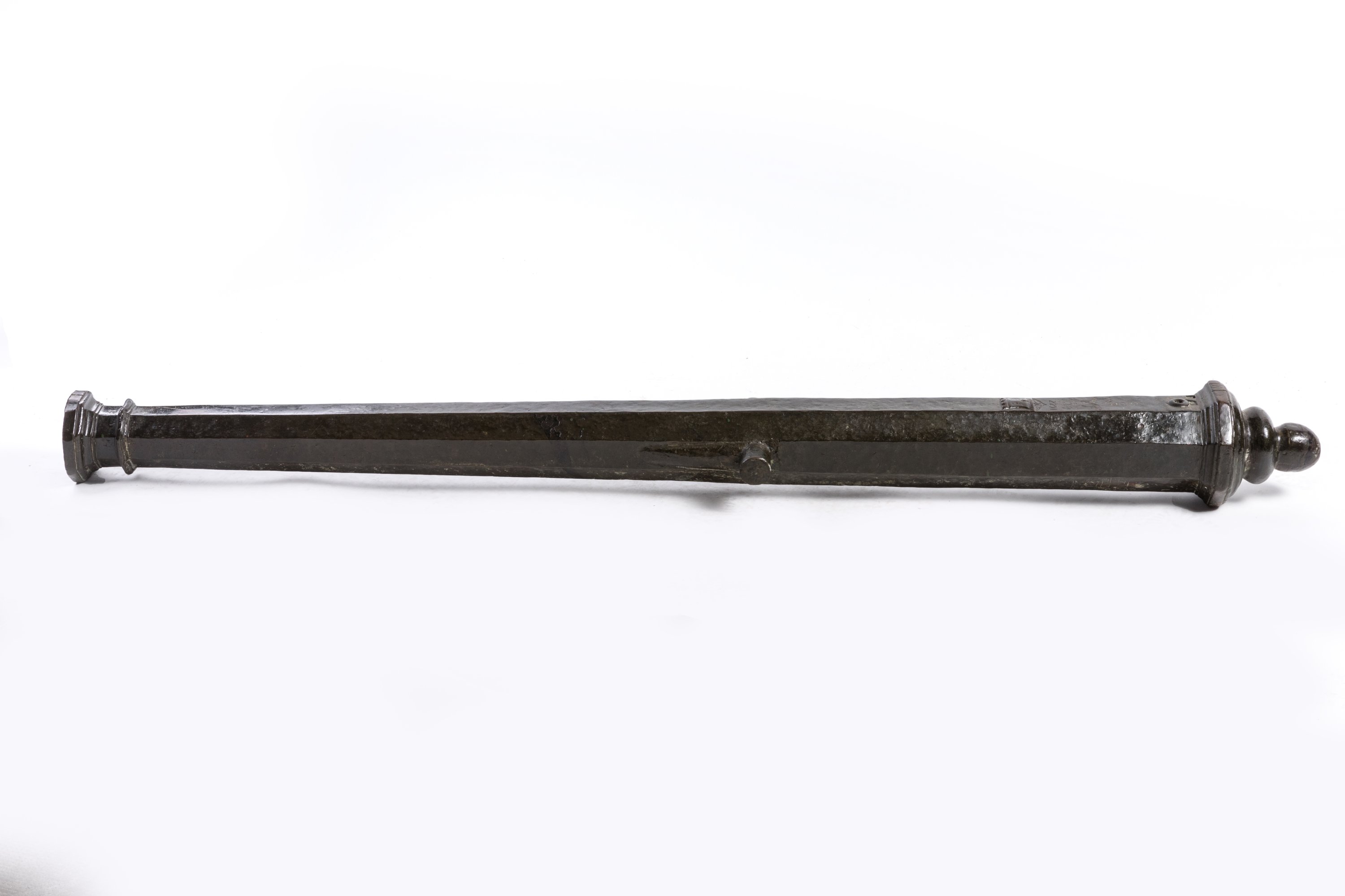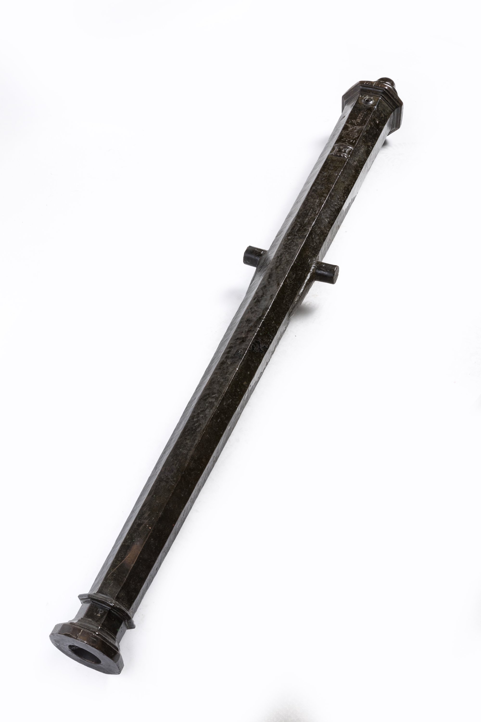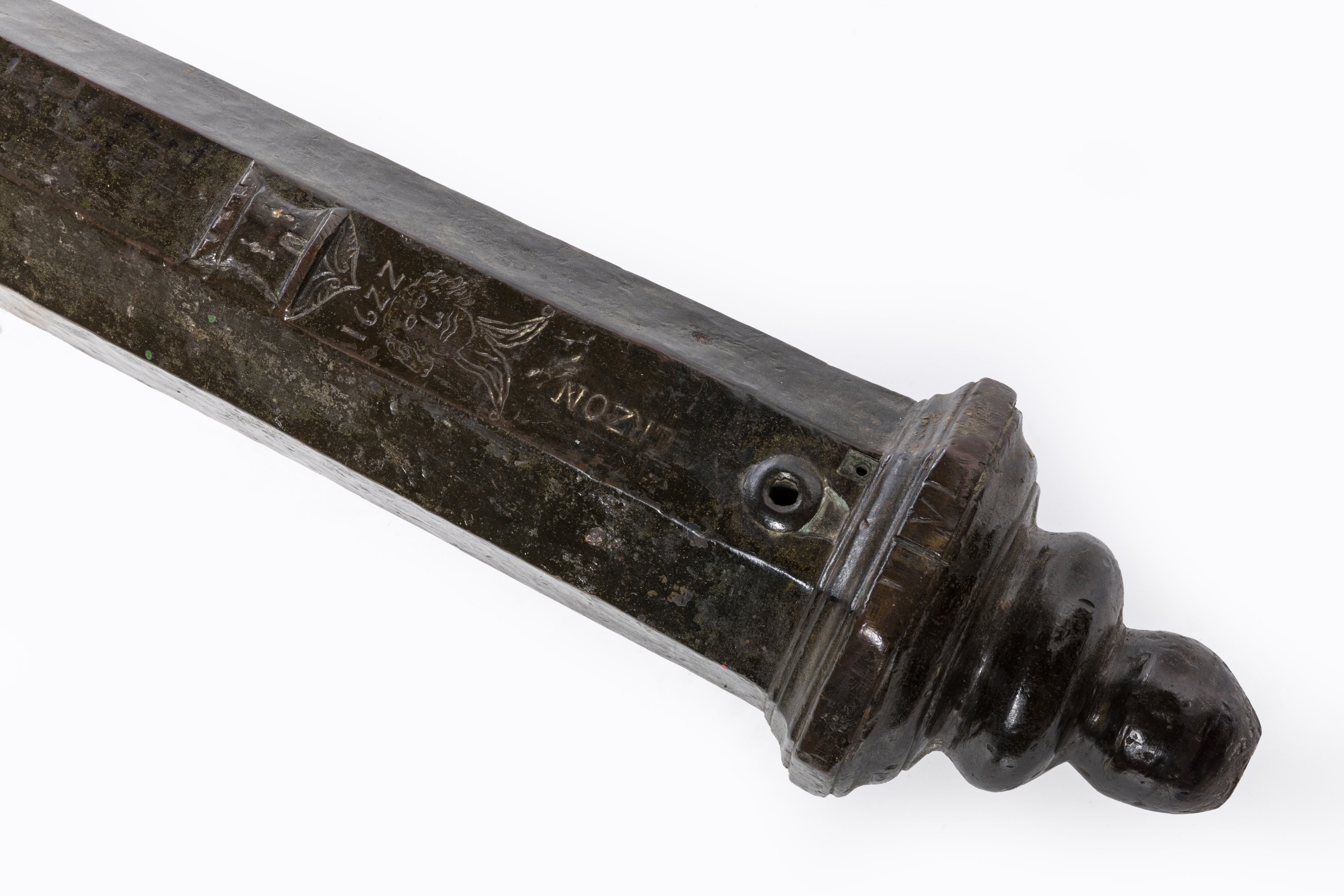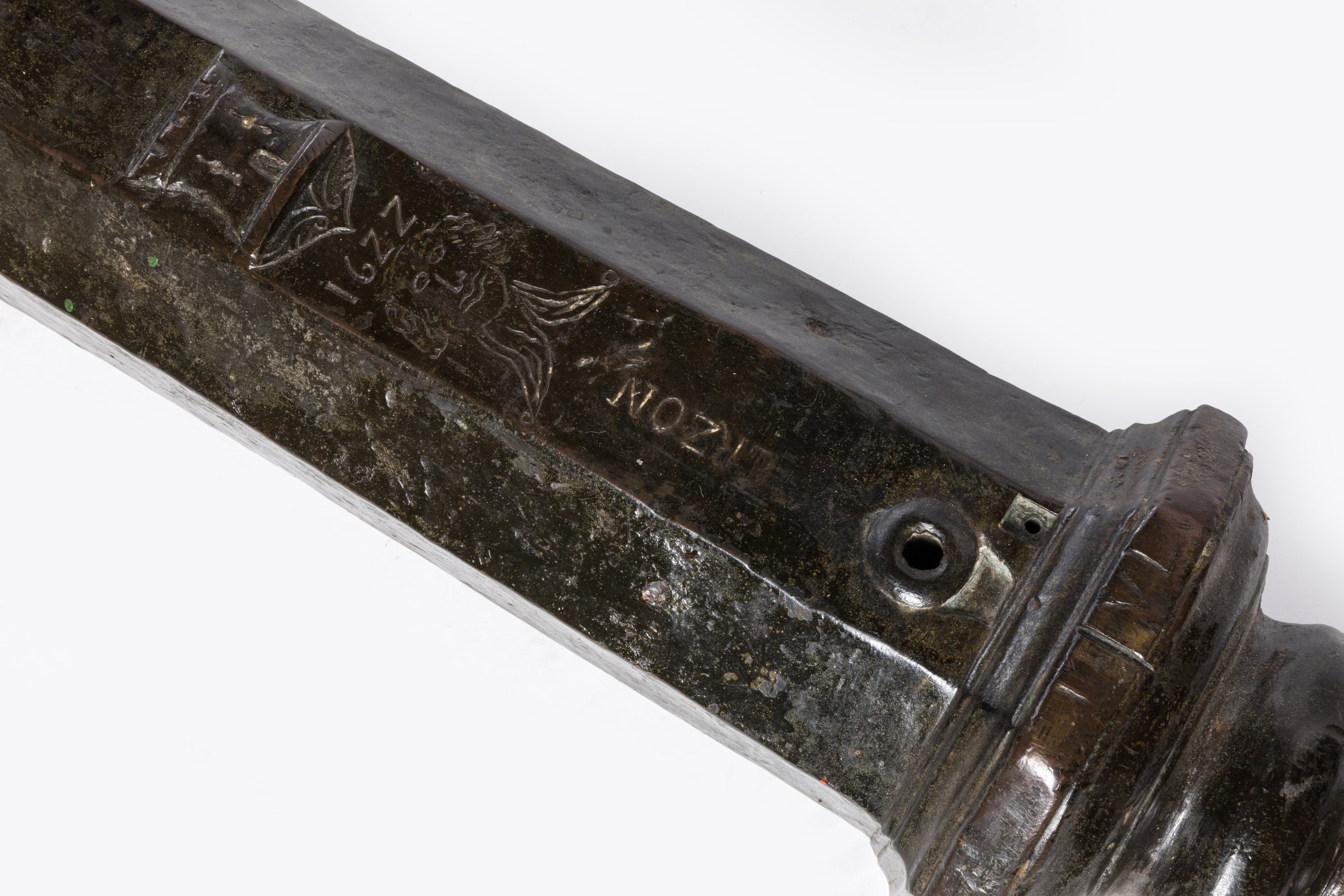 Fût à pans, à deux tourillons à bourrelet et anneau de renfort à la bouche et au tonnerre. Bouchon de culasse arrondi. Orné au tonnerre d’une tour, marqué "Vierzon", daté 1622. Tour crénelée surmontant une tête. Marqué 137 k au dos.