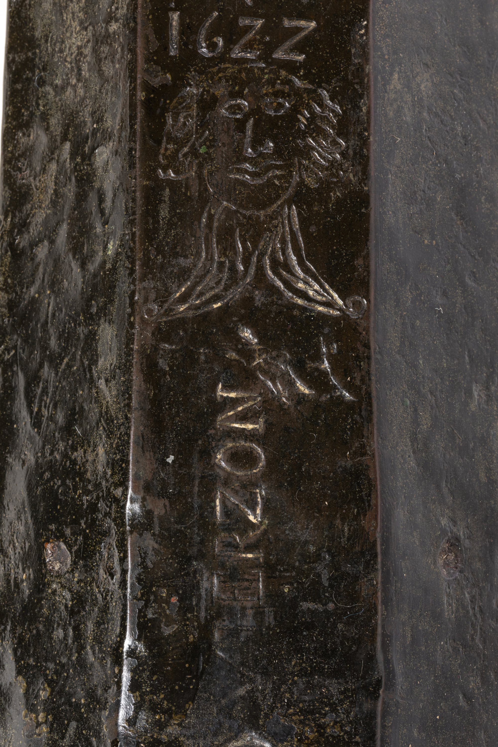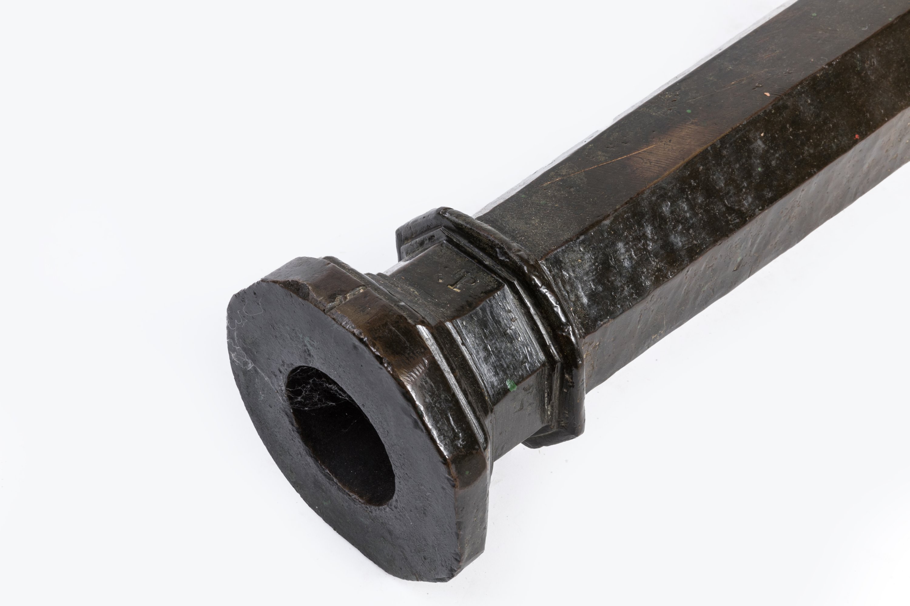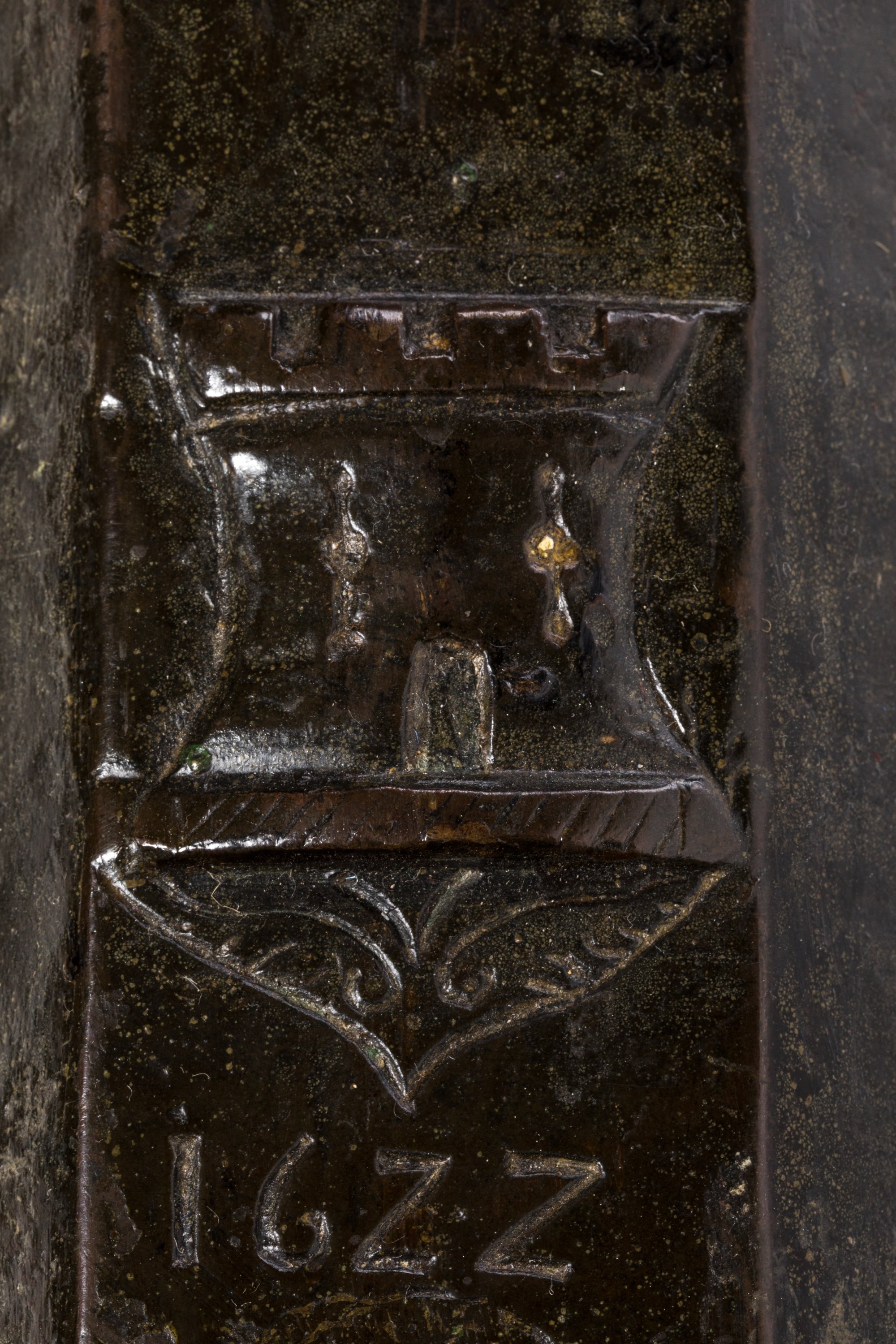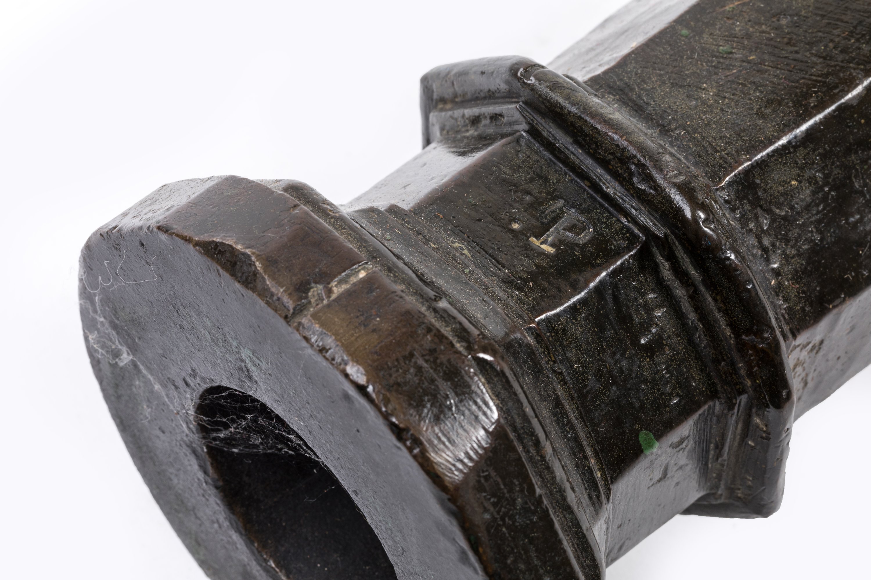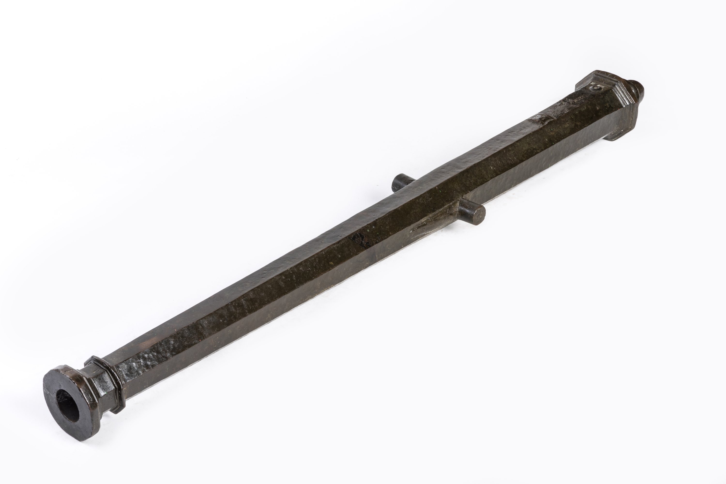 Fût à pans, à deux tourillons à bourrelet et anneau de renfort à la bouche et au tonnerre. Bouchon de culasse arrondi. Orné au tonnerre d’une tour, marqué "Vierzon", daté 1622. Tour crénelée surmontant une tête. Marqué 137 k au dos.
