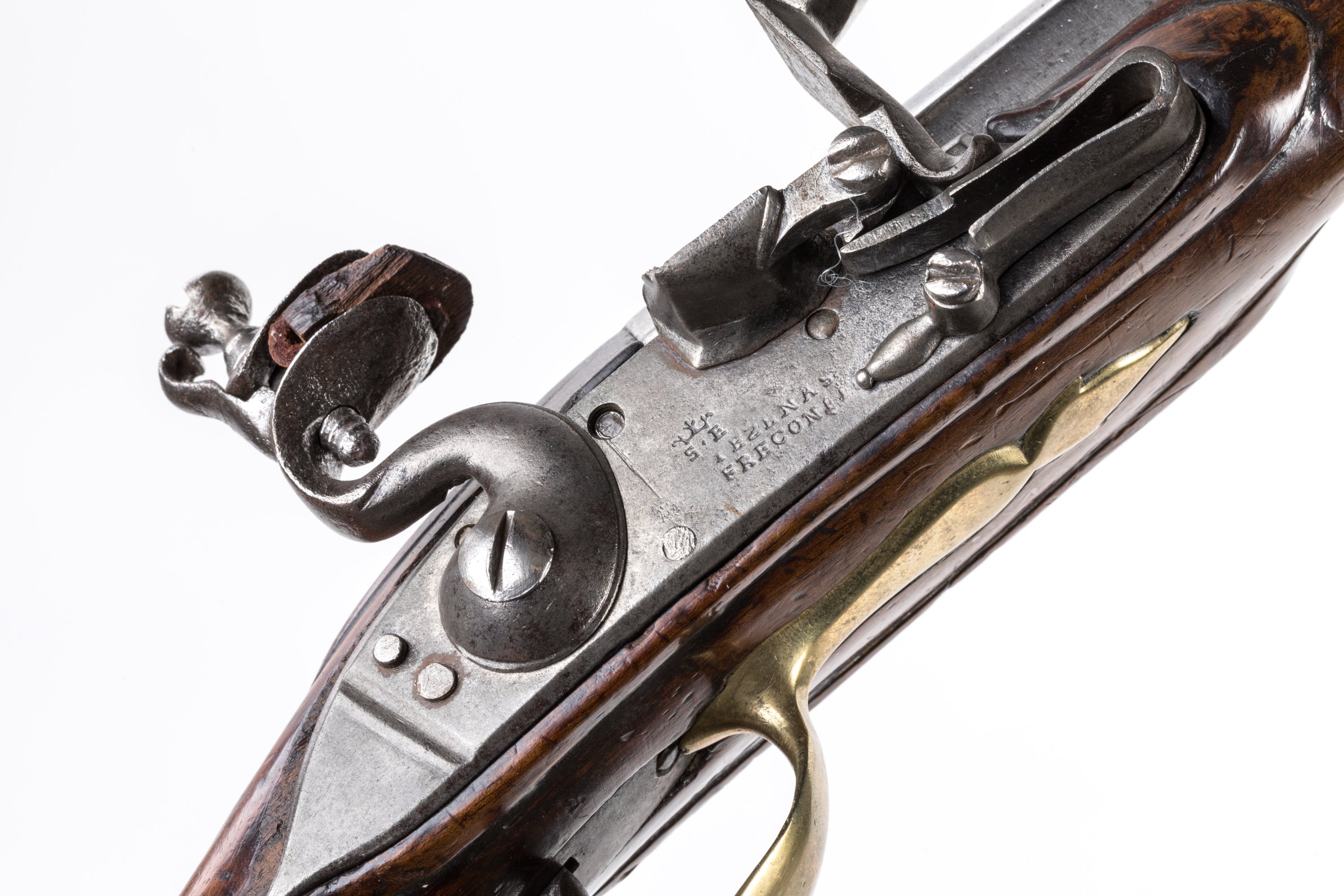 Canon rond, à pans au tonnerre. Platine à corps plat, poinçonné de St Etienne et signé « PEZENAS FRECONET » et chien col de cygne à corps rond. Garnitures en laiton découpé, uni. Monture en noyer, à long fût.