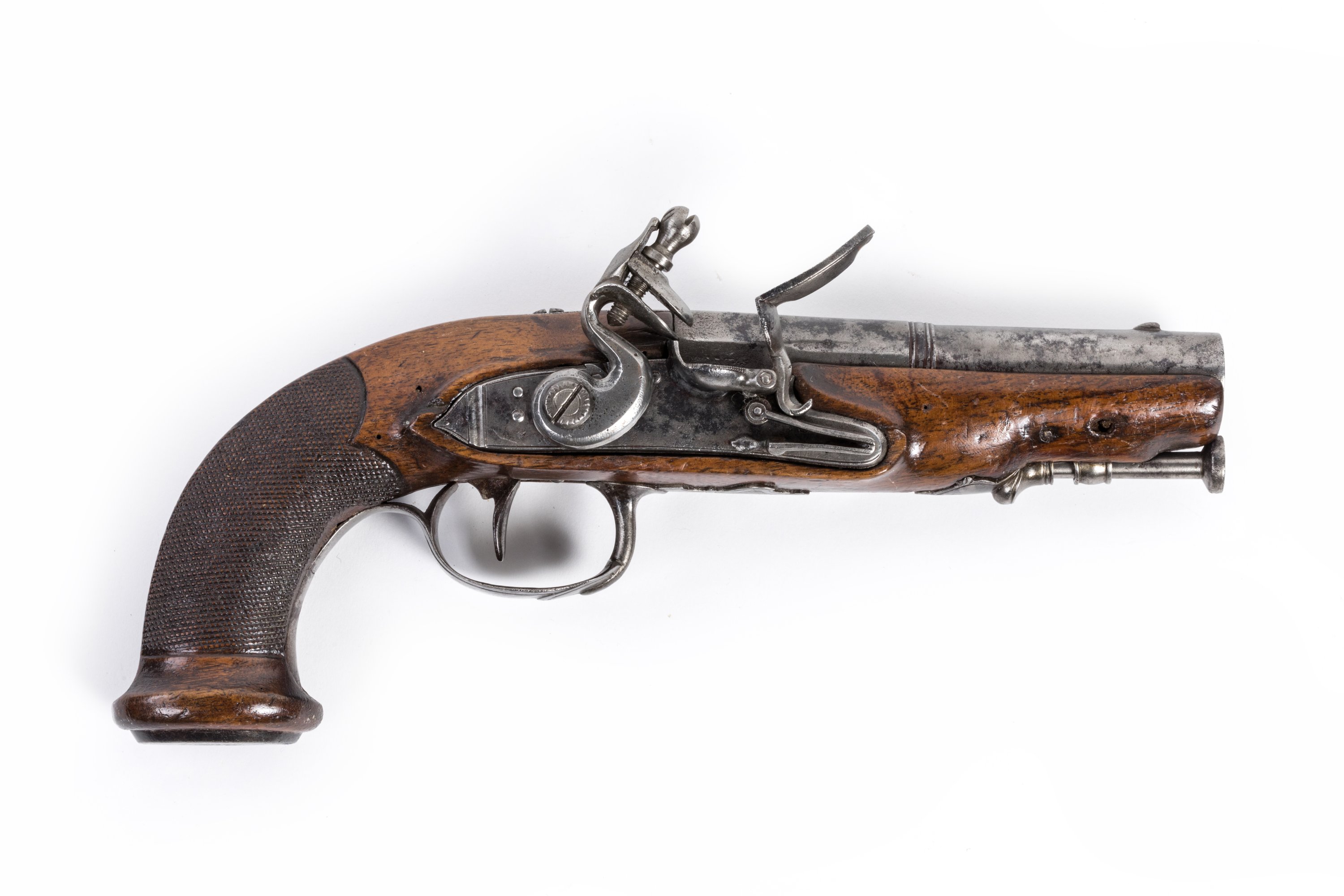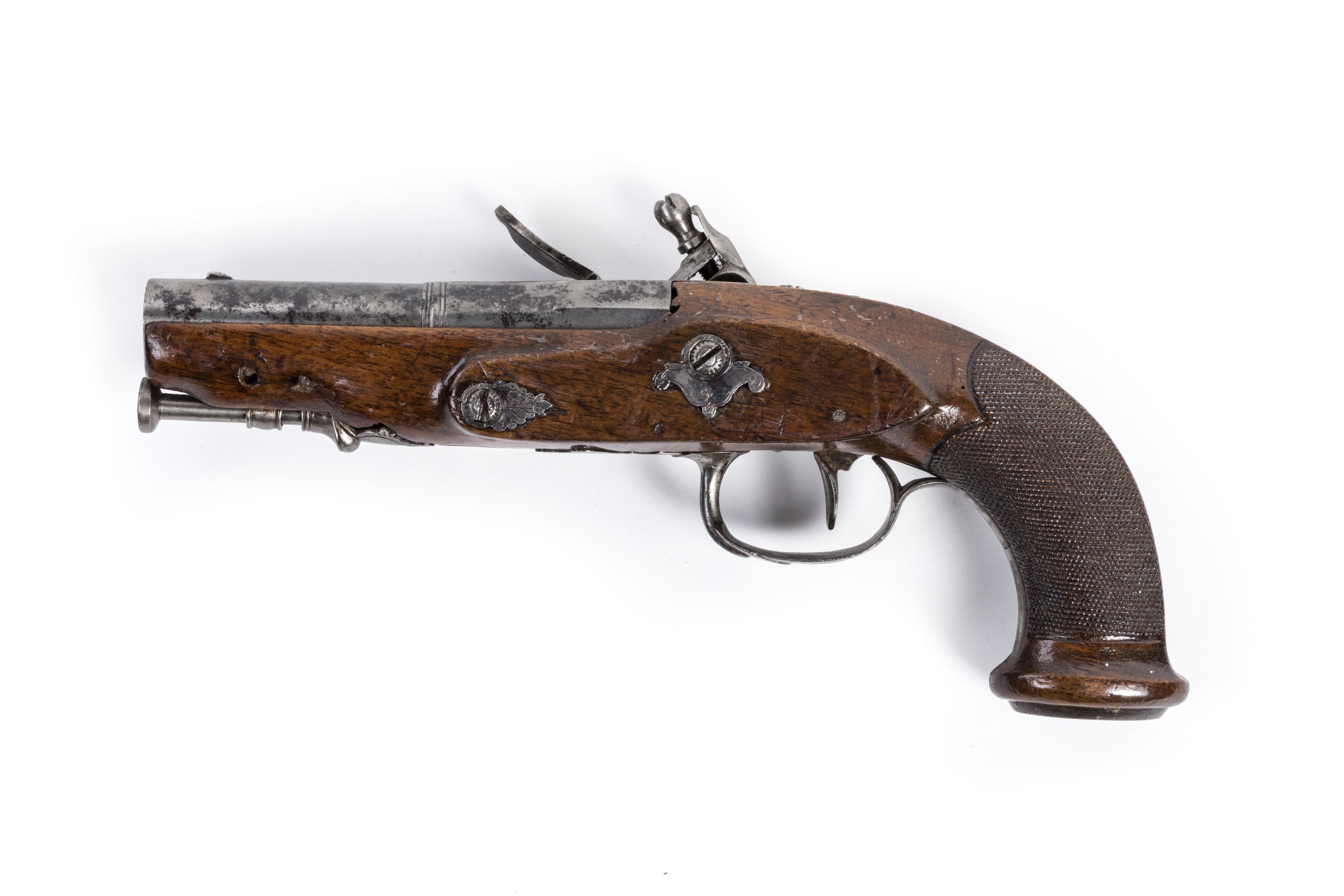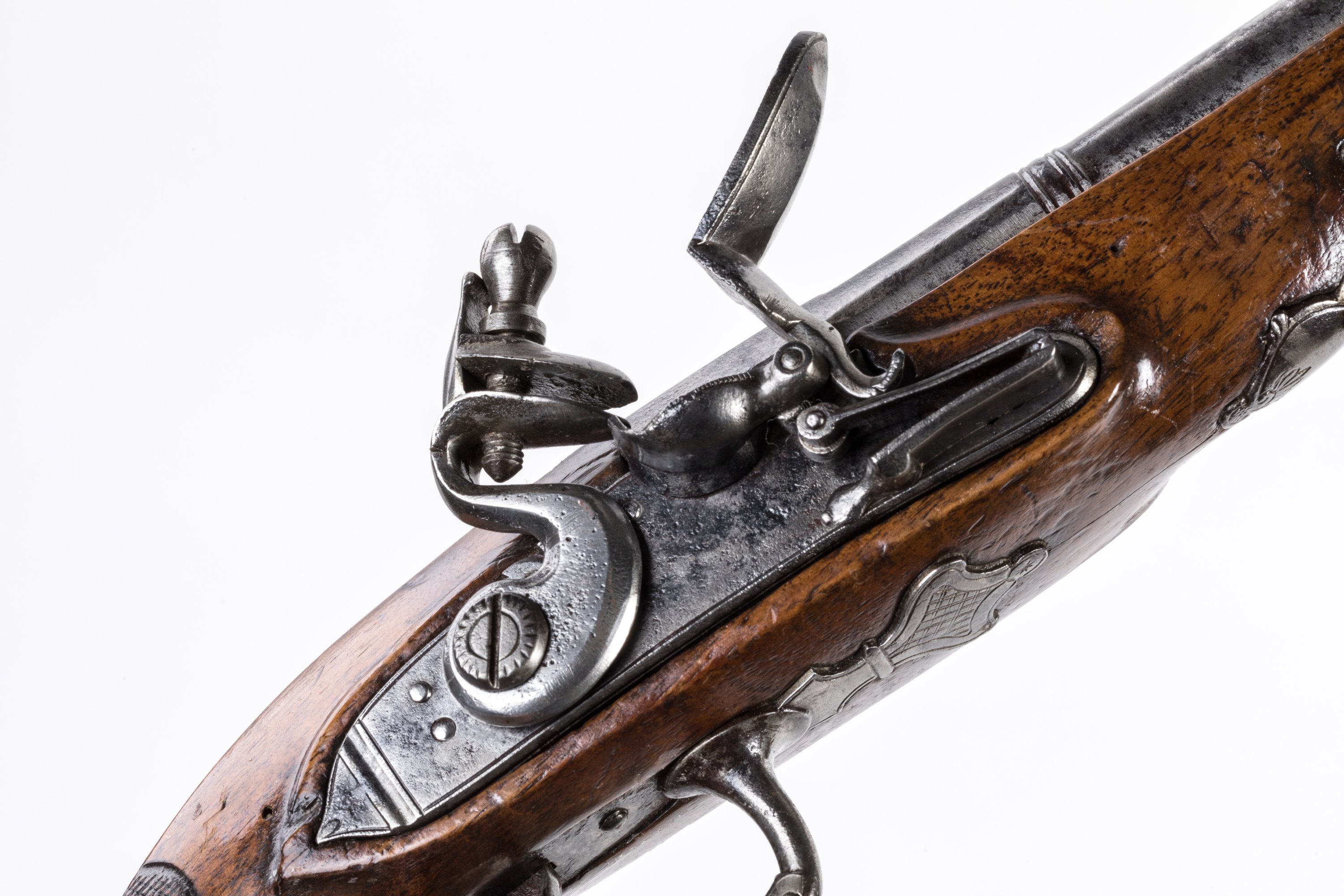 Canon à pans poinçonné « JR » au tonnerre. Platine et chien col de cygne à corps plat. Ressort à roulette. Garnitures en fer découpé. Baguette en fer.