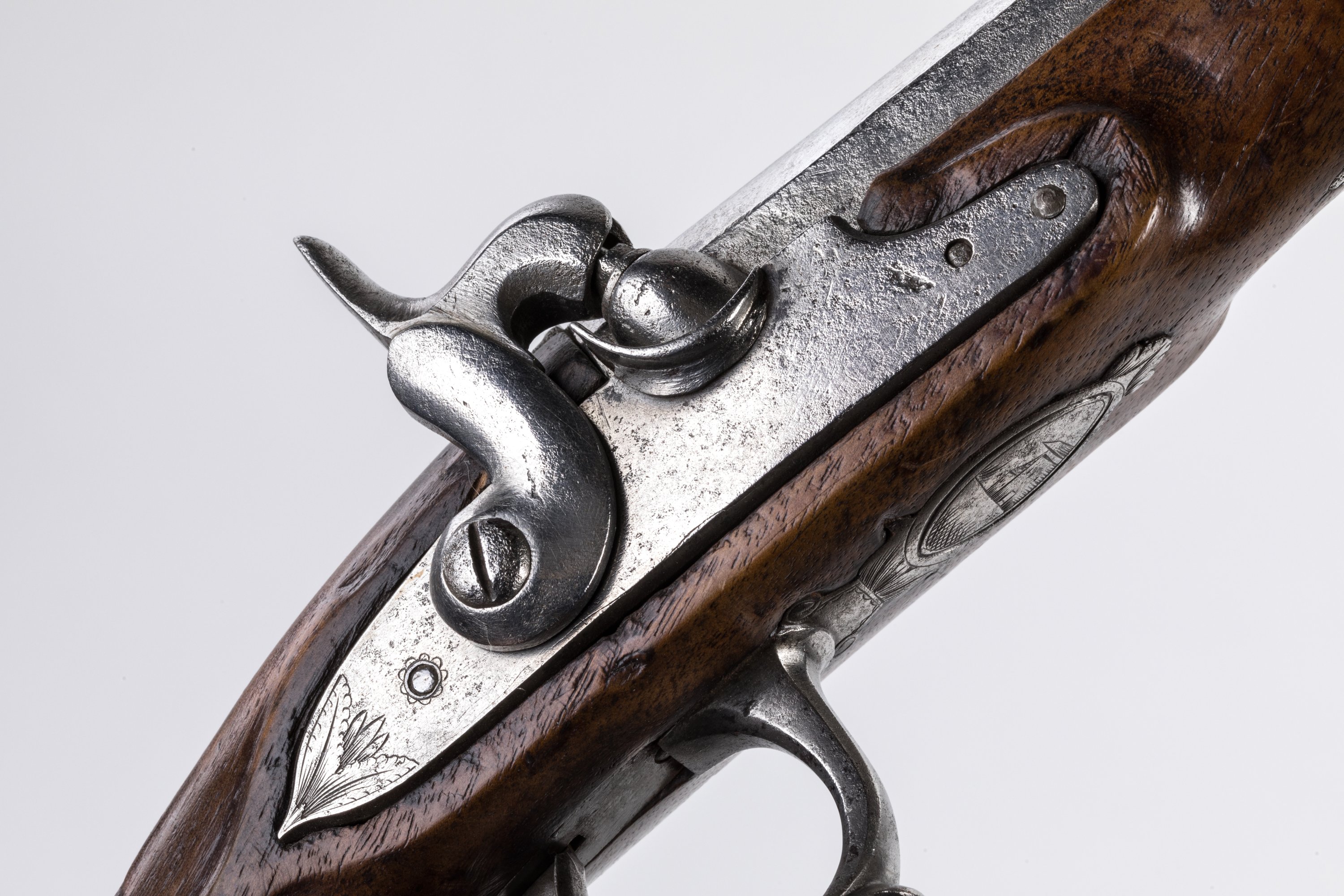 Canon à pans. Platine à corps plat, chien à corps rond. Garnitures en fer. Crosse en noyer. Baguette en fer à embout en laiton. Petite maison gravée sur calotte.