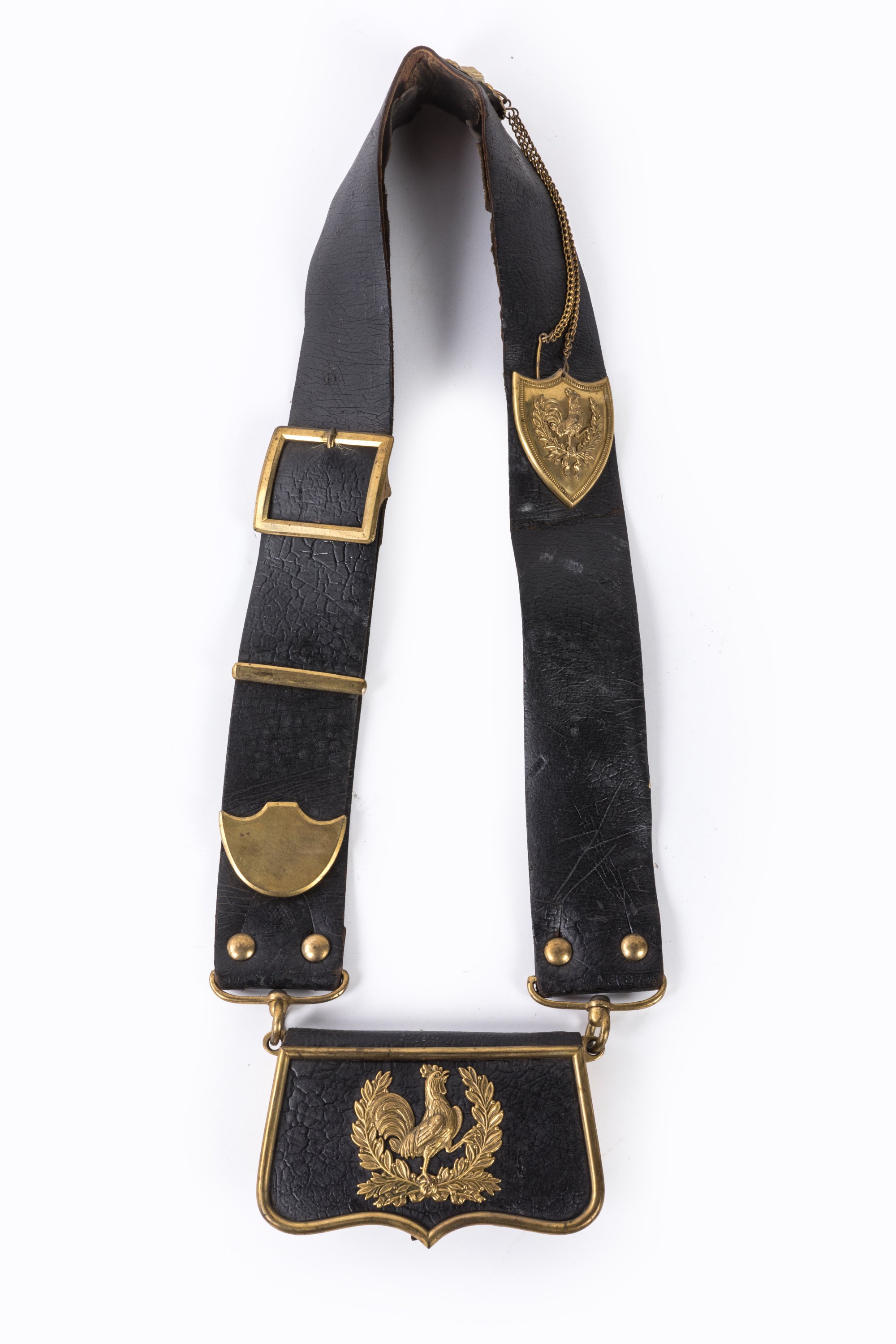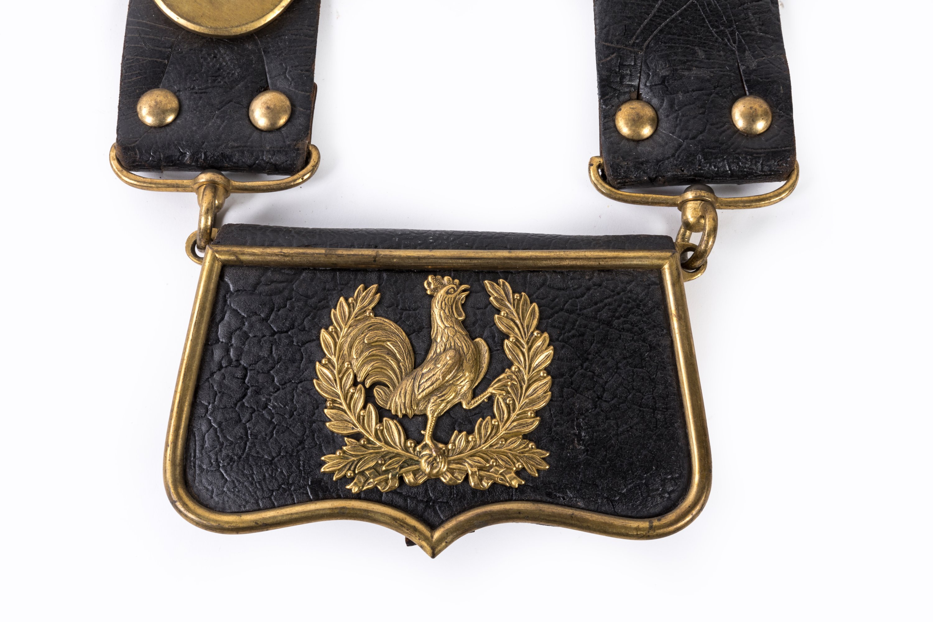 en cuir noir. Motif au coq, jonc, côtés et garnitures de banderole en laiton.