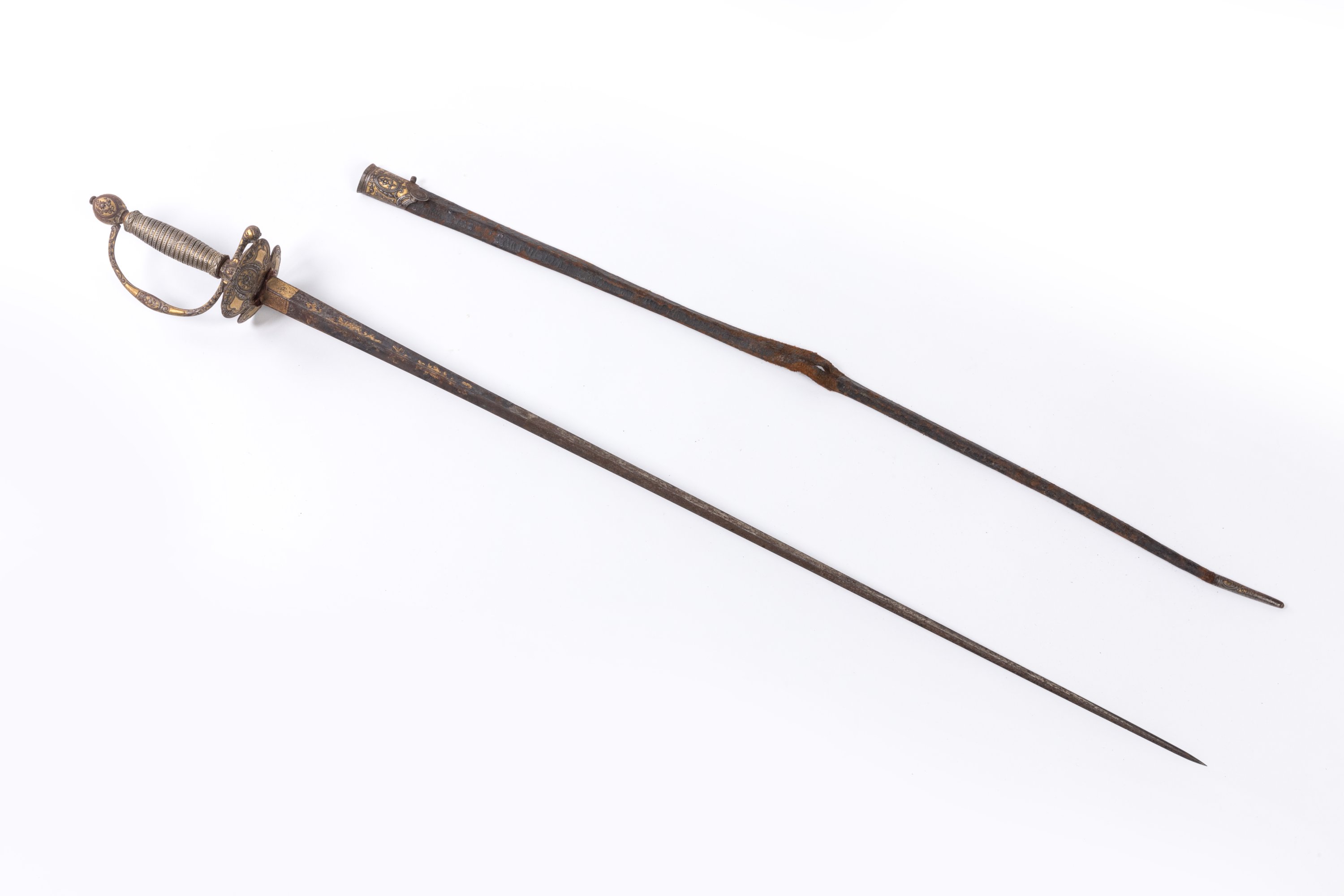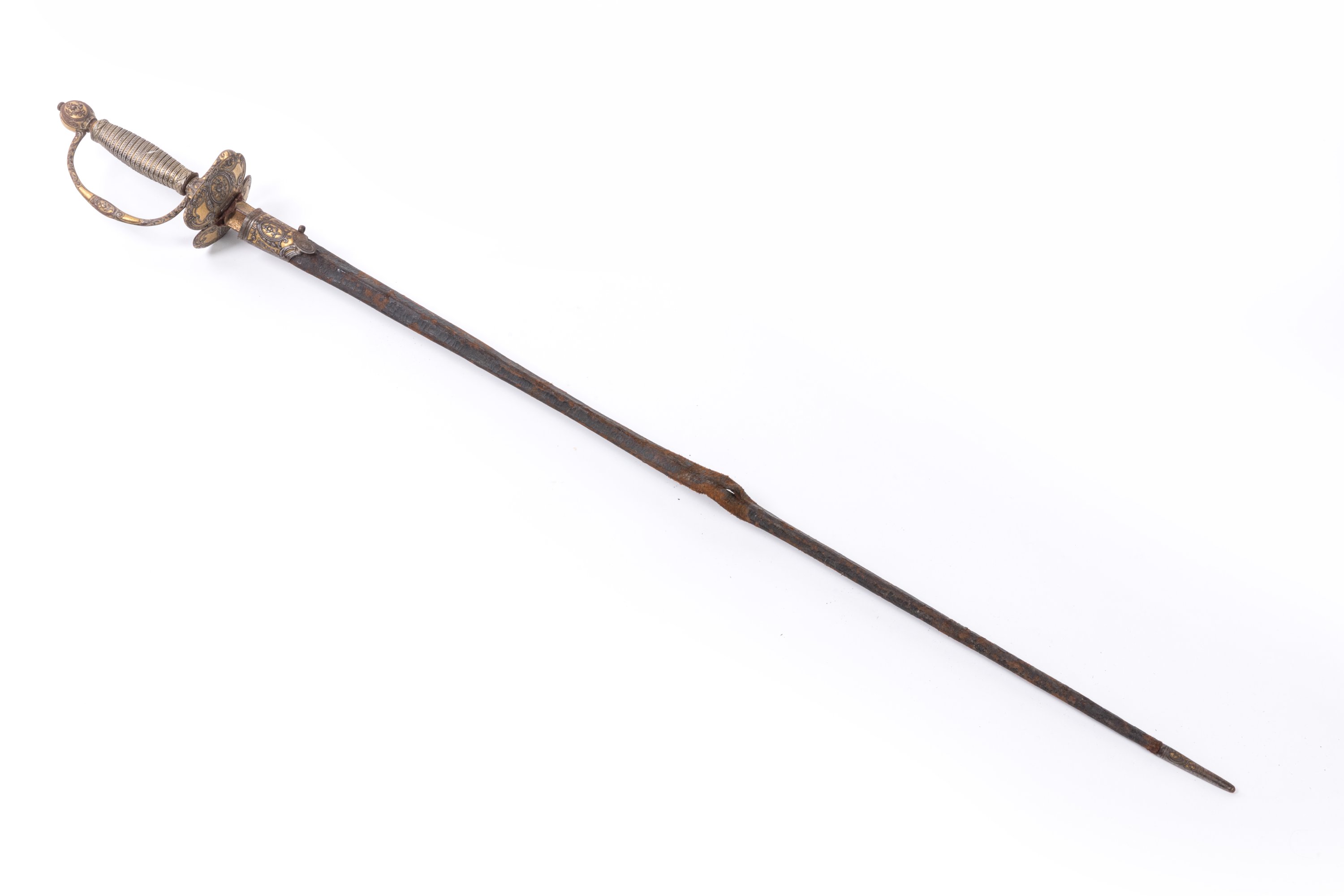 Fusée filigranée d’argent et lamé doré. Monture en fer ciselé, garde à une branche, pas d’âne et coquille entièrement décorés de fleurs et feuillage, à fond d’or. Lame triangulaire gravée, dorée et bleuie au tiers