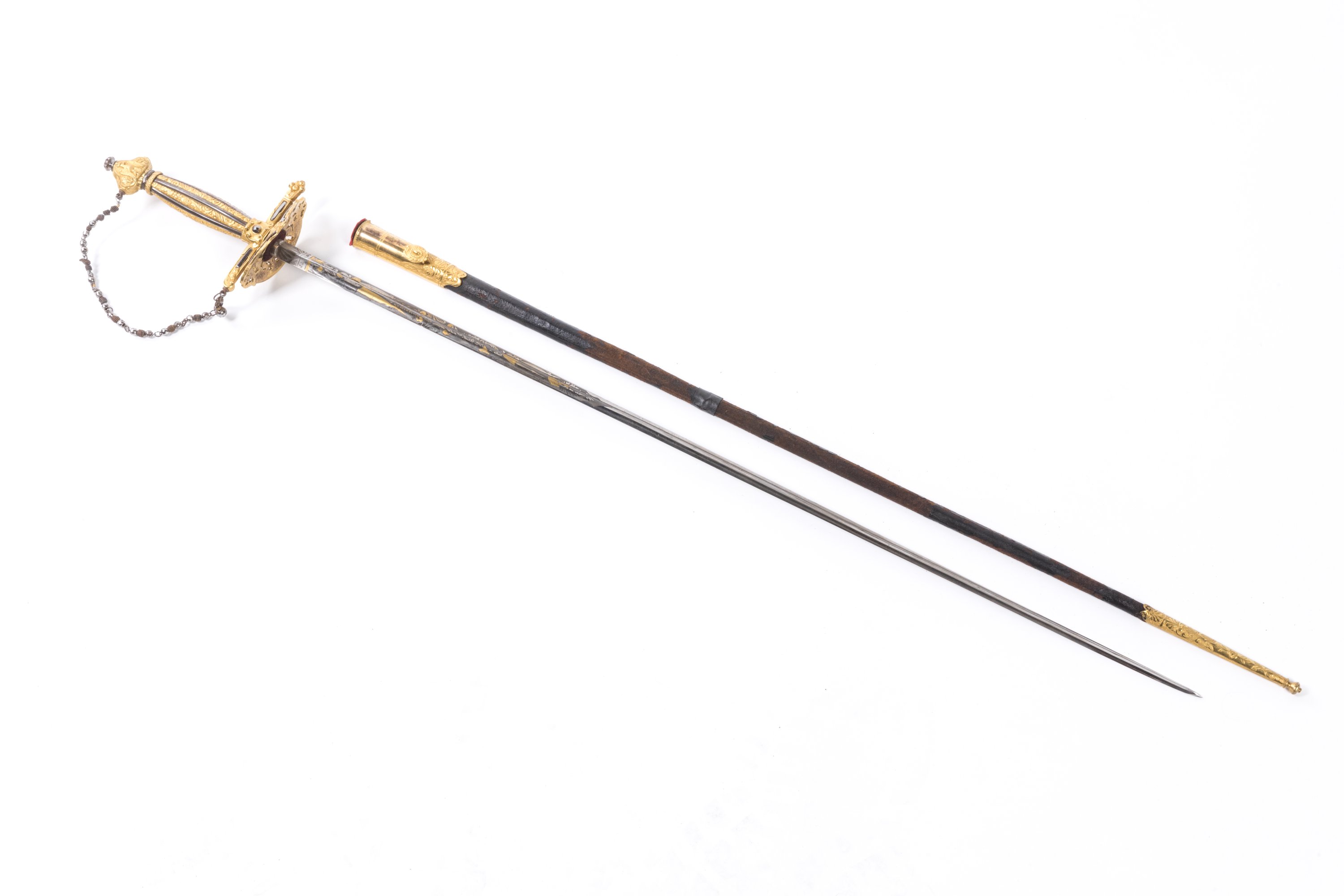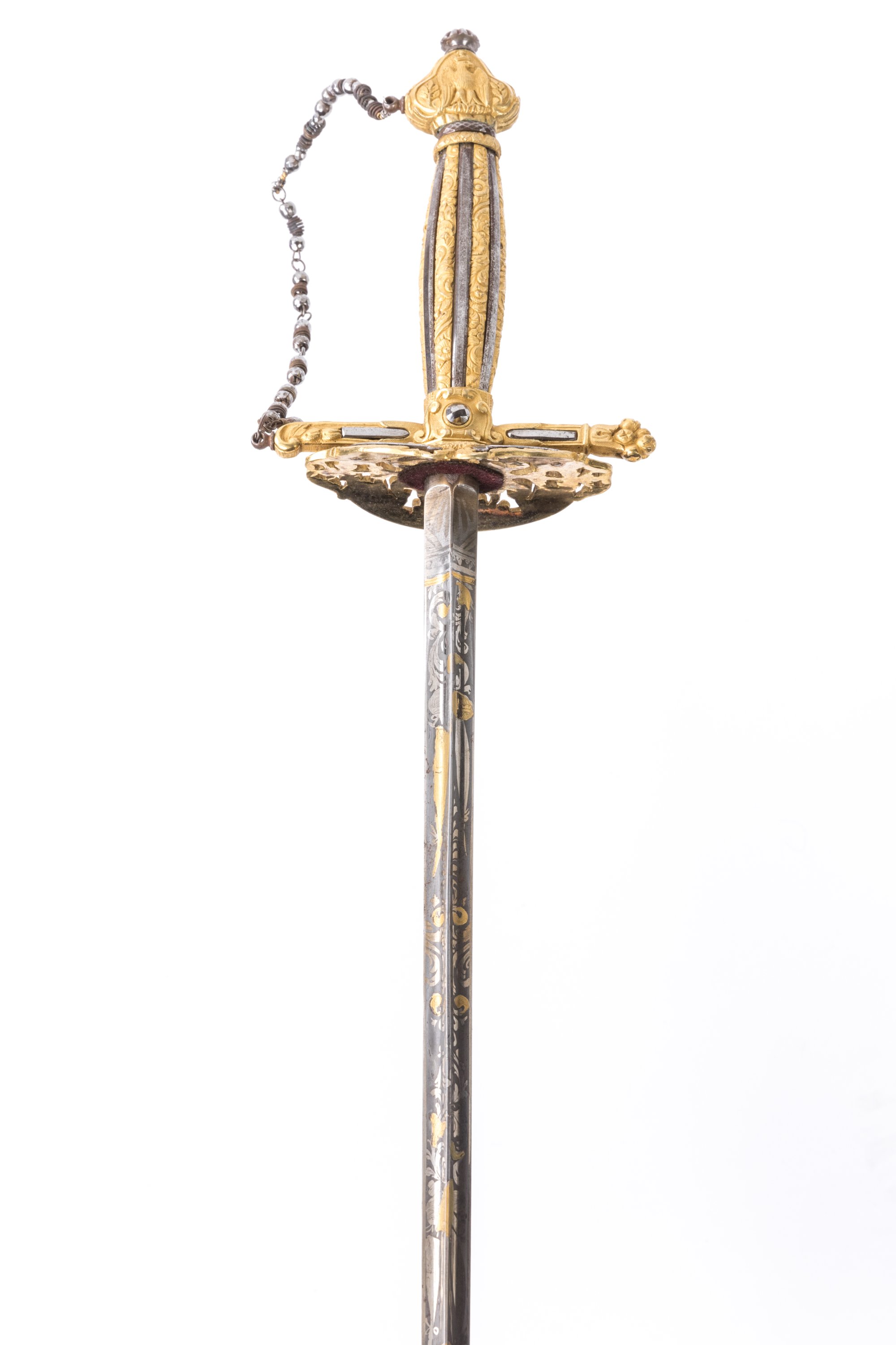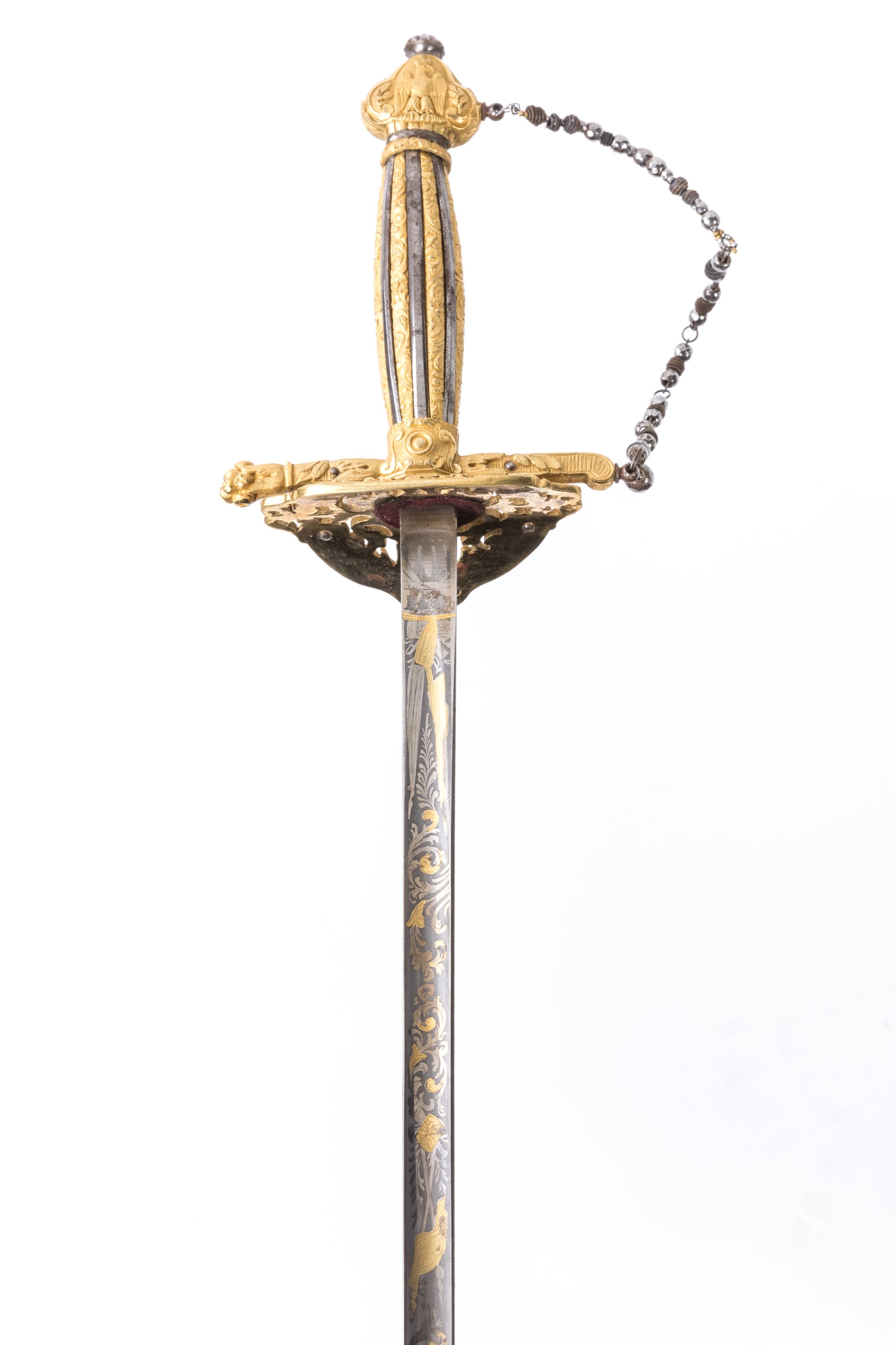 Monture en laiton ciselé et doré. Fusée à baguettes d’acier, garde à décor de perles d’acier. Pommeau à l’aigle. Lame finement gravée à l’acide et rehaussée d’or, au tiers. Fourreau en cuir à deux garnitures en laiton doré.
