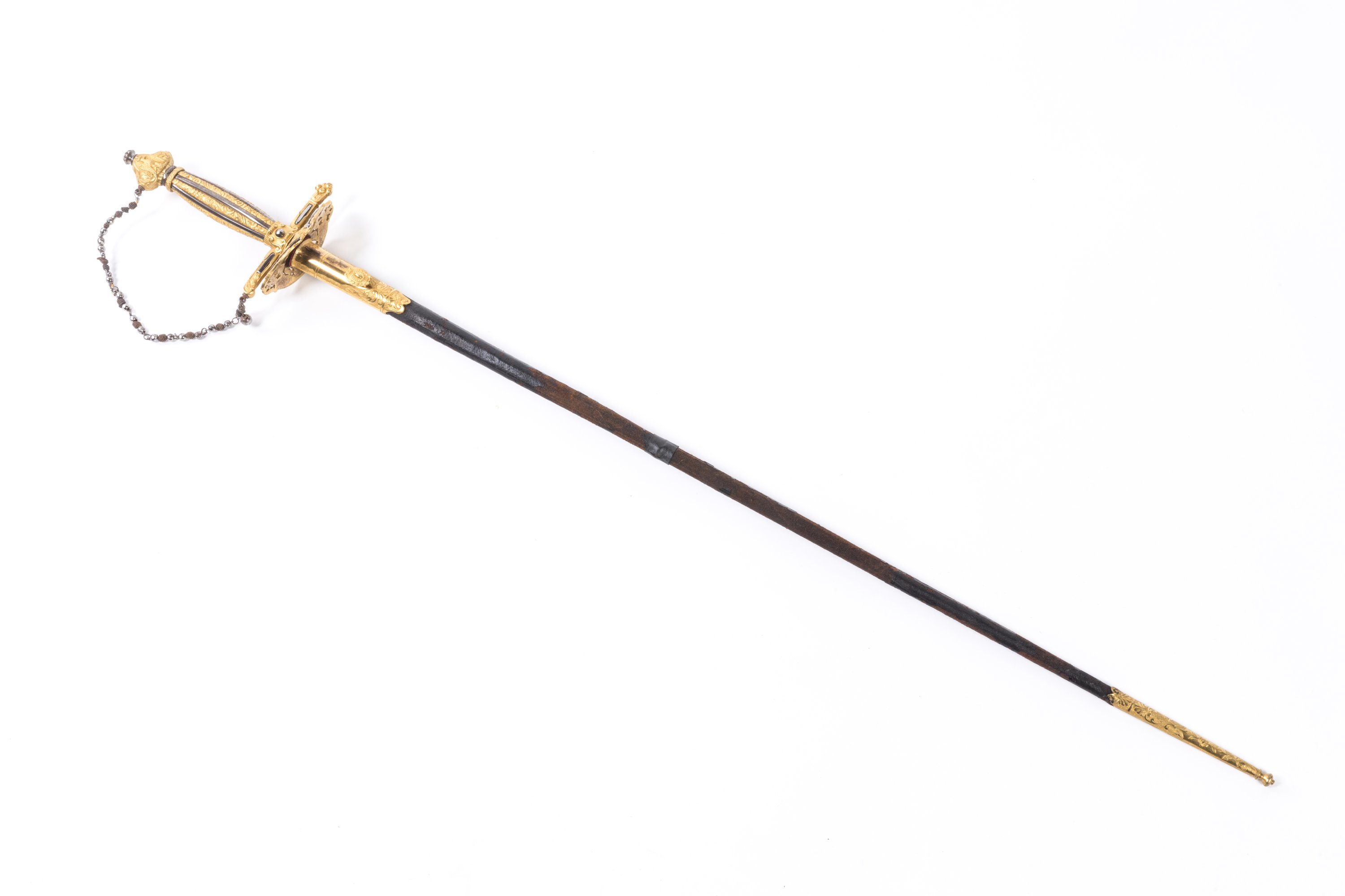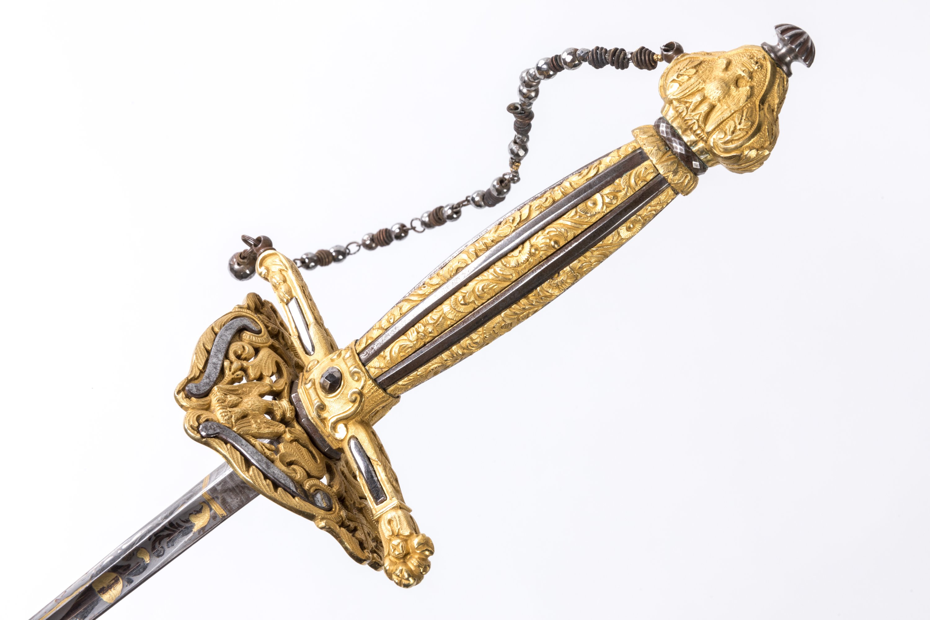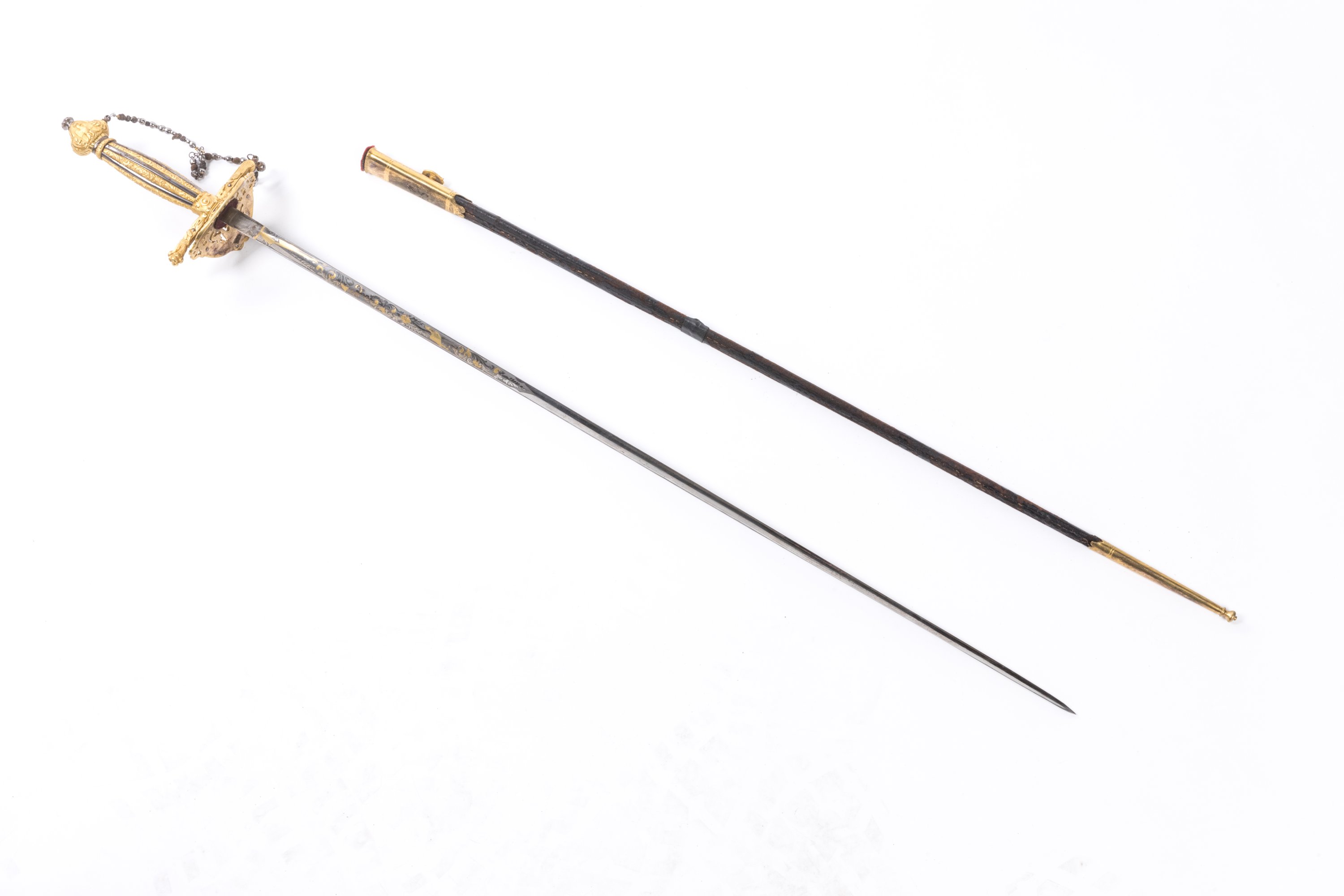 Monture en laiton ciselé et doré. Fusée à baguettes d’acier, garde à décor de perles d’acier. Pommeau à l’aigle. Lame finement gravée à l’acide et rehaussée d’or, au tiers. Fourreau en cuir à deux garnitures en laiton doré.