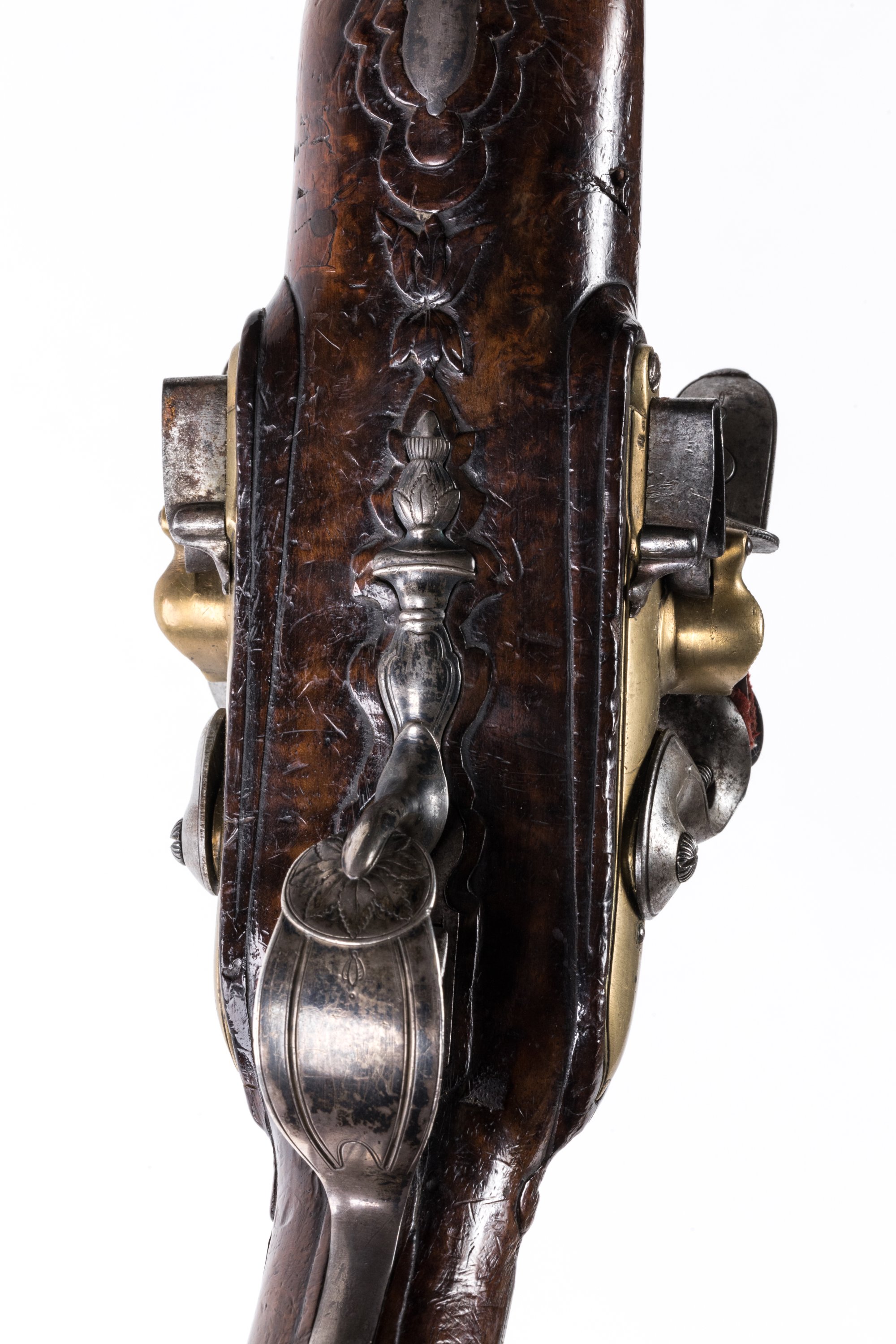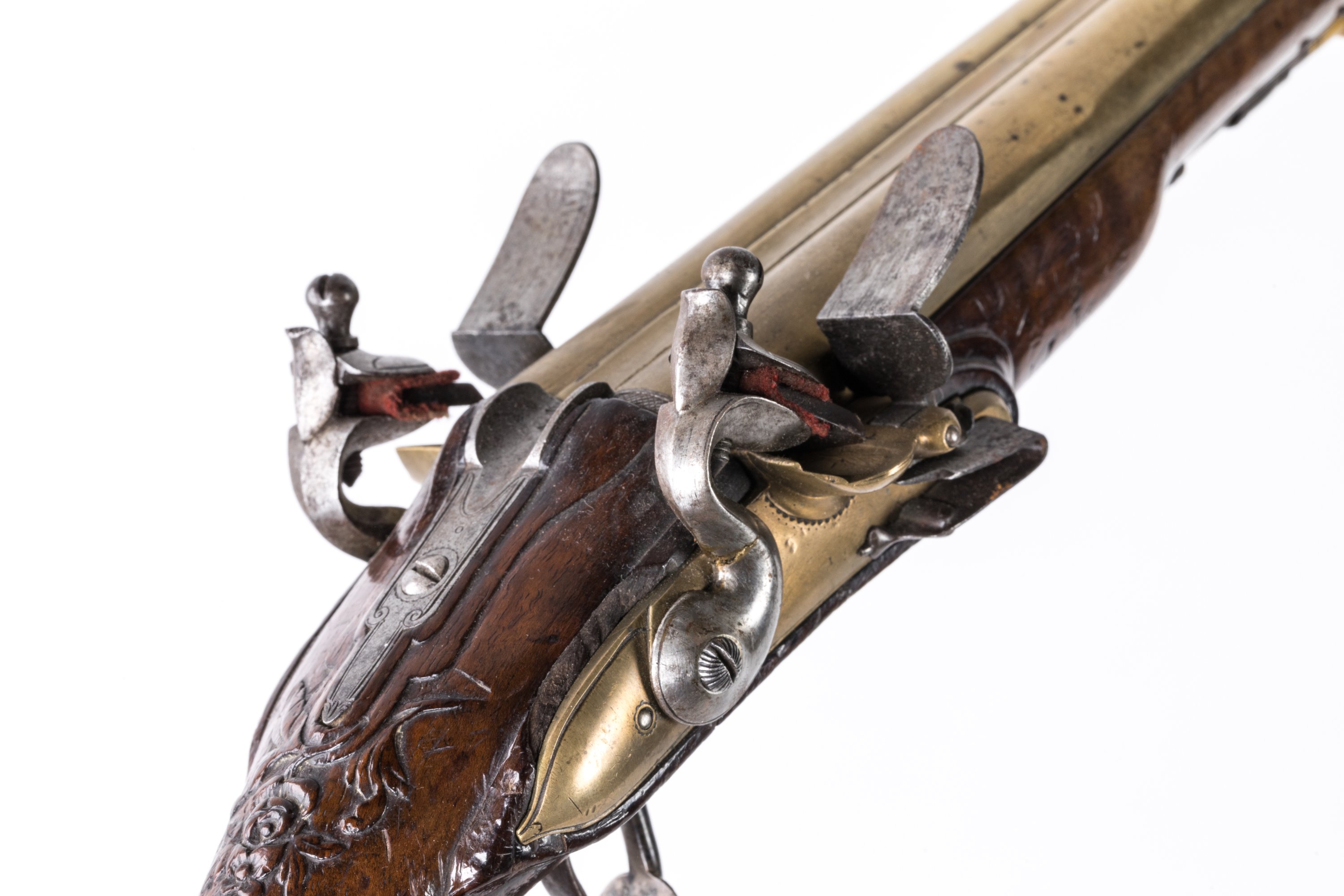 Canons juxtaposés, en laiton. Platines à corps ronds en bronze et chiens col de cygne en fer. Bassinet pare étincelle. Garnitures en argent ciselé et gravé de feuillages. Crosse en noyer sculpté verni.