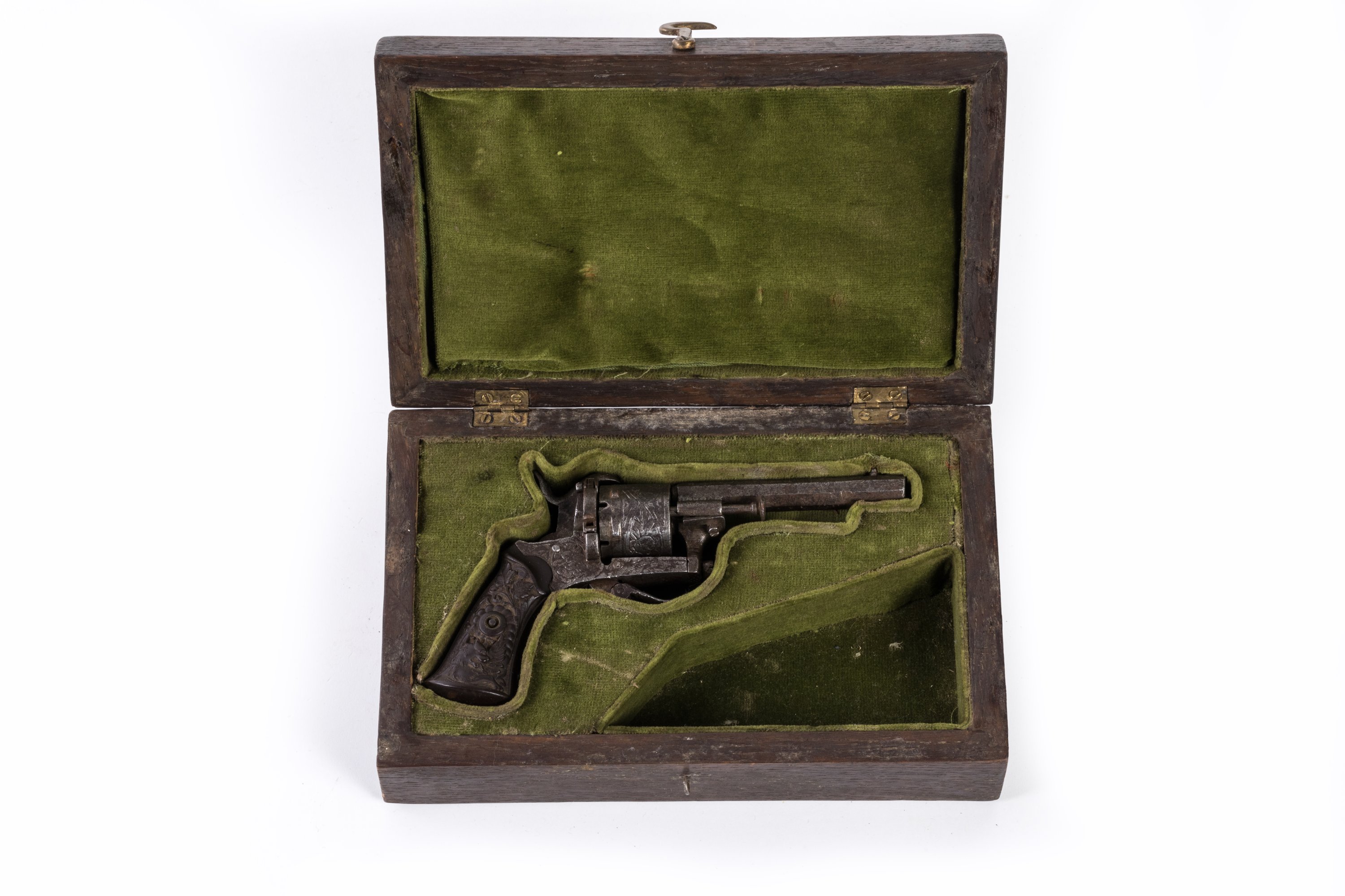 six coups, calibre 7 mm, à décor gravé sur le barillet de fleurs. La crosse à décor en bas-relief de griffon.
