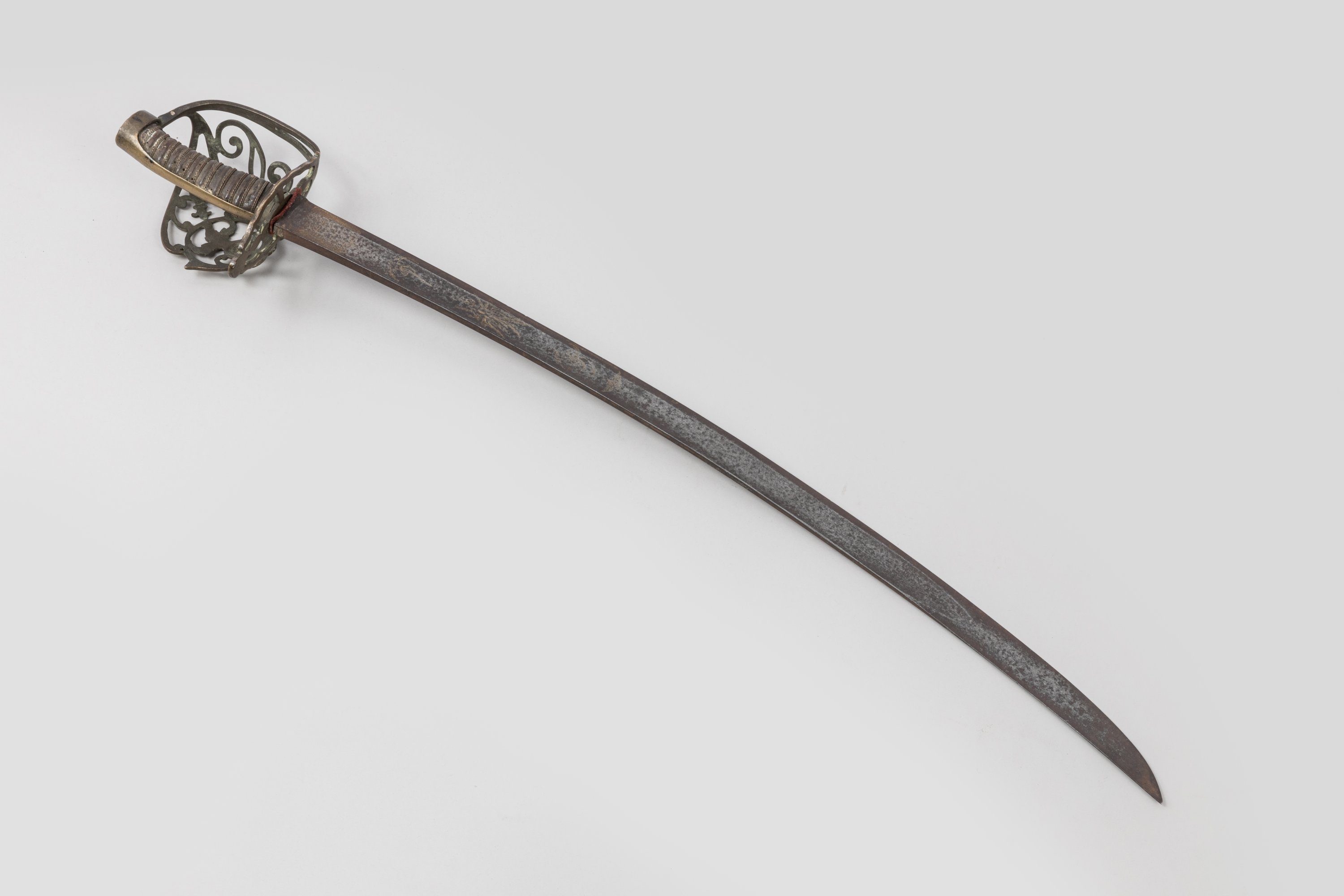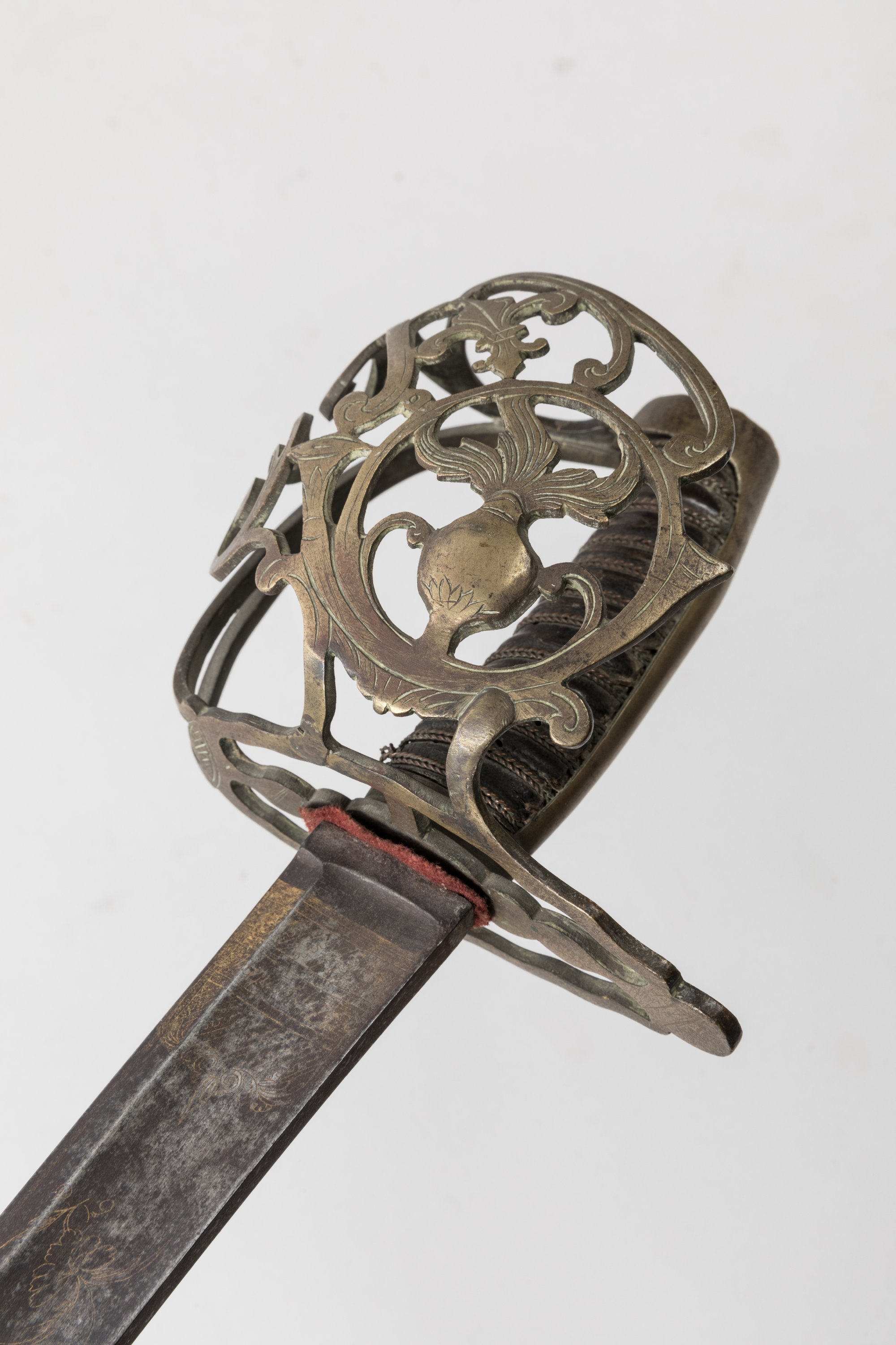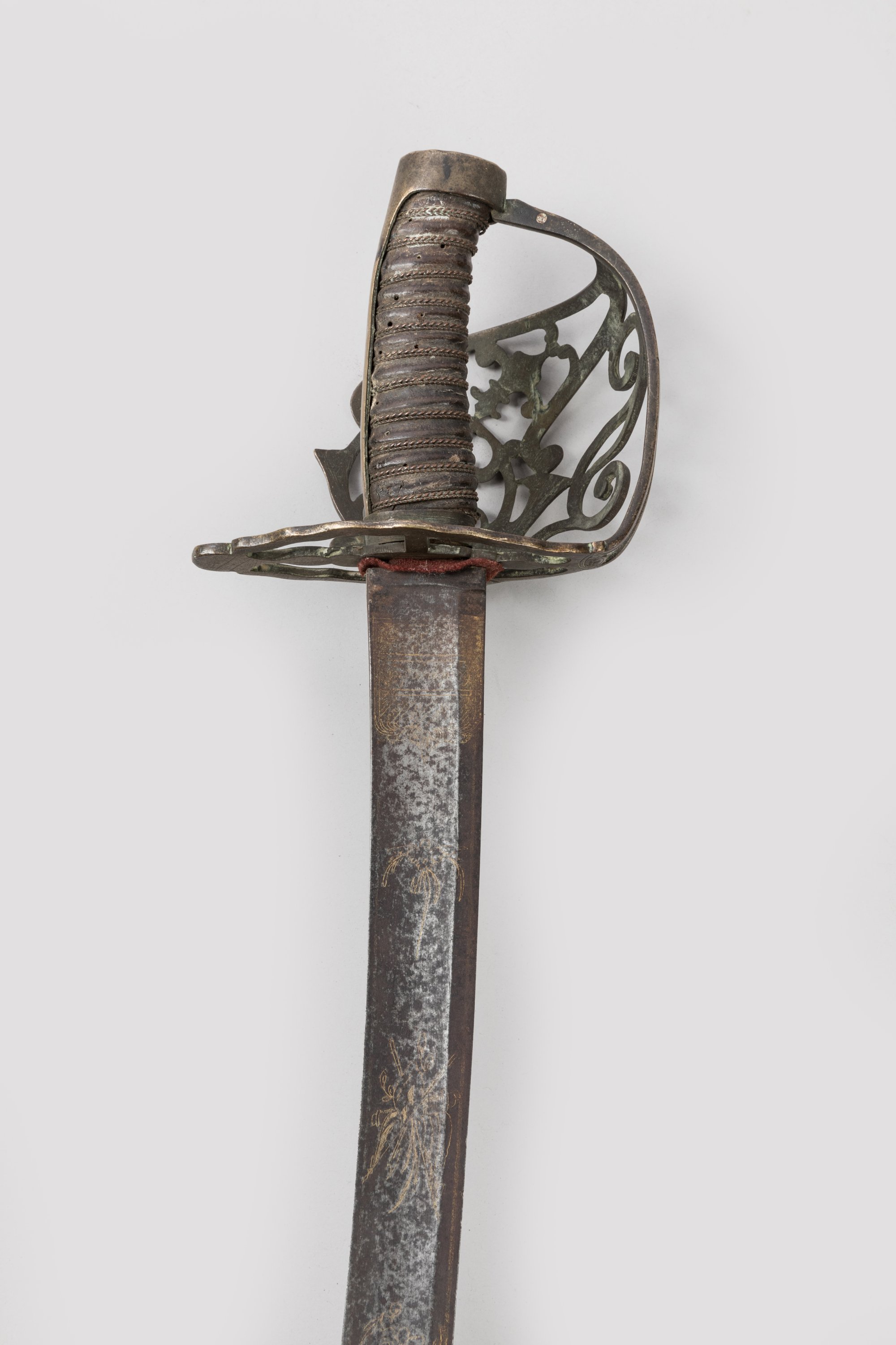 Poignée recouverte de cuir avec filigrane. Monture en laiton, calotte à longue queue, garde à une branche et coquille ajourée au cor, à la grenade et fleur de lys. Monté avec une lame de Coulaux à Klingenthal, à dos plat, gravée et dorée à décor de rinceaux et trophées d’armes.