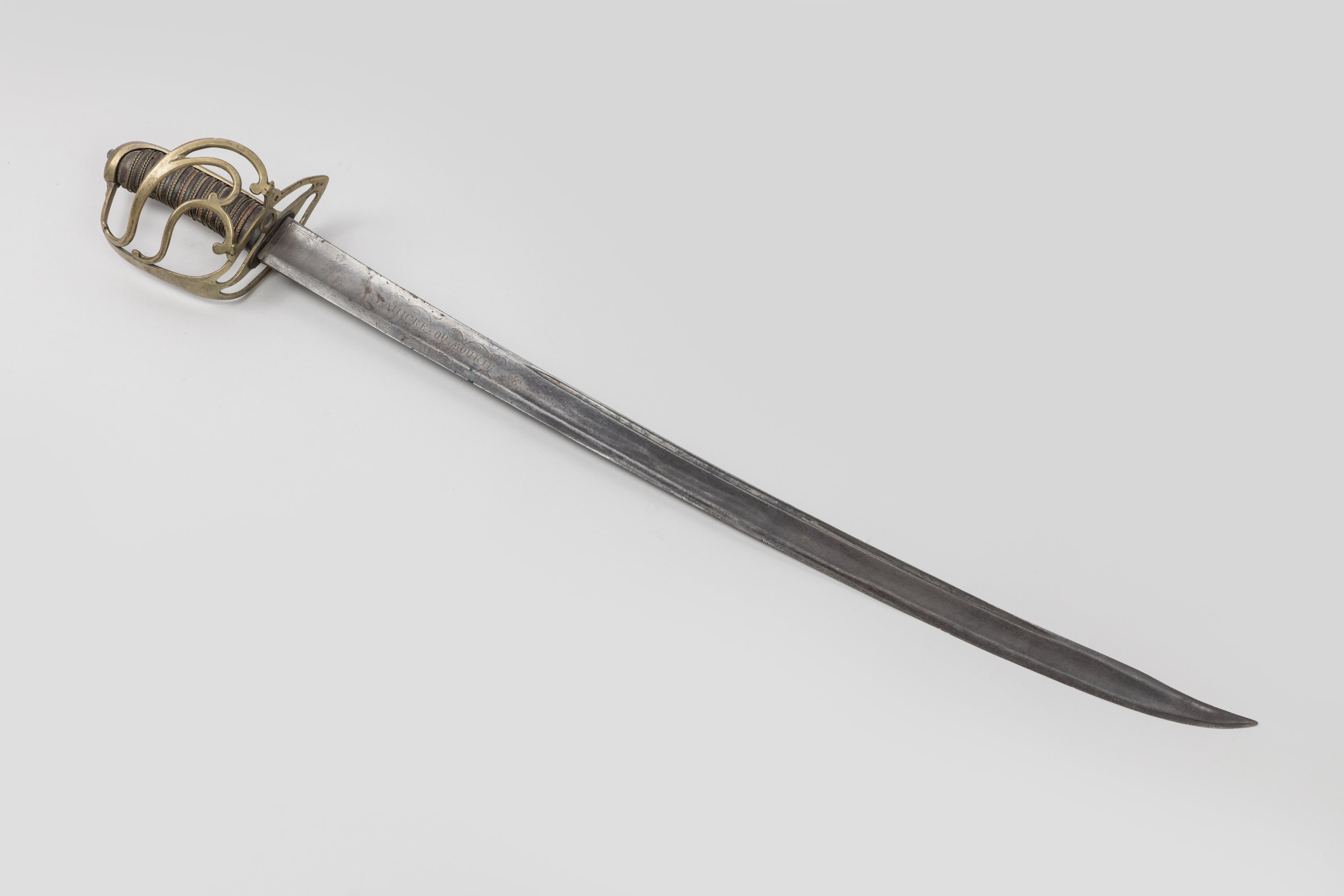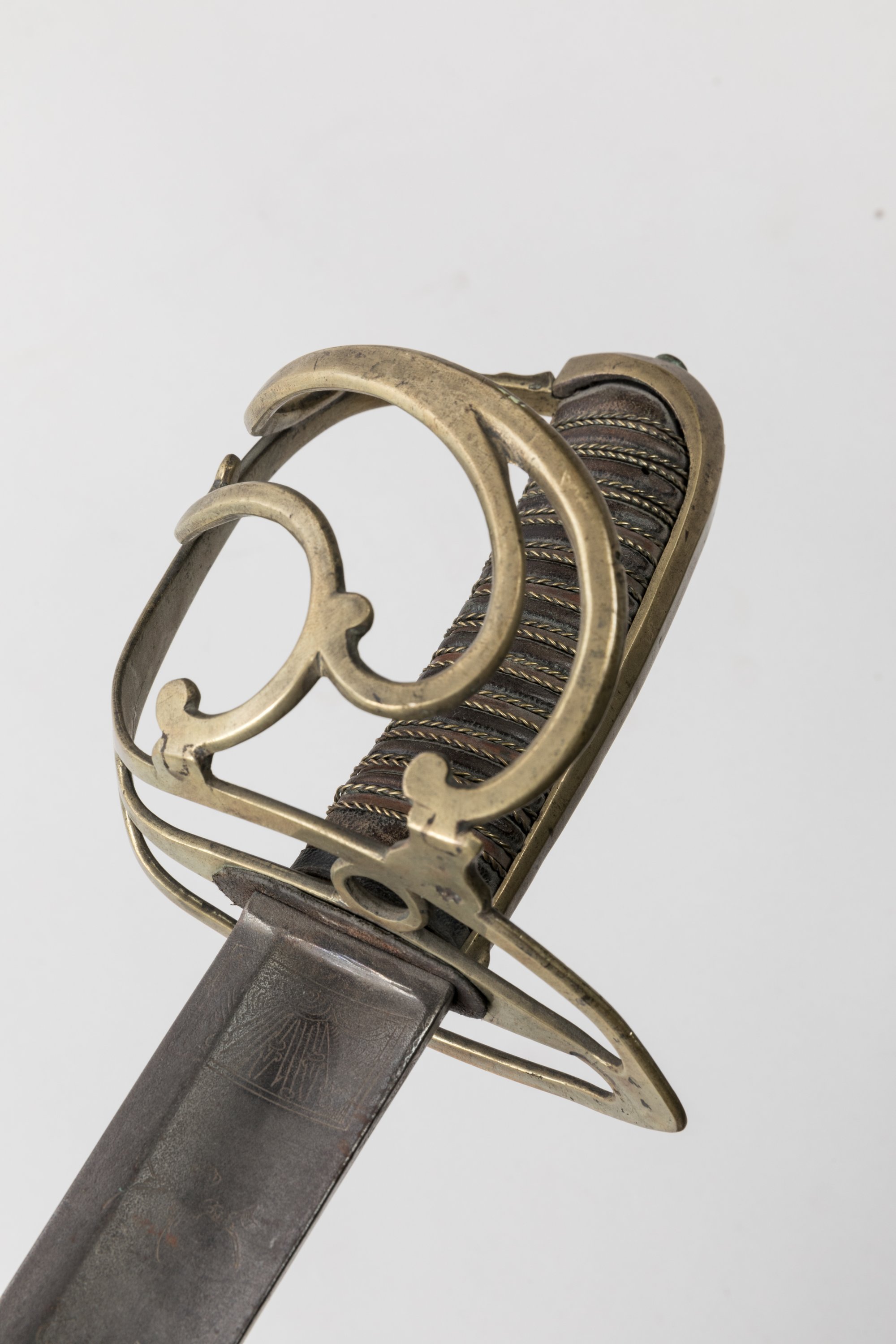 Poignée recouverte de cuir avec filigrane en laiton et lamé de cuivre. Monture en laiton, garde à une branche principale et deux secondaires. Plateau ajouré, poinçonné.