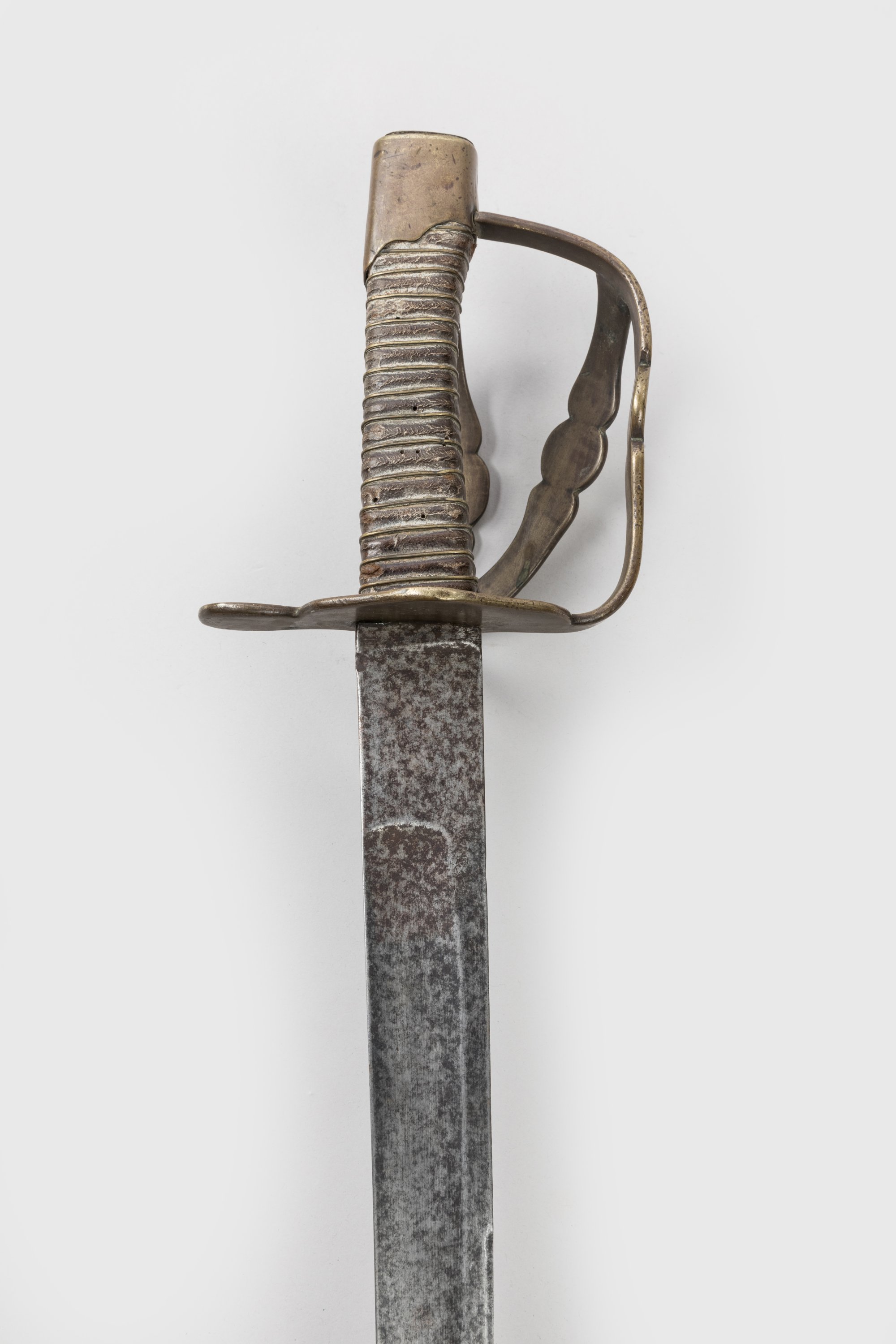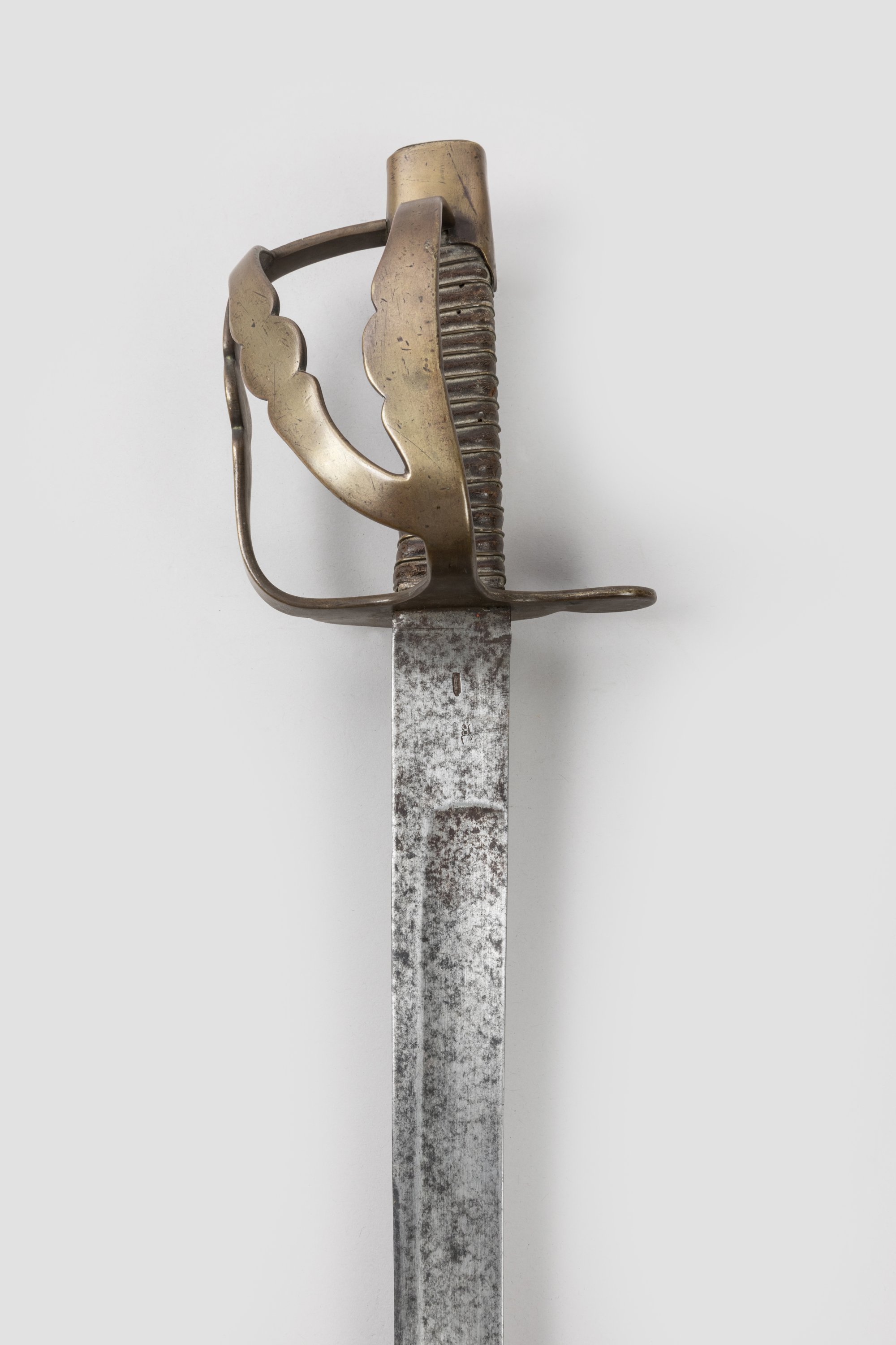 Poignée recouverte de cuir avec filigrane. Monture en laiton poinçonné au coq, garde à deux branches. Rivure en fer recouvrant la calotte. Quillon poinçonné « M ». Lame cintrée à dos plat, pans creux, poinçonnée au faisceau de licteur et « B » sous bonnet phrygien (Bisch).
